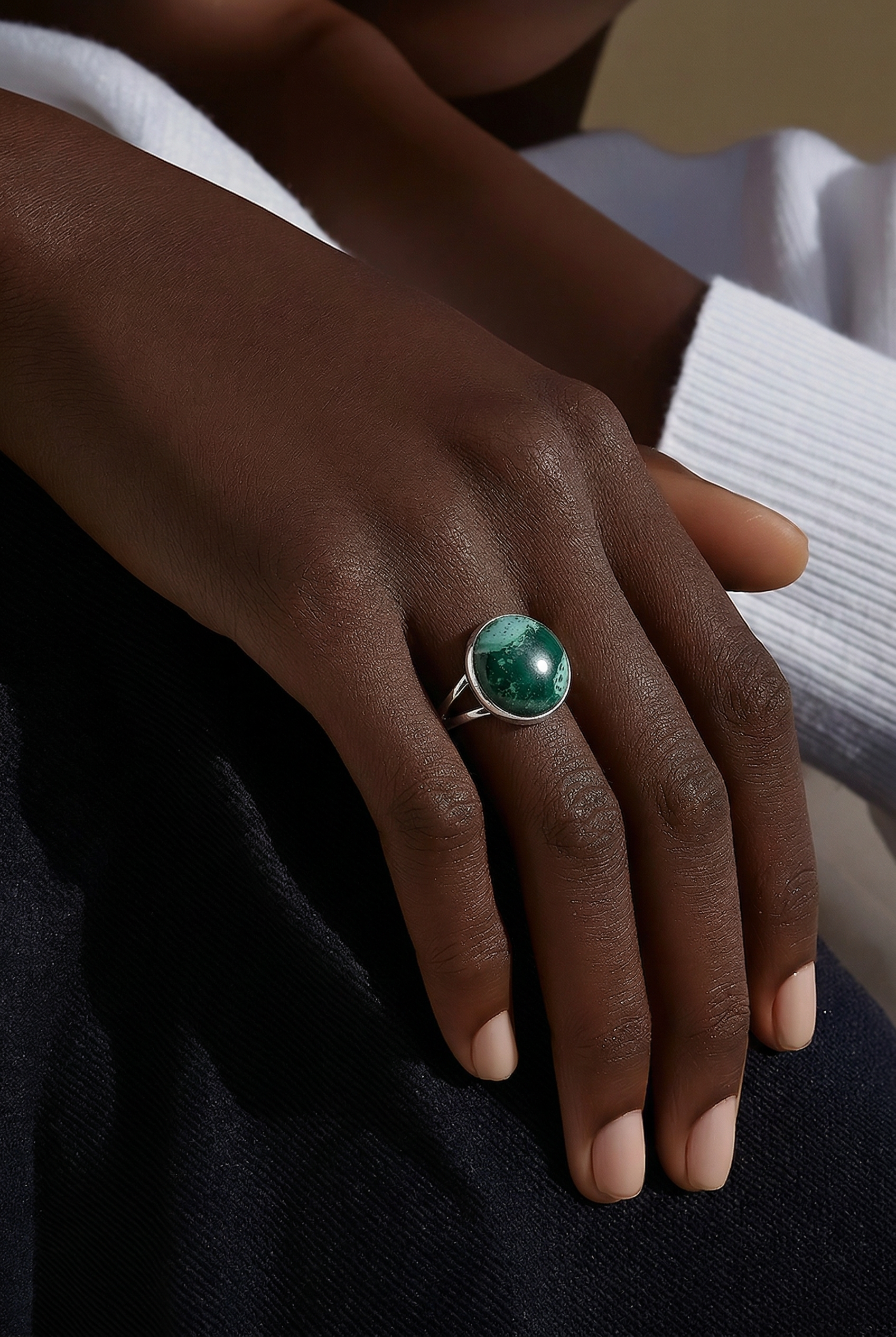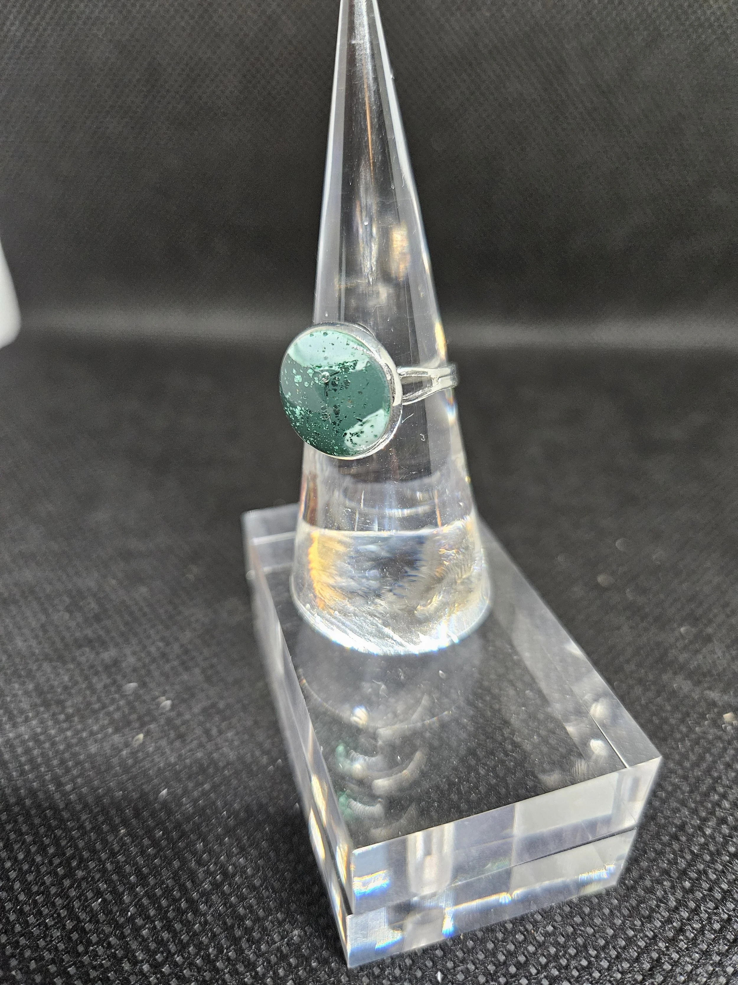 This adjustable ring features striking round green clay set in a polished silver-toned band, creating a piece that feels both earthy and elegant. The natural marbled pattern gives it a one‑of‑a‑kind character, with subtle variations in tone and texture that catch the light beautifully. Its glossy finish enhances the depth of the green, making it a standout accessory whether worn alone or paired with other jewellery.