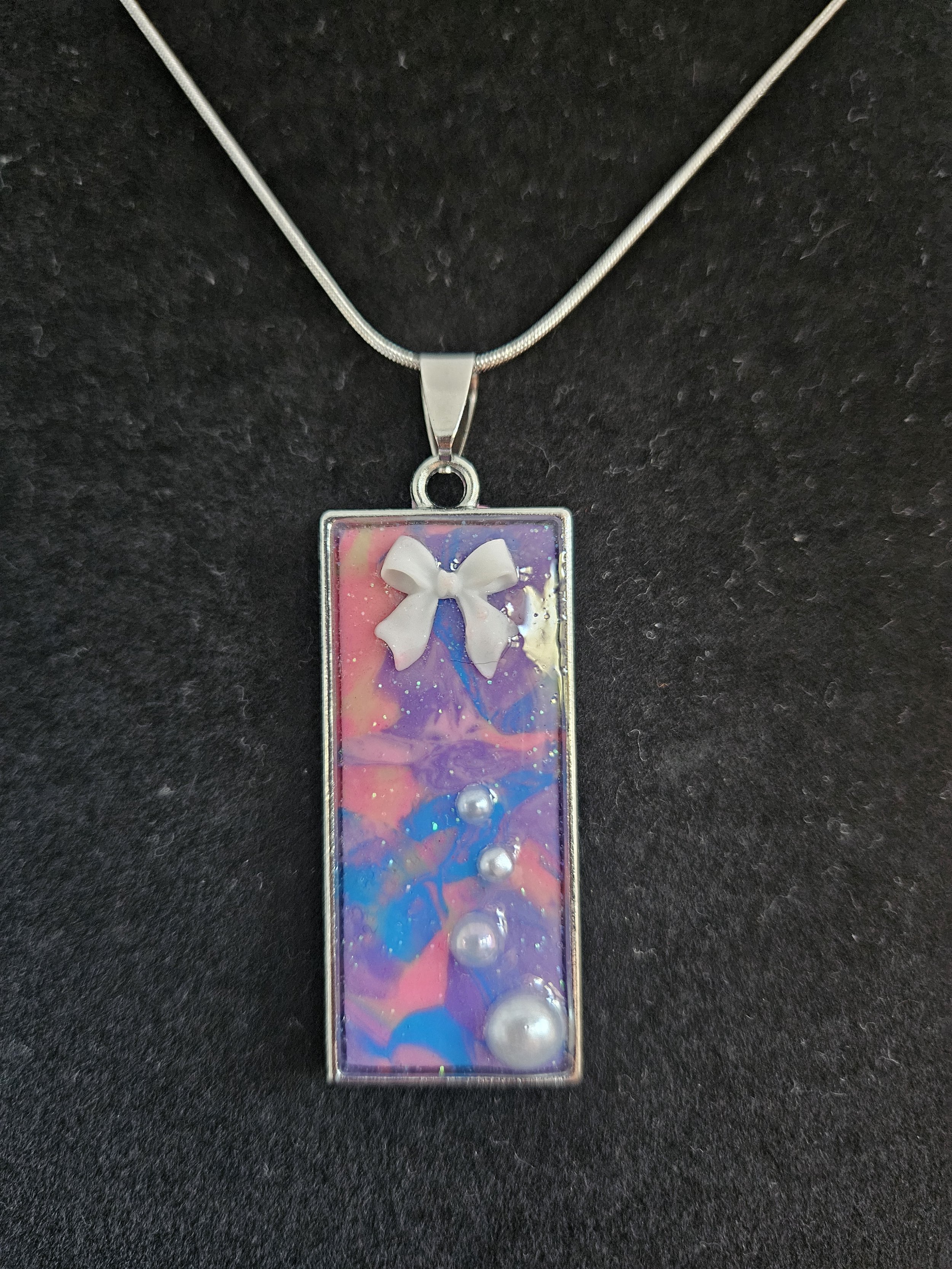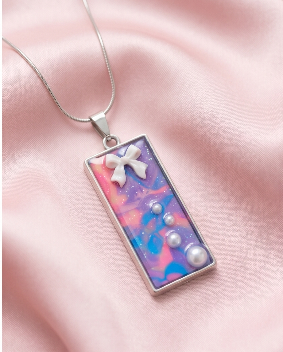 Embedded inside the resin are delicate white pearl‑style beads arranged in a soft diagonal trail, paired with a sweet white bow detail that adds a touch of whimsical elegance. The pendant is framed in a sleek silver‑tone bezel and hangs from a smooth silver snake chain for a polished, modern look.