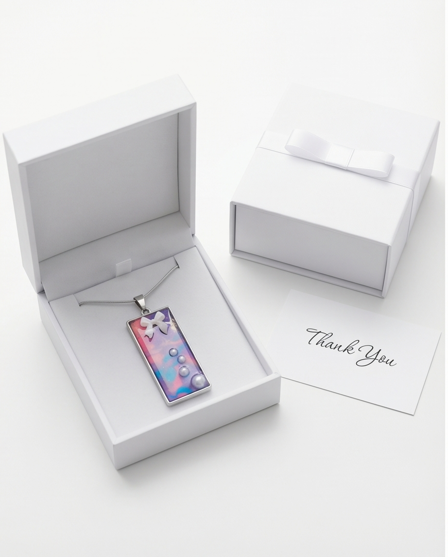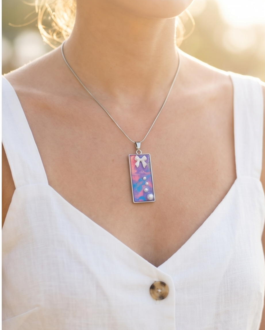 A dreamy blend of colour, texture, and handcrafted charm, this handmade pastel galaxy pendant necklace is designed to stand out. The rectangular resin pendant features a swirling marbled pattern in purple, pink, blue, and soft orange, creating a cosmic, painterly effect with a glossy glass‑like finish.