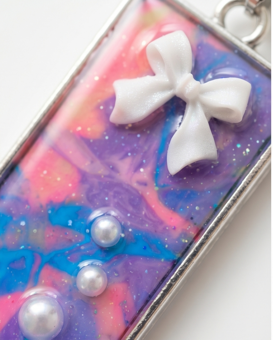 - Embedded pearl‑style beads & white bow charm