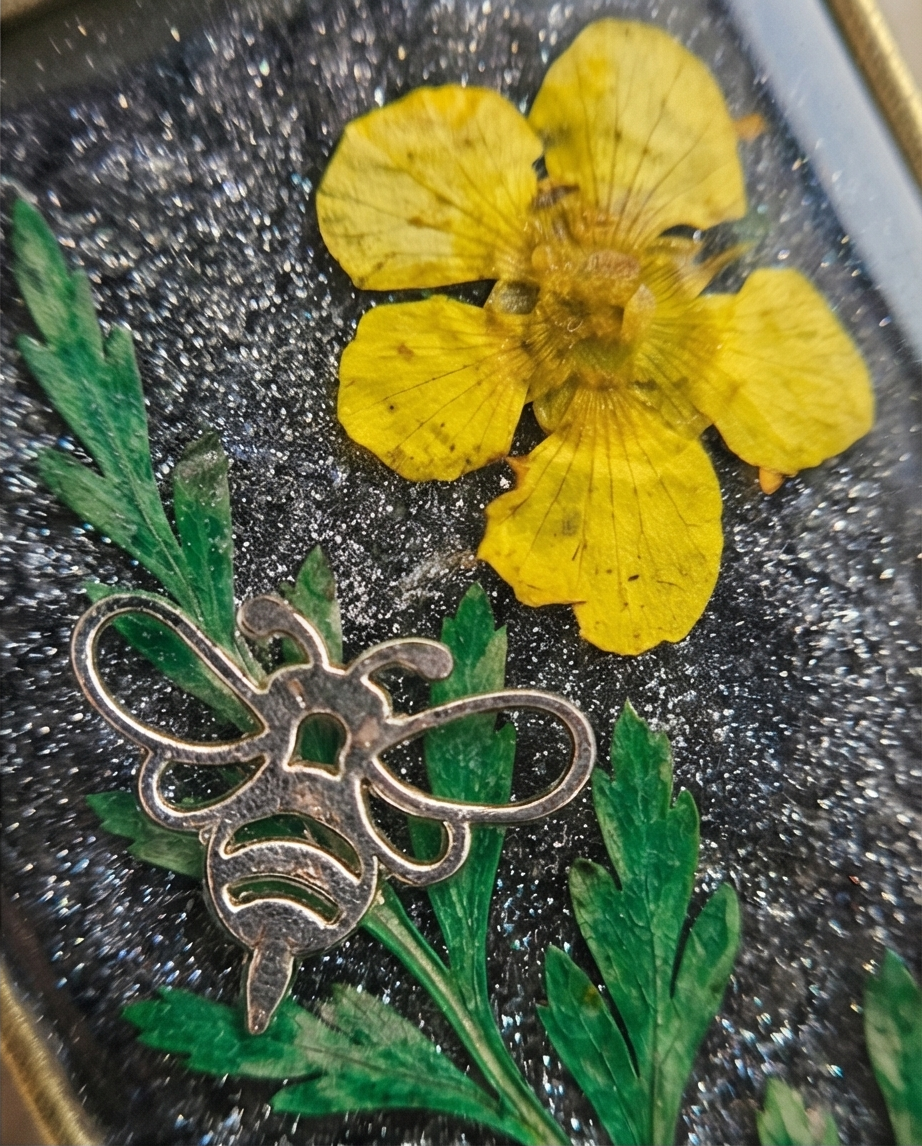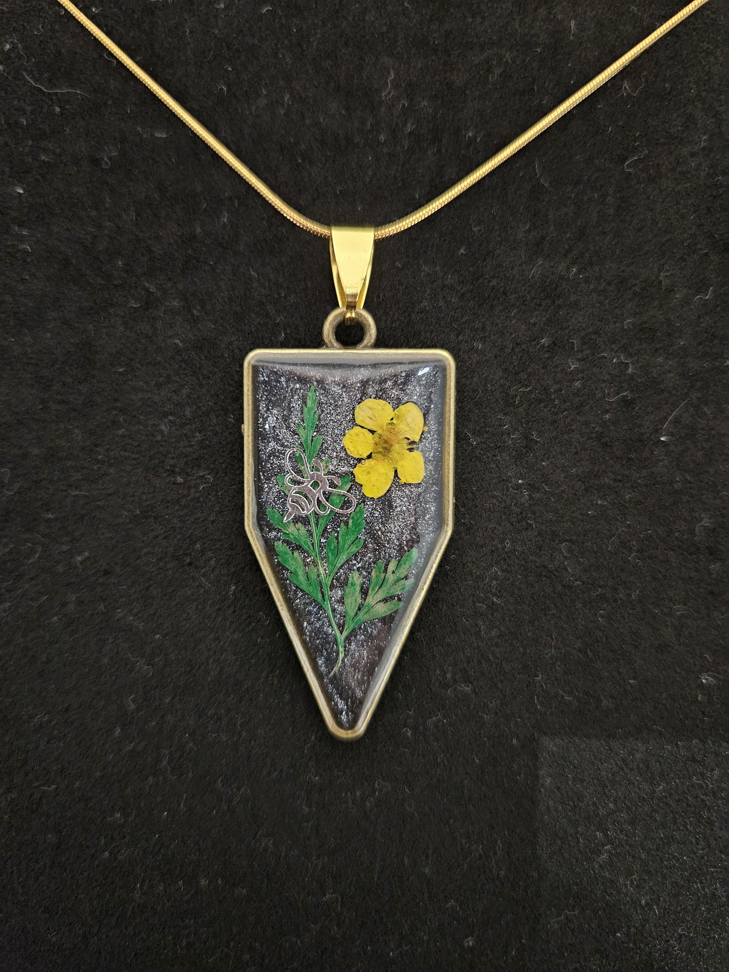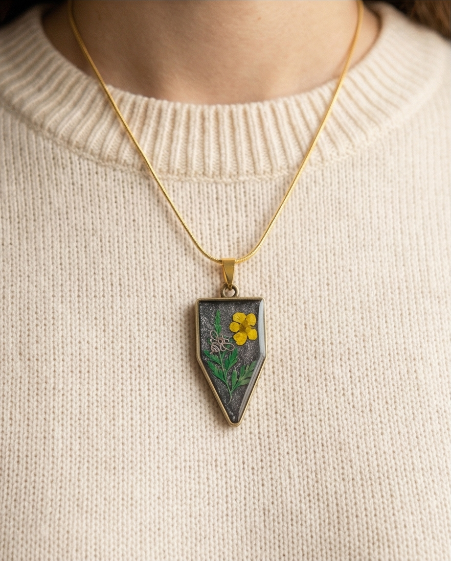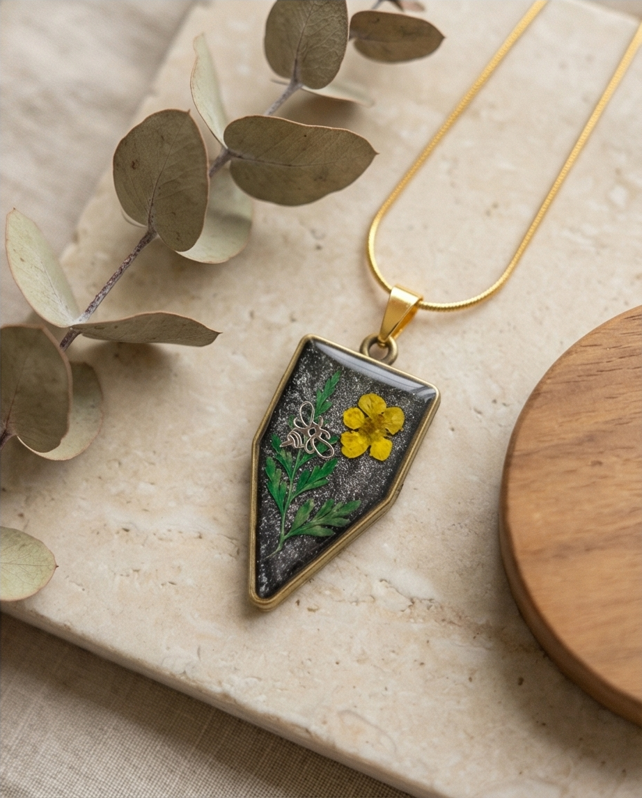 Celebrate the beauty of nature with this handmade Pressed Flower Bee Pendant Necklace, a delicate blend of real botanical elements and shimmering resin artistry. Set inside a modern gold geometric frame, a vibrant yellow flower and tiny green leaves rest against a dark, glitter‑speckled background, creating a miniature garden scene you can wear.
