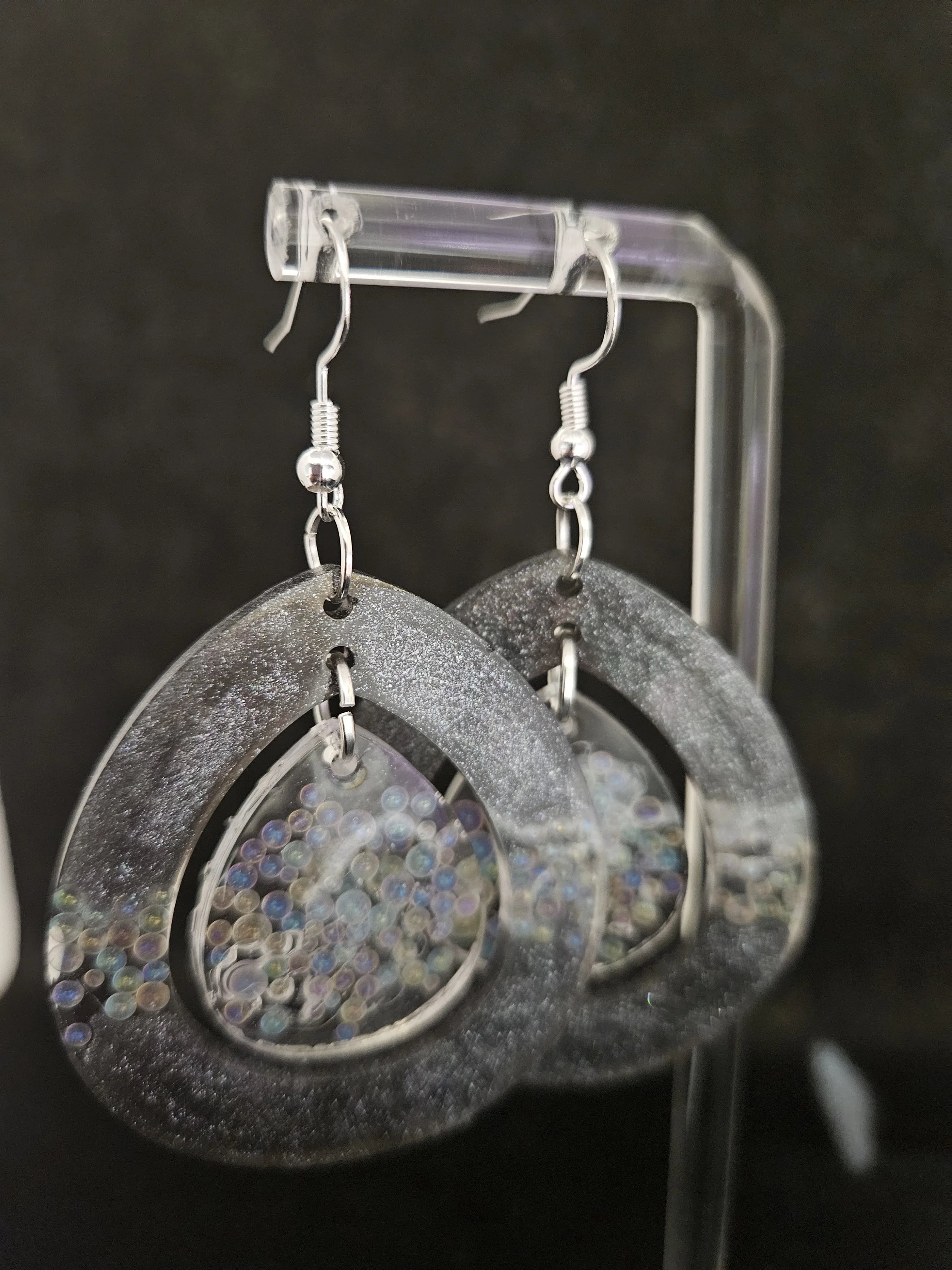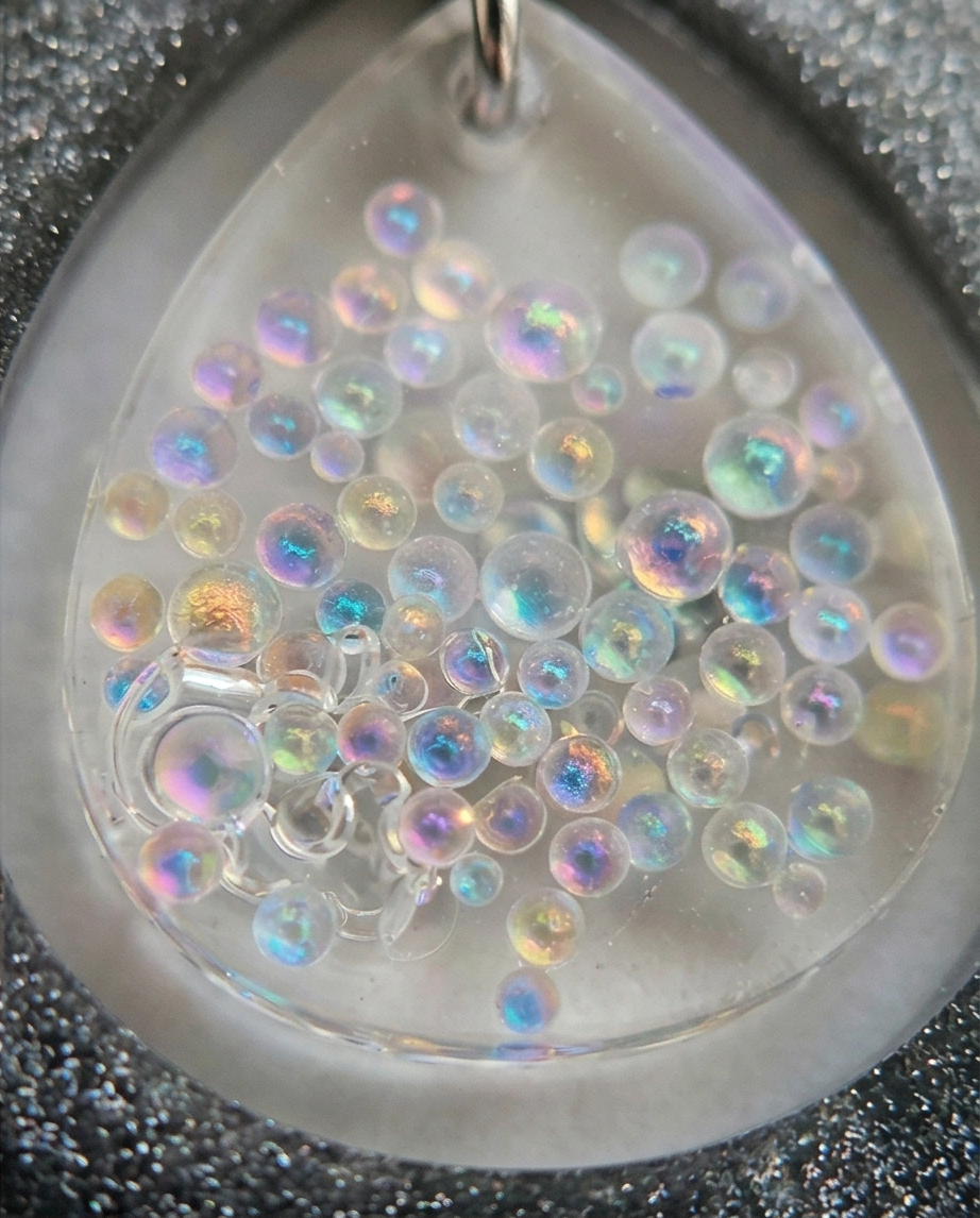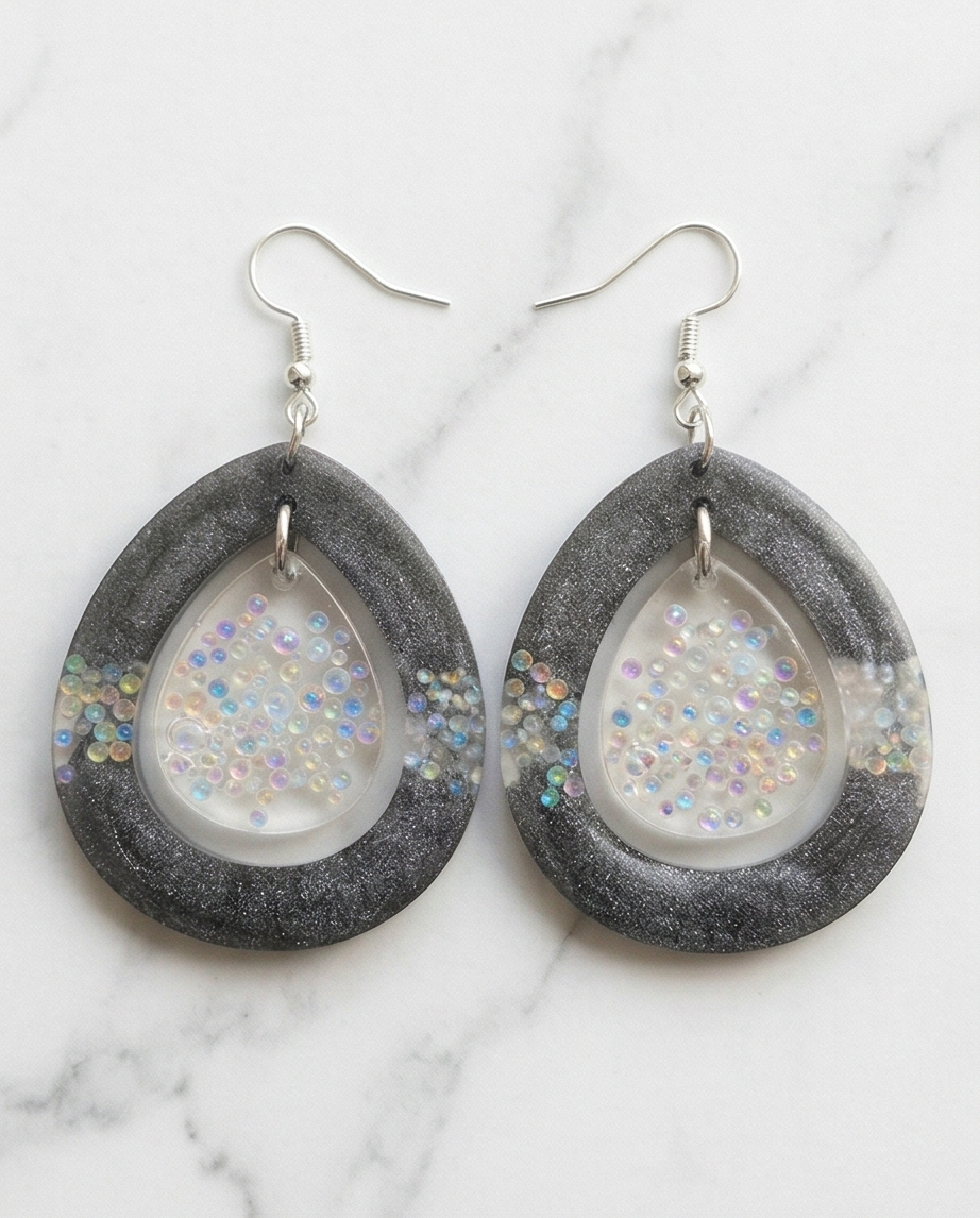 These Iridescent Teardrop Dangle Earrings combine modern sparkle with handcrafted charm. Each earring features a shimmering silver outer teardrop paired with a translucent inner drop filled with tiny iridescent “bubbles” that catch the light in pink, blue, green, and gold tones. The layered design creates beautiful depth and movement, making them perfect for both everyday wear and special occasions.