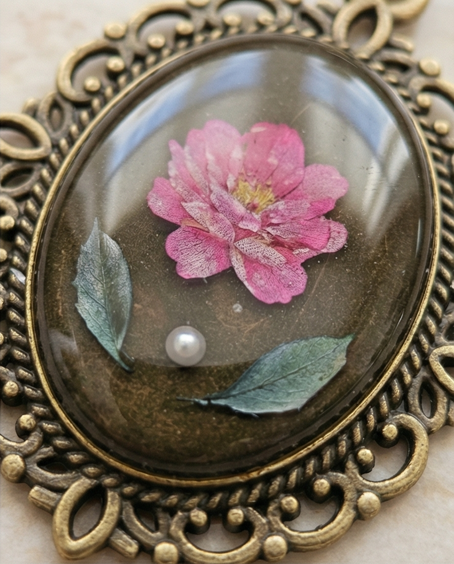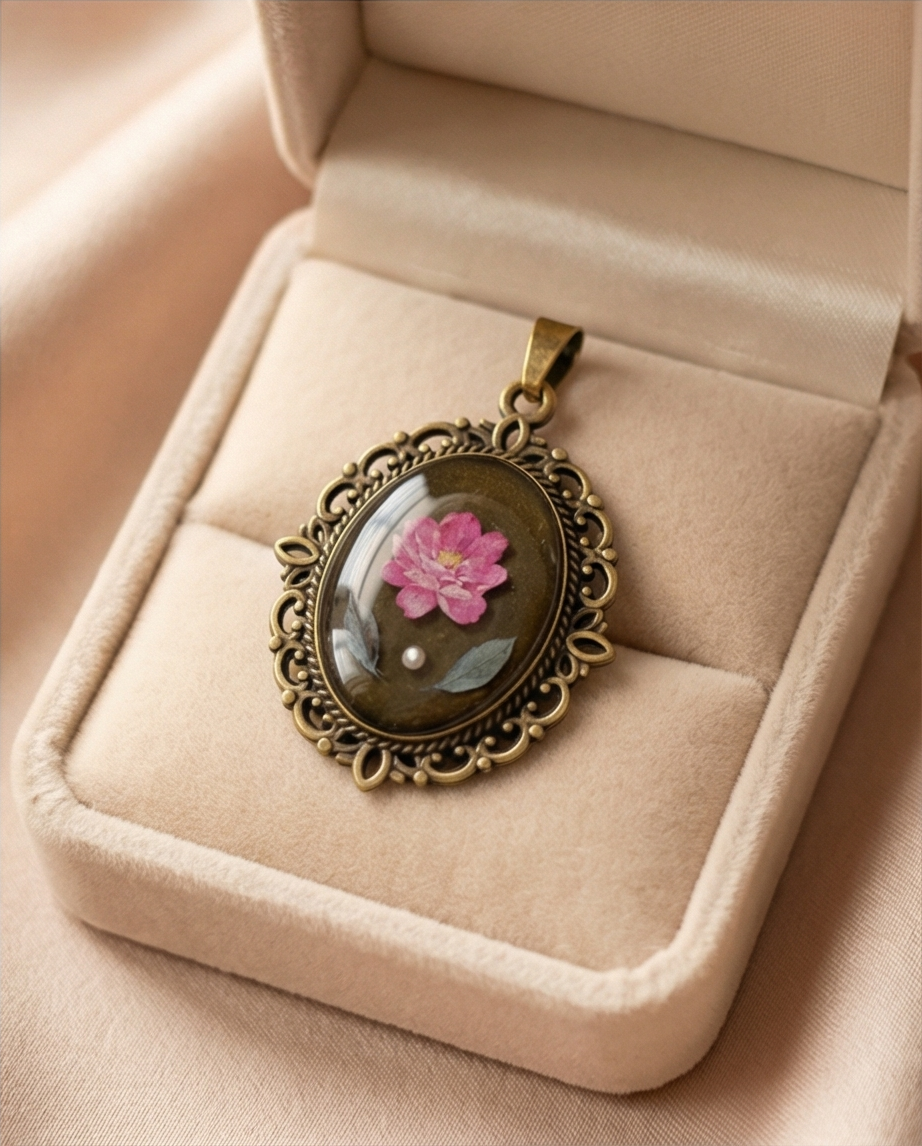 Each pendant is handcrafted with care, showcasing a delicate pink bloom, soft green leaves, and a subtle pearl accent resting on a deep, earthy background. The result is a romantic, one‑of‑a‑kind piece that feels both nostalgic and effortlessly wearable