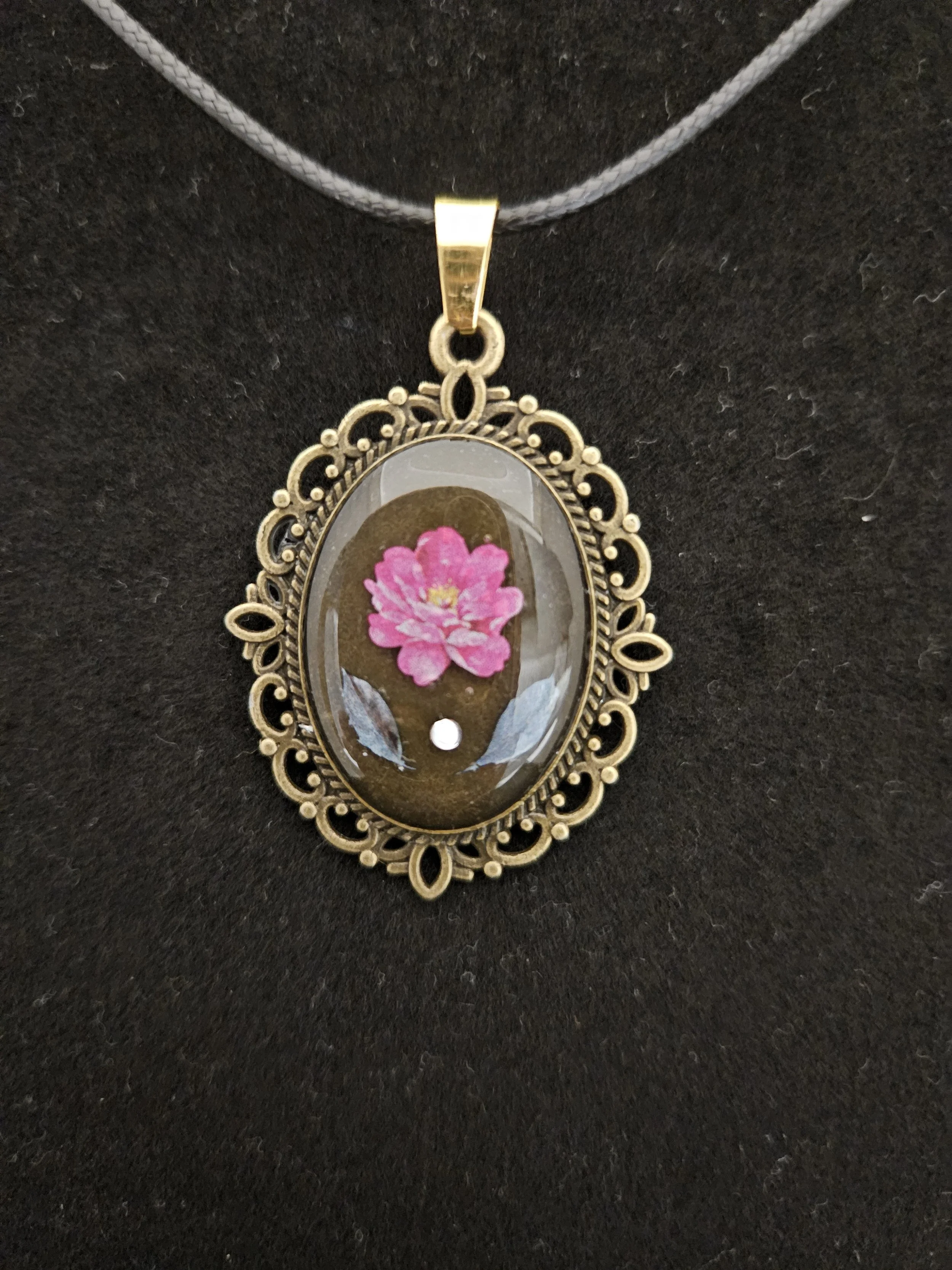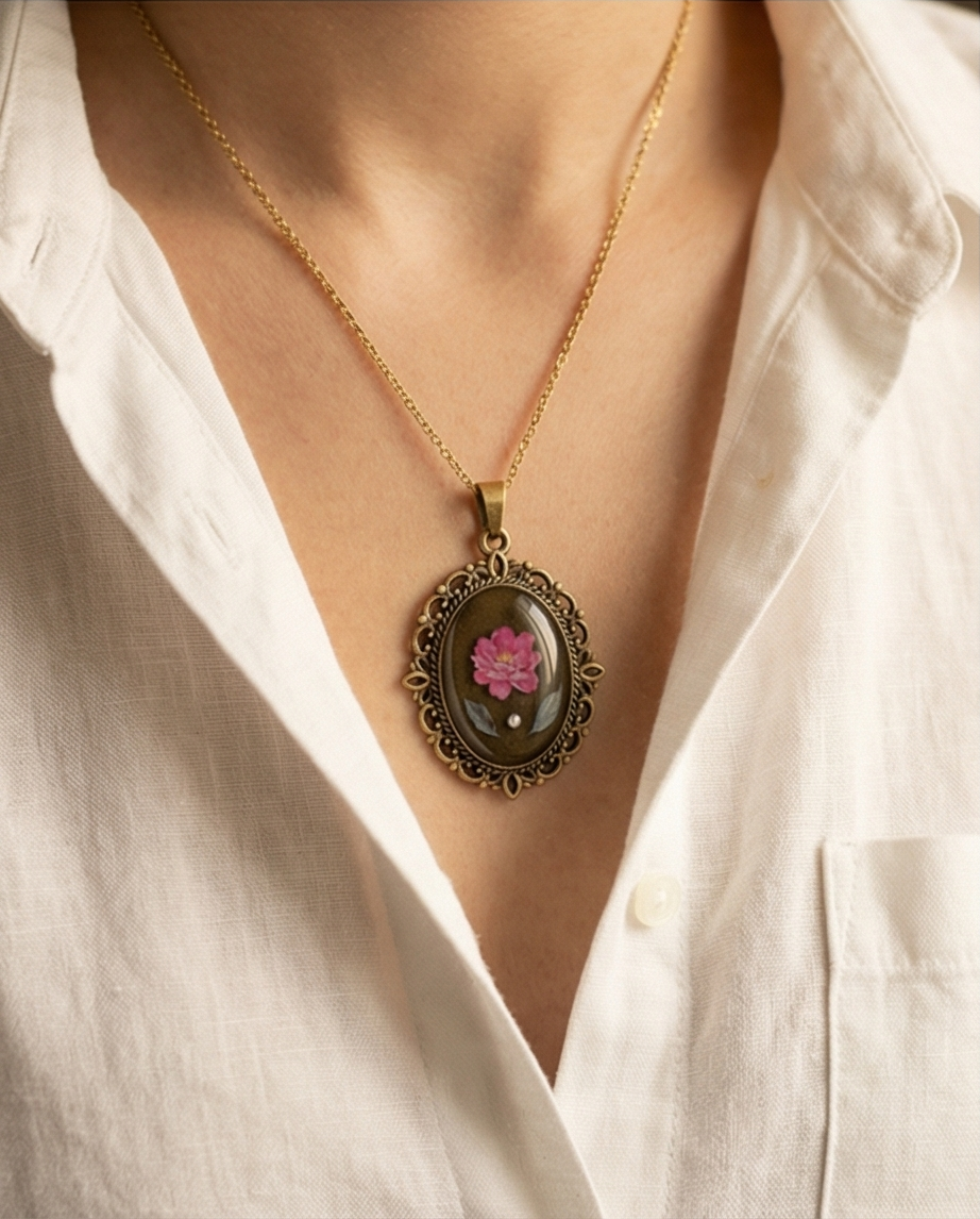 Bring a touch of timeless elegance to your everyday style with this Vintage Floral Oval Pendant Necklace, featuring a real pressed pink flower preserved beneath a glossy glass dome. Set within an antique gold filigree frame, this necklace blends natural beauty with classic Victorian-inspired charm.