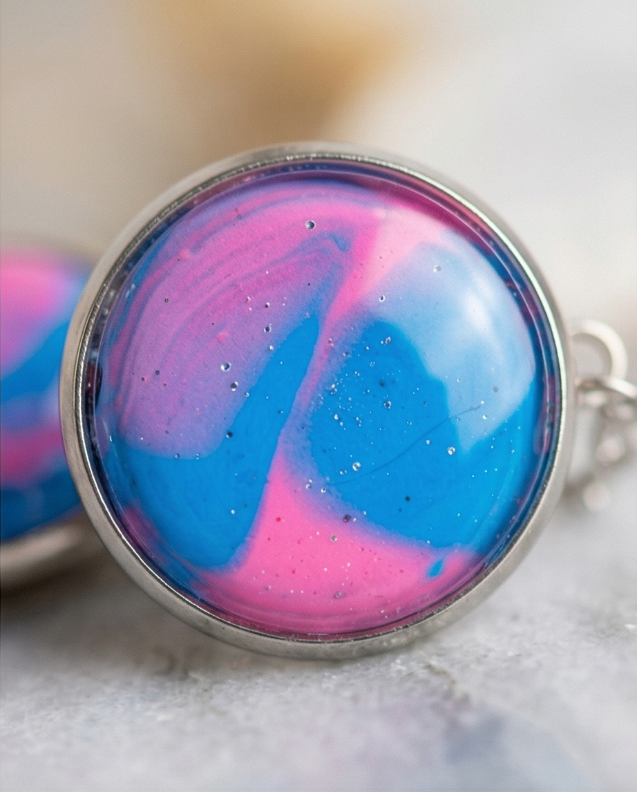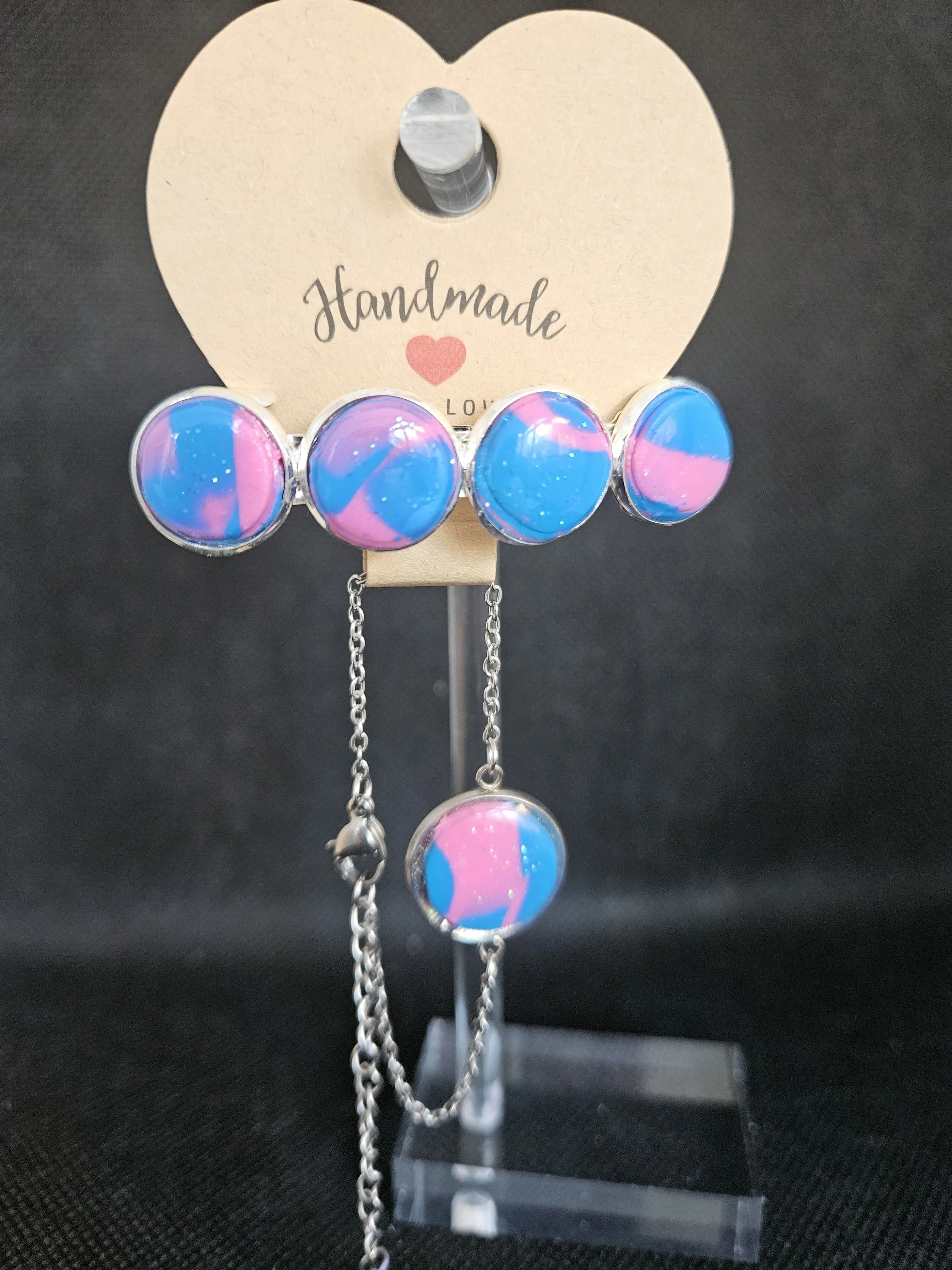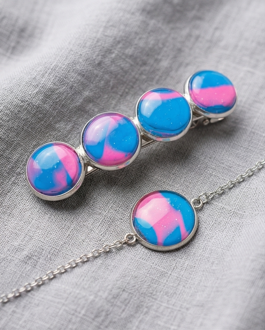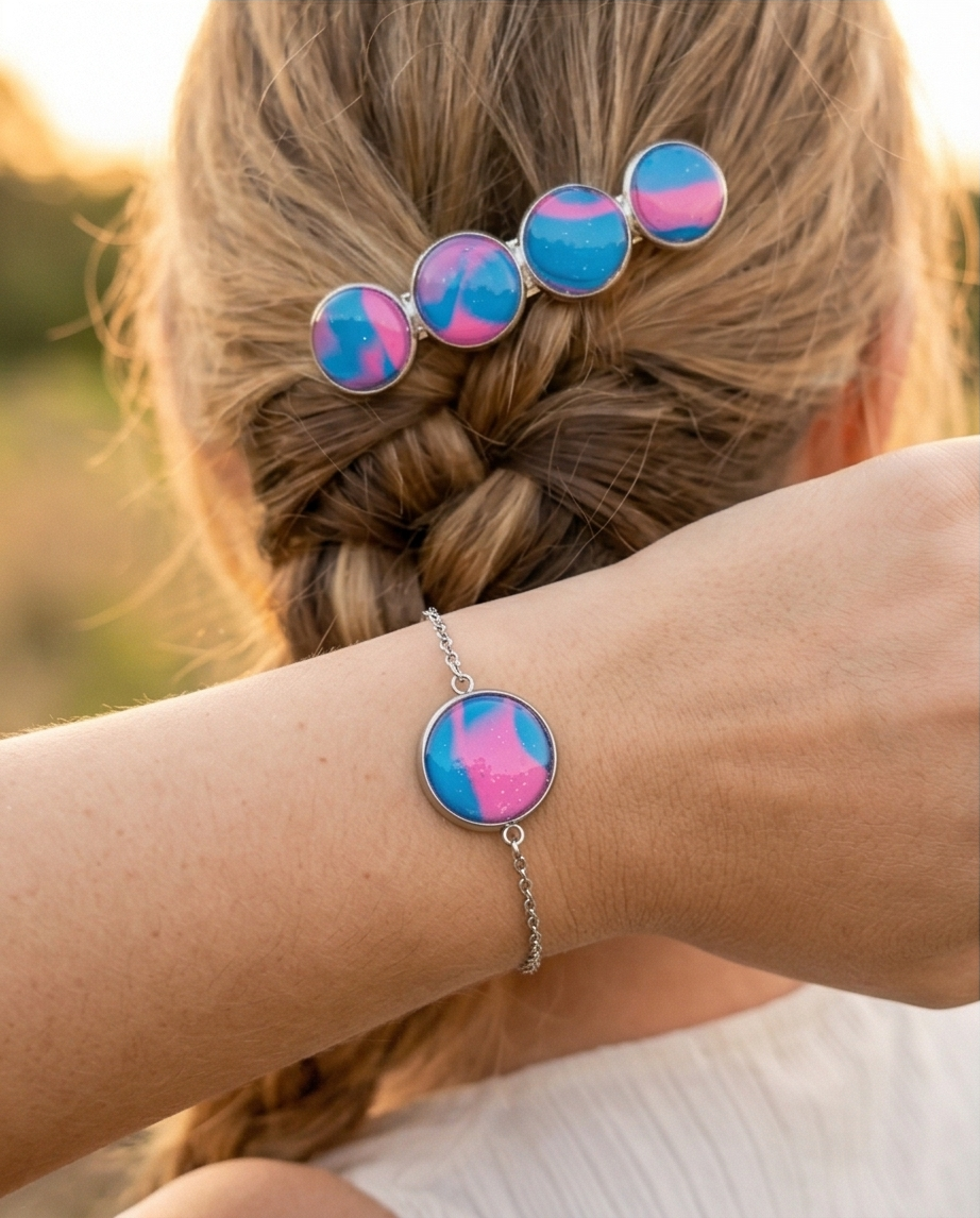 Elevate your everyday style with this handmade bracelet and hair clip set, featuring glossy blue and pink marbled cabochons that shimmer with subtle sparkles. Each piece is crafted by hand, giving the set a unique, artistic finish that feels both modern and magical.