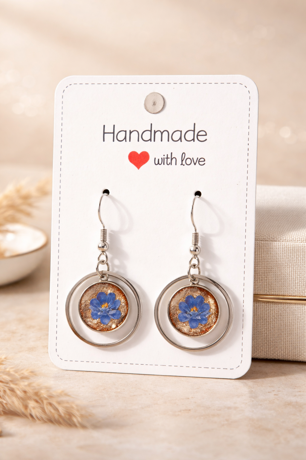 These handmade earrings feature a realistic printed blue flower preserved beneath a clear, glossy dome, its yellow centre glowing gently against a subtle shimmer. The bloom sits inside a smooth metallic ring, creating a clean circular silhouette that feels both natural and contemporary. The hook-style fastening adds light movement, letting the flower catch the light as you turn.