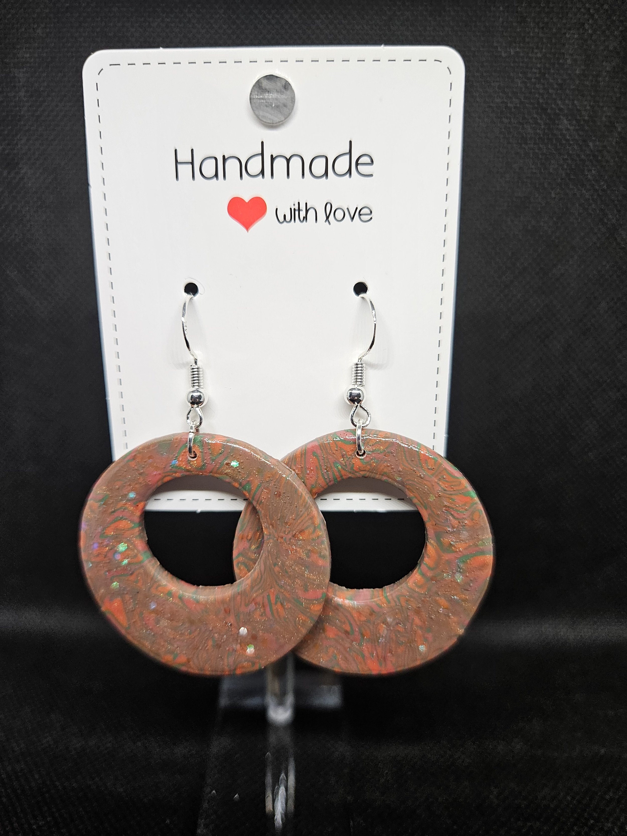 These handmade marbled hoop earrings bring together earthy warmth and subtle sparkle in a beautifully balanced design. Each pair features a donut‑shaped circle with a hollow centre, crafted in rich tones of brown, orange, and soft green, blended into a unique marbled pattern. A touch of glitter catches the light, adding a gentle shimmer without overpowering the natural palette.