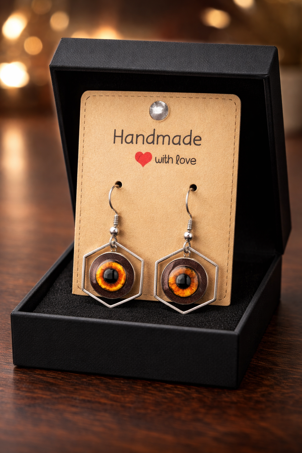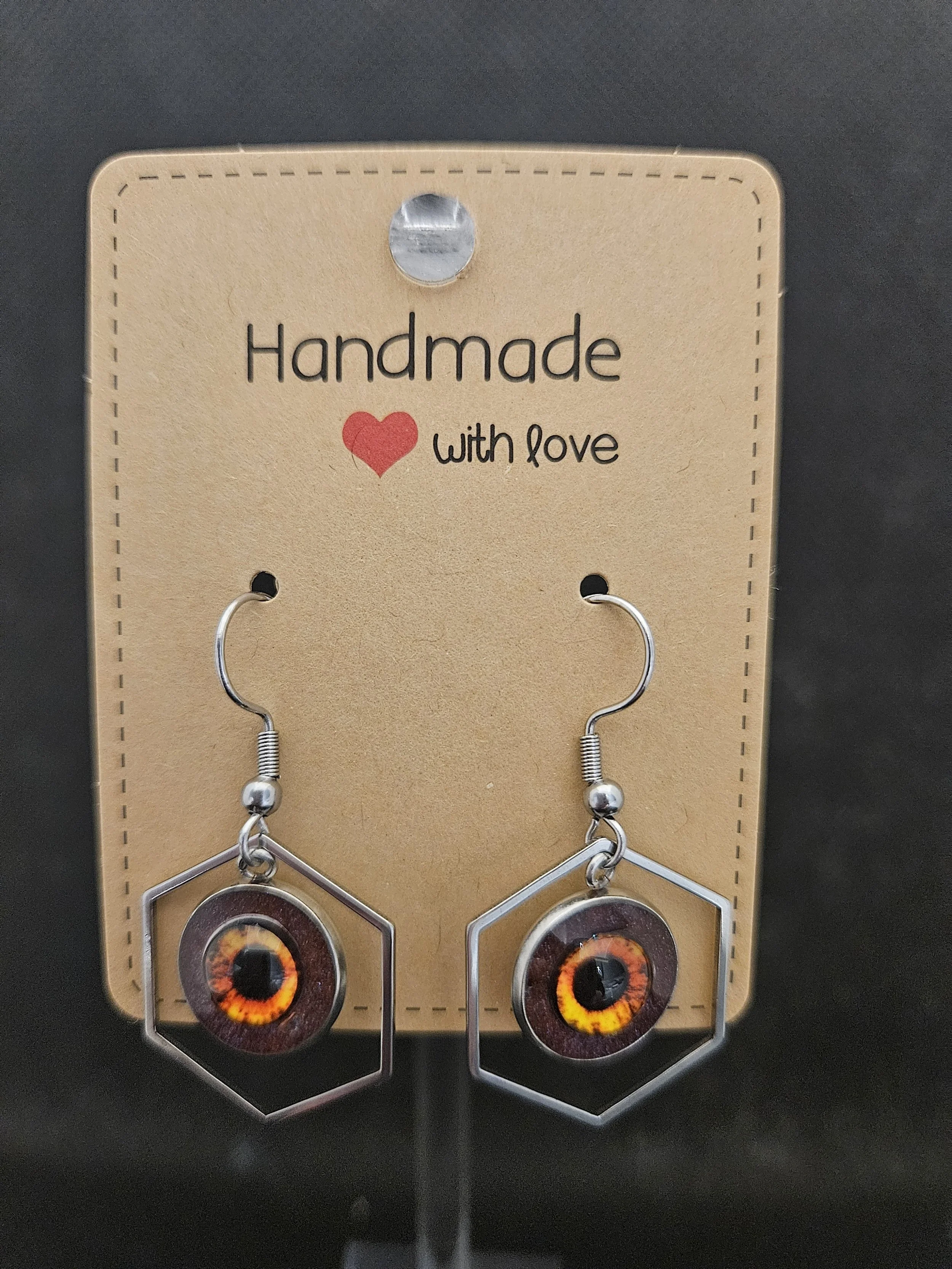 These handmade earrings feature a bold hexagonal frame that holds a circular “eye” design glowing in molten shades of orange, gold, and deep black. The centre has a glossy, dimensional finish that makes the colours shift like embers when they catch the light, giving the eye a powerful, watchful presence. The geometric frame adds structure and contrast, creating a striking balance between sharp lines and organic, swirling colour. Lightweight hooks complete the design, making them comfortable enough for everyday wear while still delivering dramatic impact.