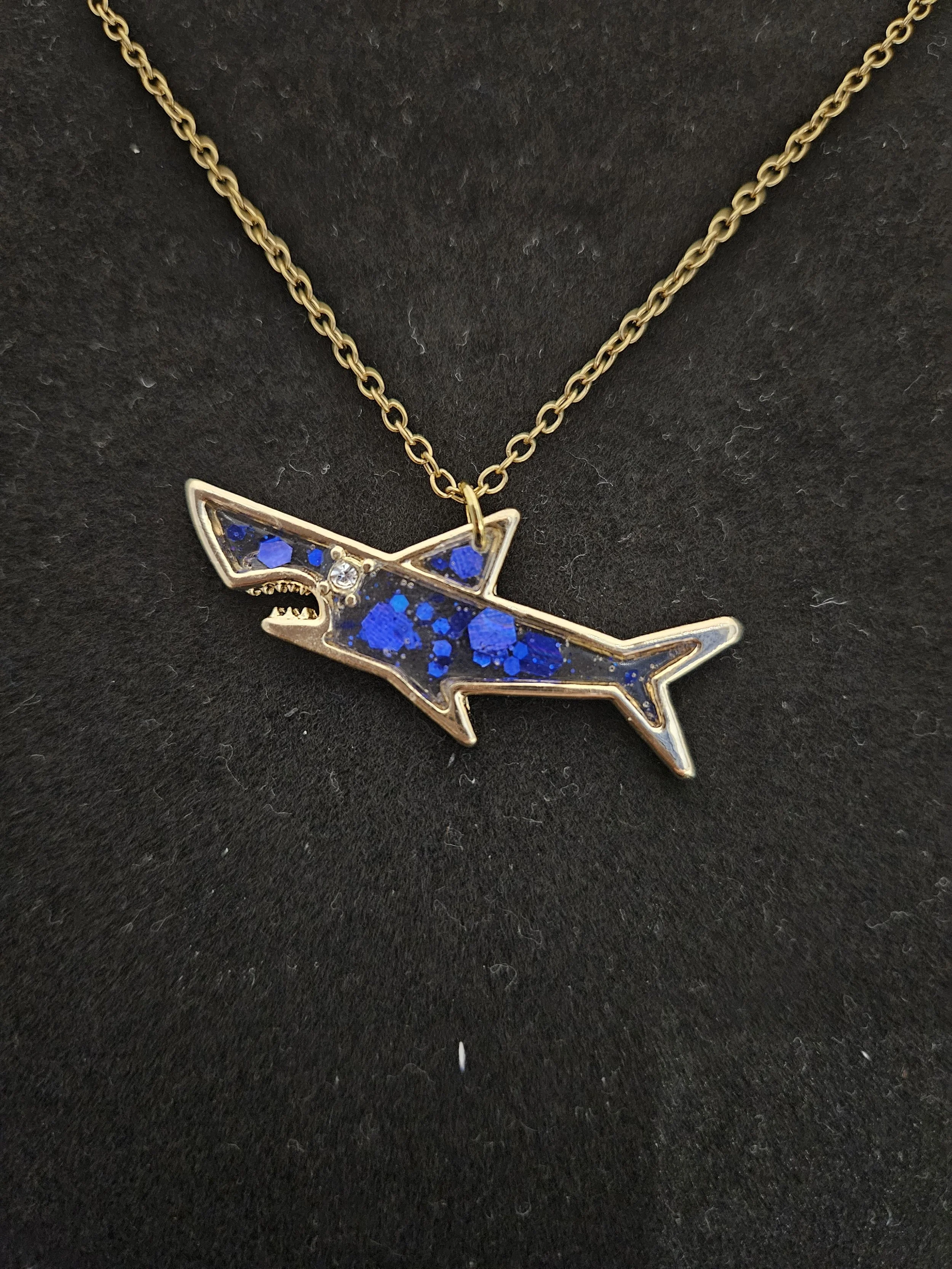 Dive into bold, ocean‑inspired style with this stunning gold shark pendant necklace, featuring a vibrant blue glitter resin inlay that shimmers like sunlight on the sea. The sleek shark silhouette is beautifully detailed, with a sparkling blue body and a tiny gemstone eye that adds a touch of luxury and personality.