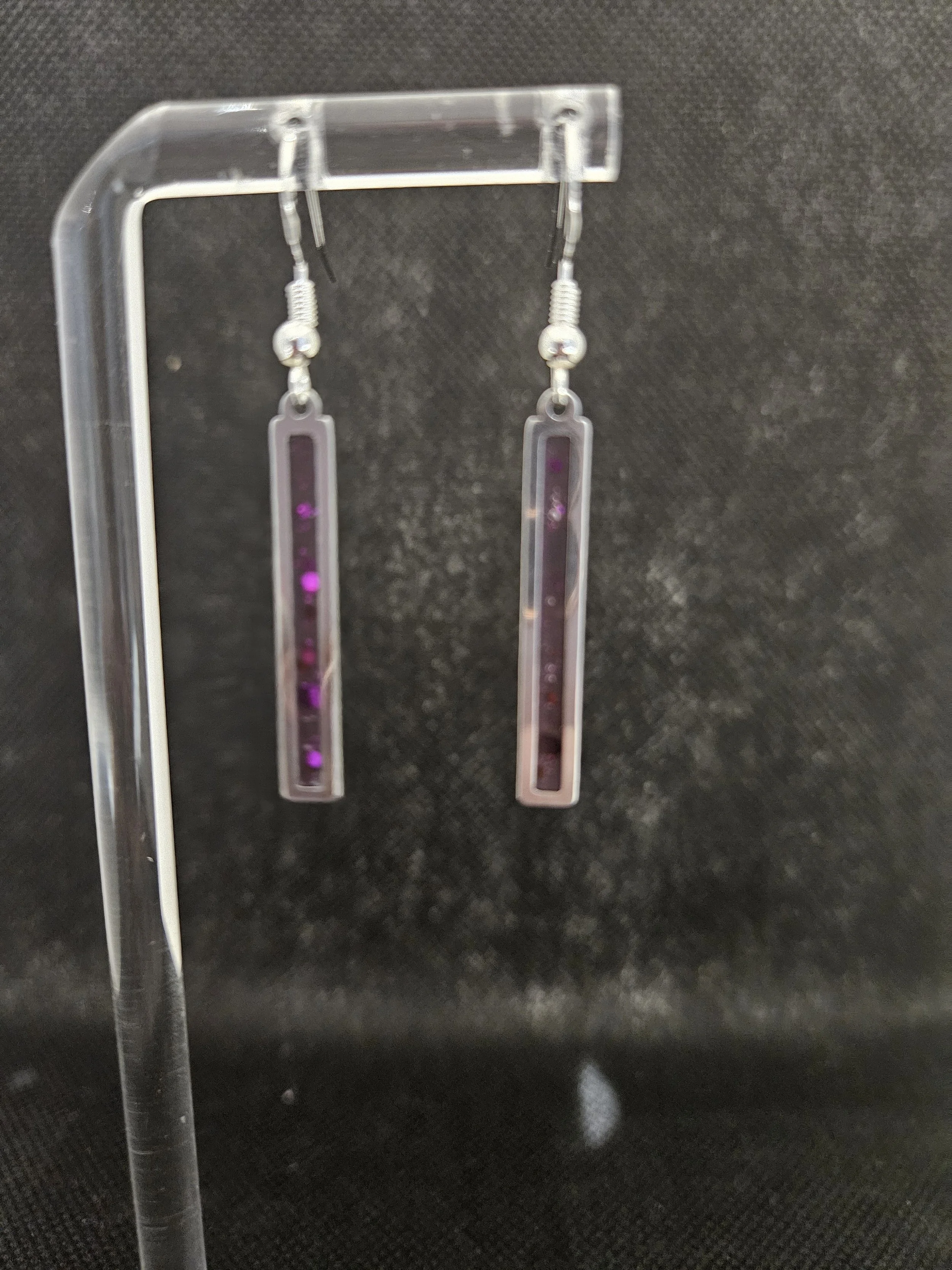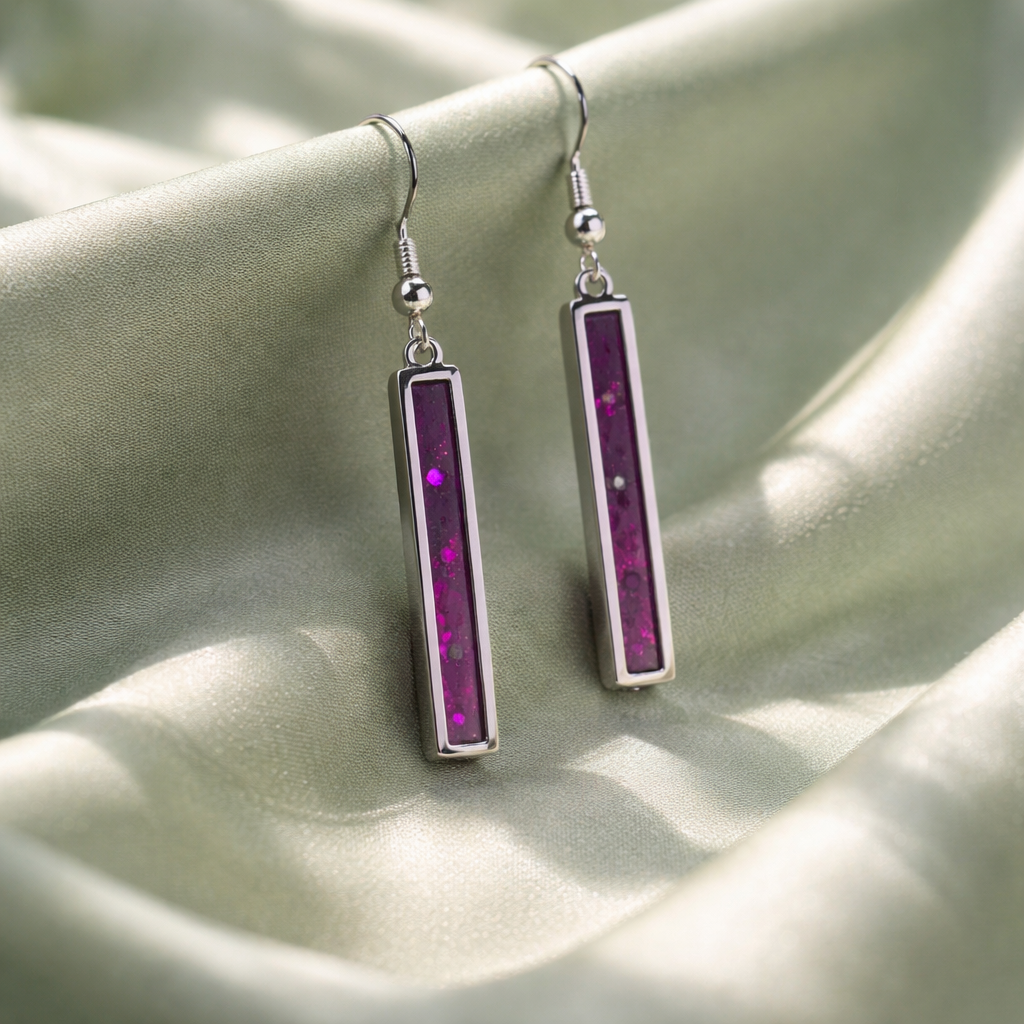 Add a touch of shimmering colour to your jewellery collection with these handcrafted silver rectangle dangle earrings, featuring a beautiful translucent purple resin inlay infused with delicate glitter. The result is a soft, luminous sparkle that catches the light effortlessly, giving these earrings a magical, ethereal glow.