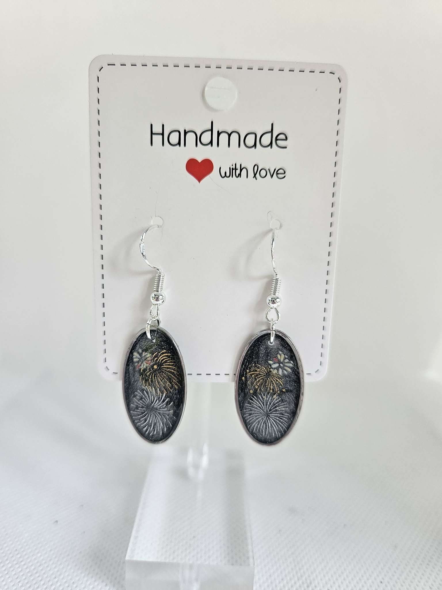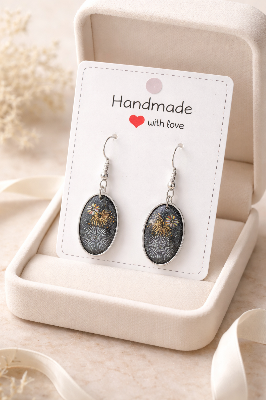 A pair of earrings designed to feel like a celebration you can wear. These custom‑made ovals feature a deep night‑sky backdrop scattered with bursts of gold, white, and red—an elegant firework display captured in miniature. The dark base creates a rich contrast that makes each spark of colour glow, giving the earrings a warm, festive shimmer with every movement.