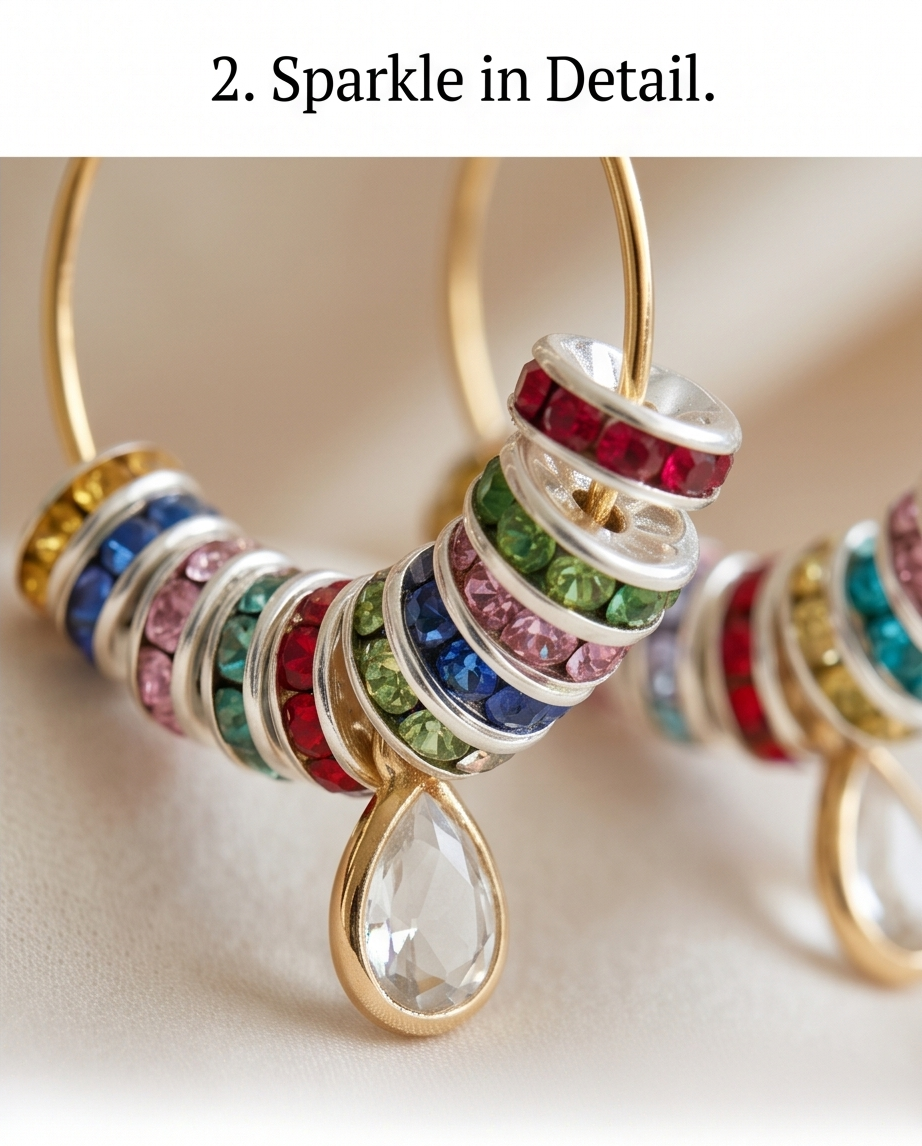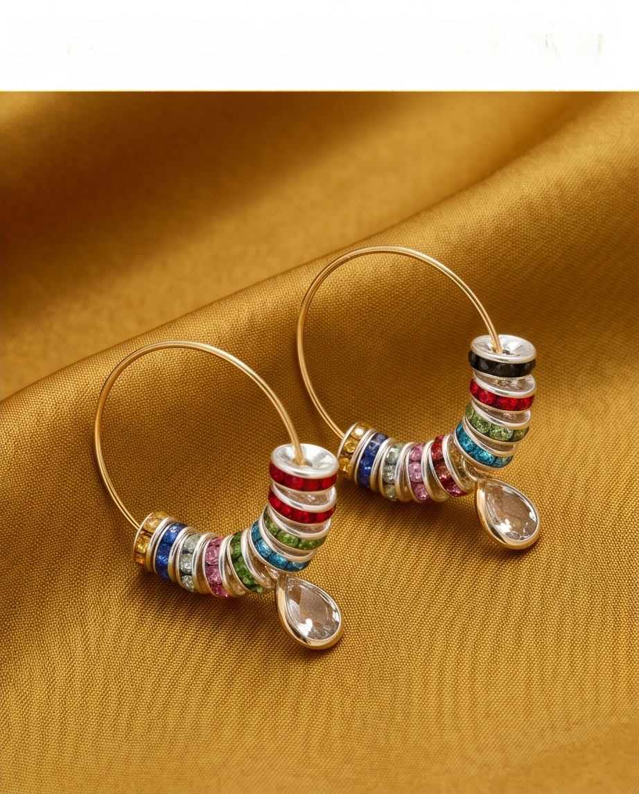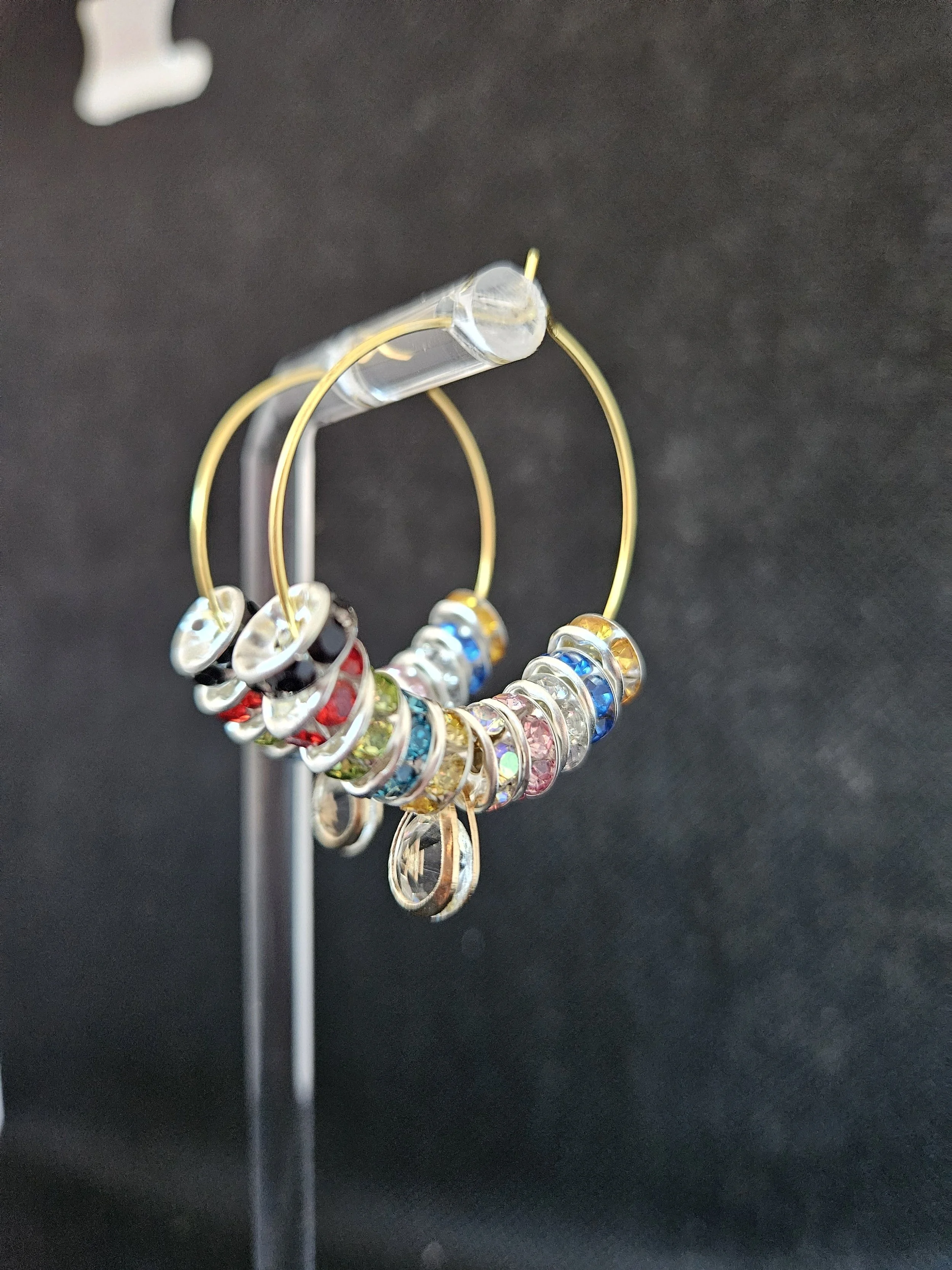 Add a burst of colour to any outfit with these handmade rainbow beaded hoop earrings, designed for lovers of bright, playful, and unique jewellery. Each gold‑tone hoop is adorned with a mix of multicoloured crystal‑style beads in red, blue, green, yellow, pink, and clear tones — creating a sparkling, eye‑catching finish that shifts beautifully in the light.
