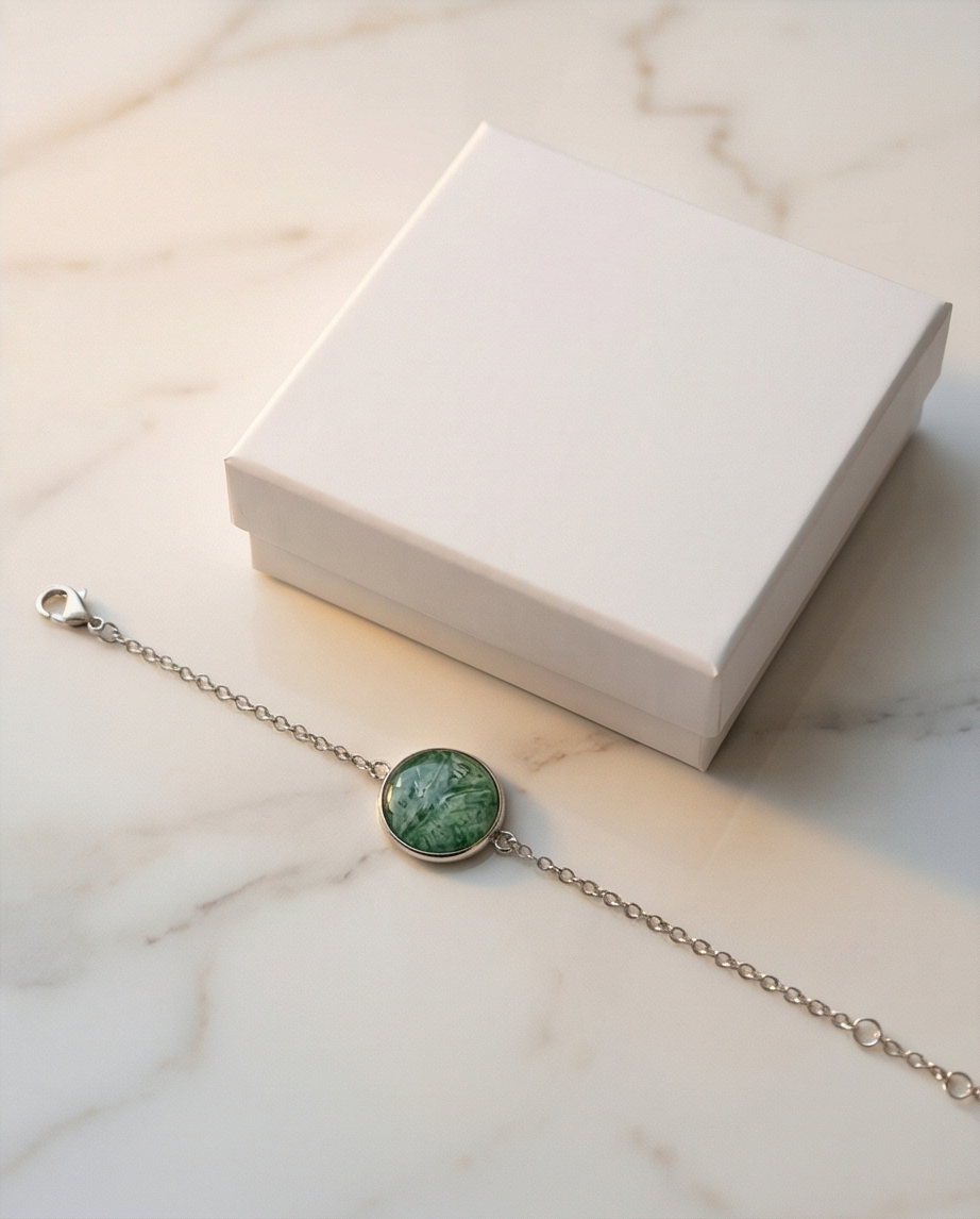 Crafted with care and designed especially for you, this custom handmade bracelet features a delicate silver chain paired with a stunning green marbled centrepiece. The round charm showcases swirling tones of soft green and white, creating a natural stone‑like effect that feels both calming and luxurious. Set in a smooth silver bezel, the pendant catches the light beautifully, making this piece perfect for everyday wear or meaningful gifting.