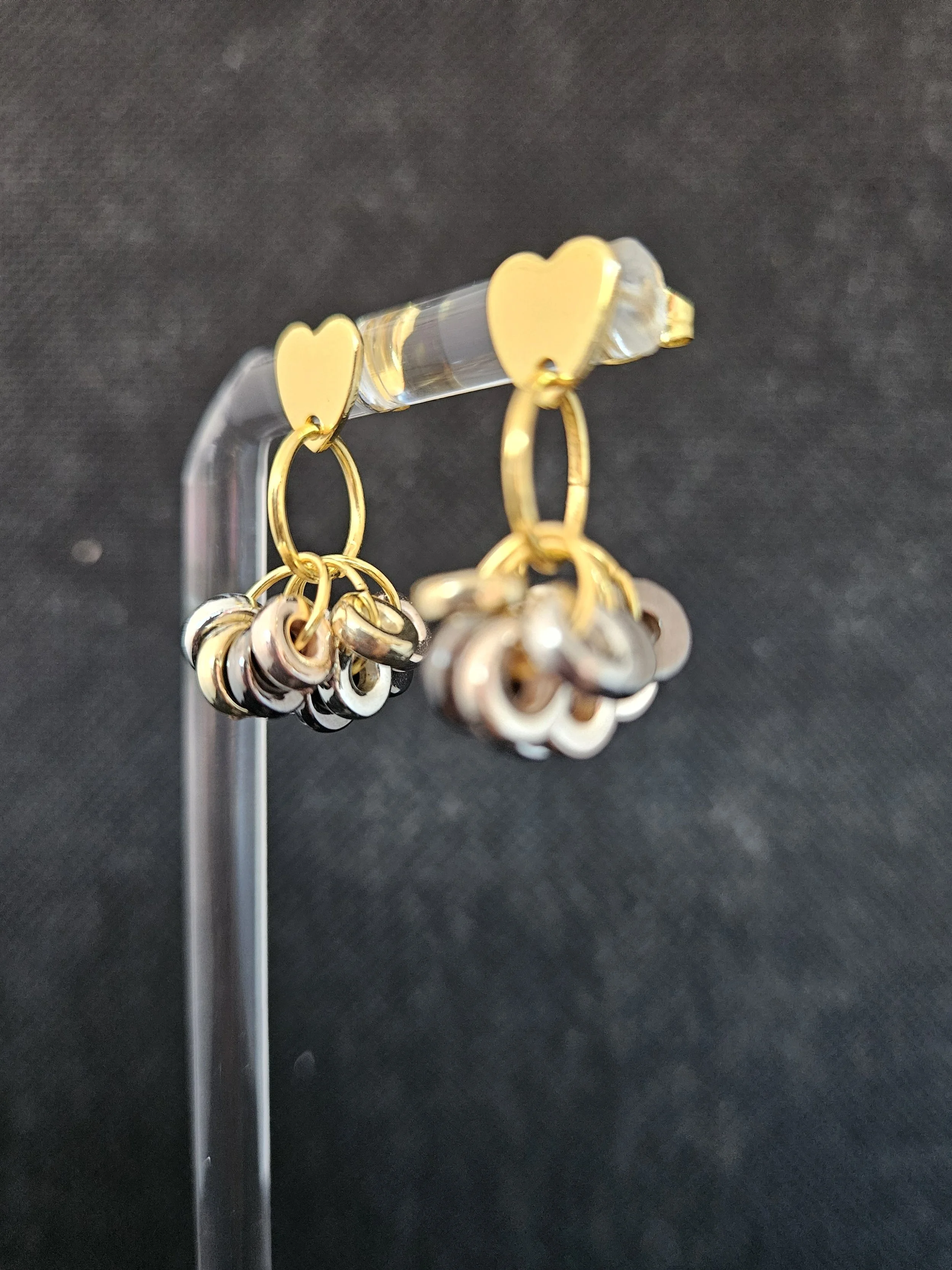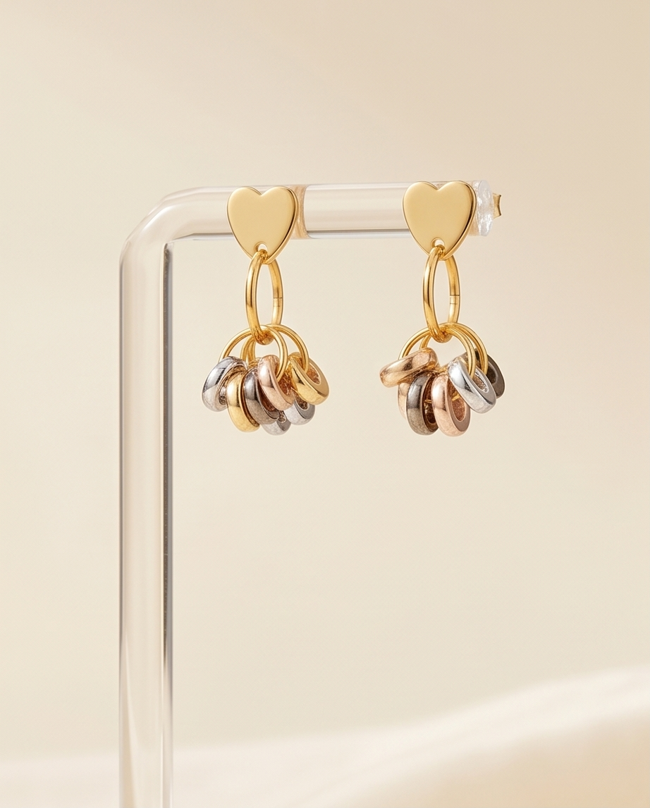 Make a statement with these gold heart dangle earrings, designed for those who love bold, shiny, and expressive jewellery. Each earring features a pair of polished gold heart charms, linked together to create a romantic drop silhouette. Below them, a cluster of reflective metallic discs adds movement, shimmer, and a layered, eye‑catching finish.