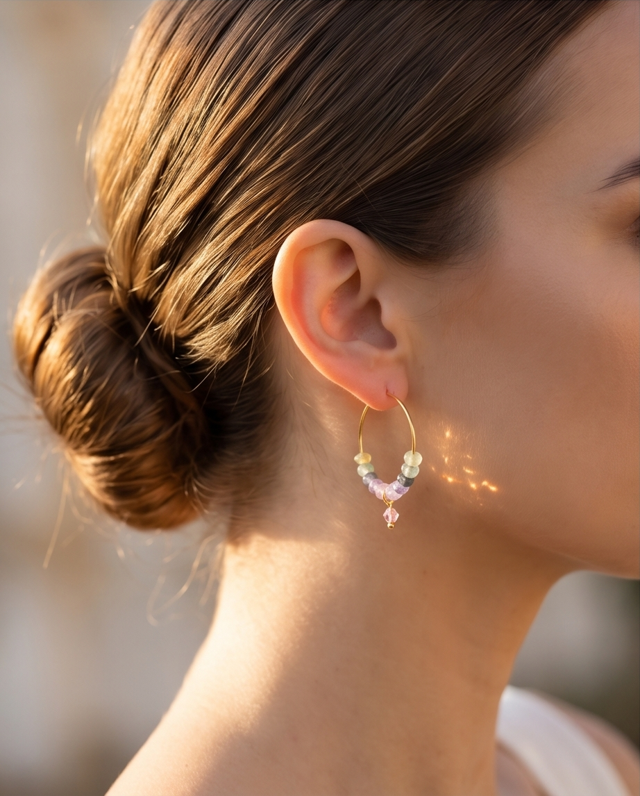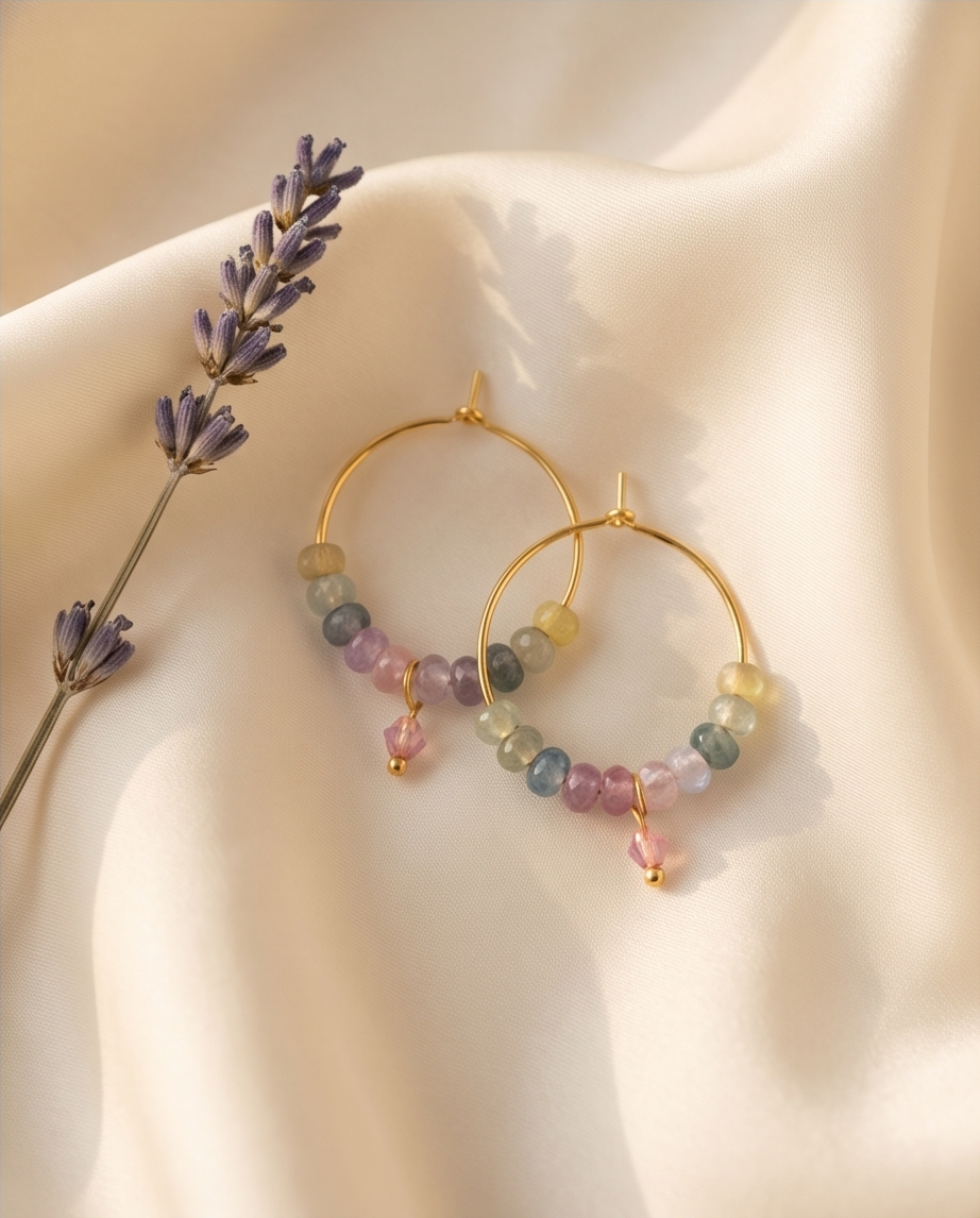 Perfect for spring, summer, festivals, holidays, and everyday wear, these earrings blend artisan craftsmanship with a gentle, uplifting palette. Their lightweight feel makes them comfortable for all‑day styling, while the gold‑tone hoops add a warm, elegant touch.