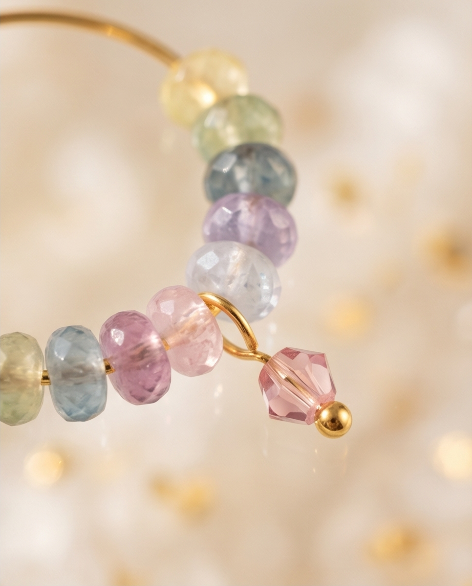 Bring a soft pop of colour to any outfit with these handmade pastel bead gold hoop earrings, designed for lovers of playful, dreamy jewellery. Each lightweight hoop features a curated blend of pastel blue, green, yellow, and purple beads, finished with a sparkling faceted pink drop charm that adds movement and shine.