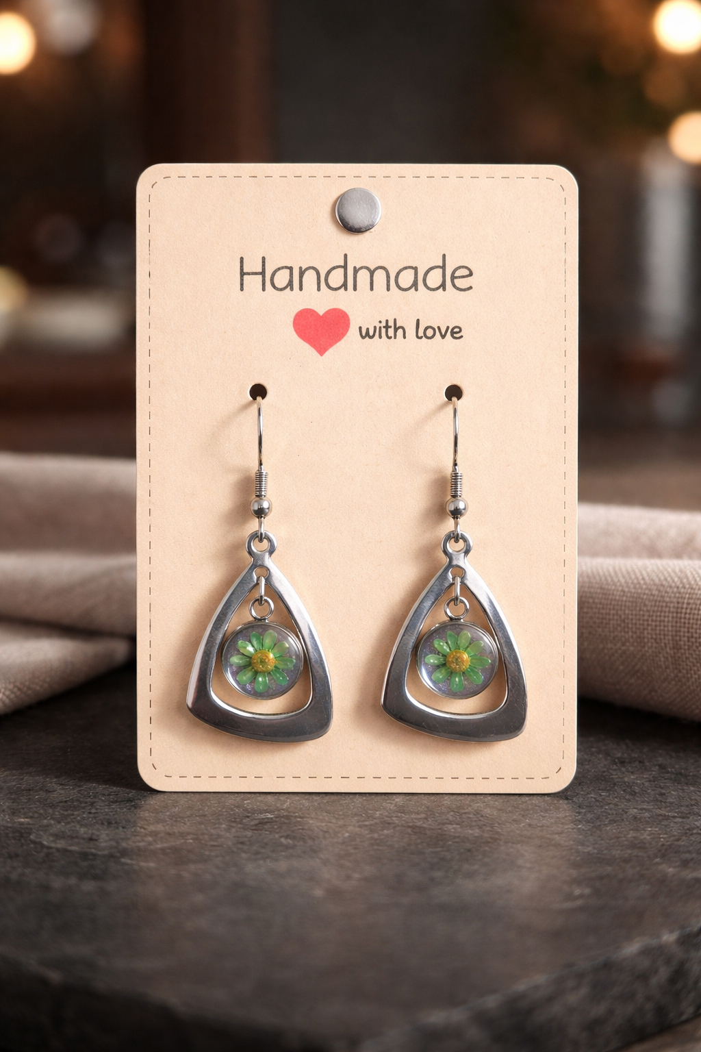 A delicate, nature‑inspired pair of earrings that capture the charm of a tiny preserved garden. Each earring features a soft triangular metal frame holding a domed circular centrepiece, where a vivid green flower with a warm yellow heart is suspended in clear resin. The combination of geometric metalwork and organic floral detail creates a look that’s both modern and gently whimsical.