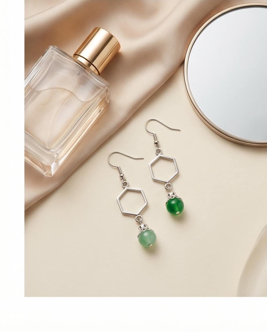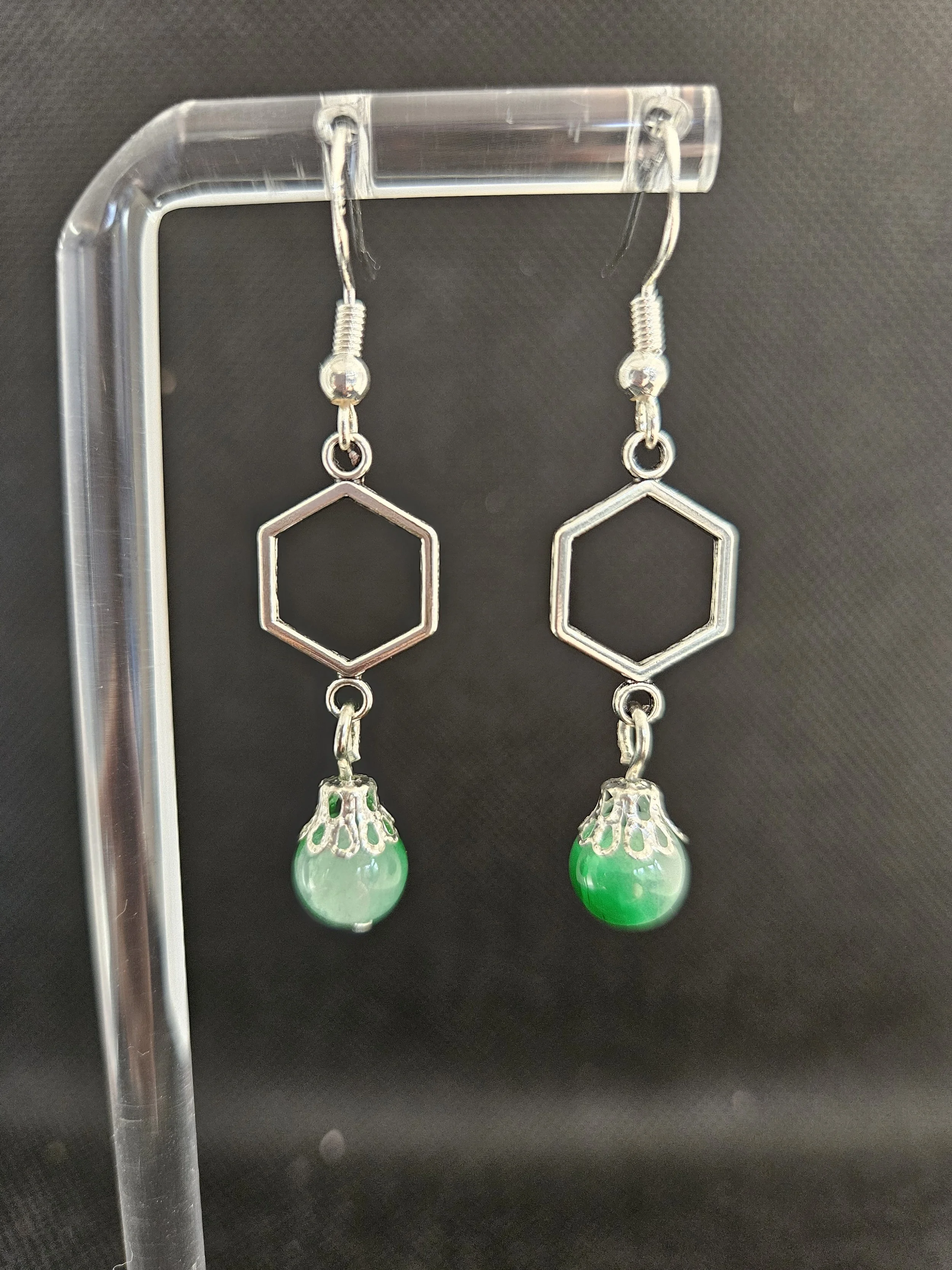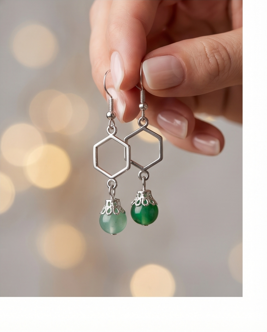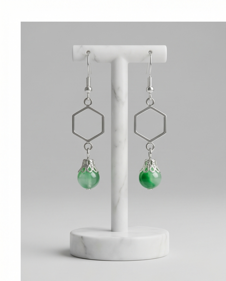 Elevate your everyday style with these handmade silver hexagon dangle earrings, featuring a striking blend of geometric design and earthy green tones. Each earring showcases a polished silver hexagon frame paired with a vibrant green bead wrapped in a decorative silver cap, creating a look that’s both modern and naturally inspired.