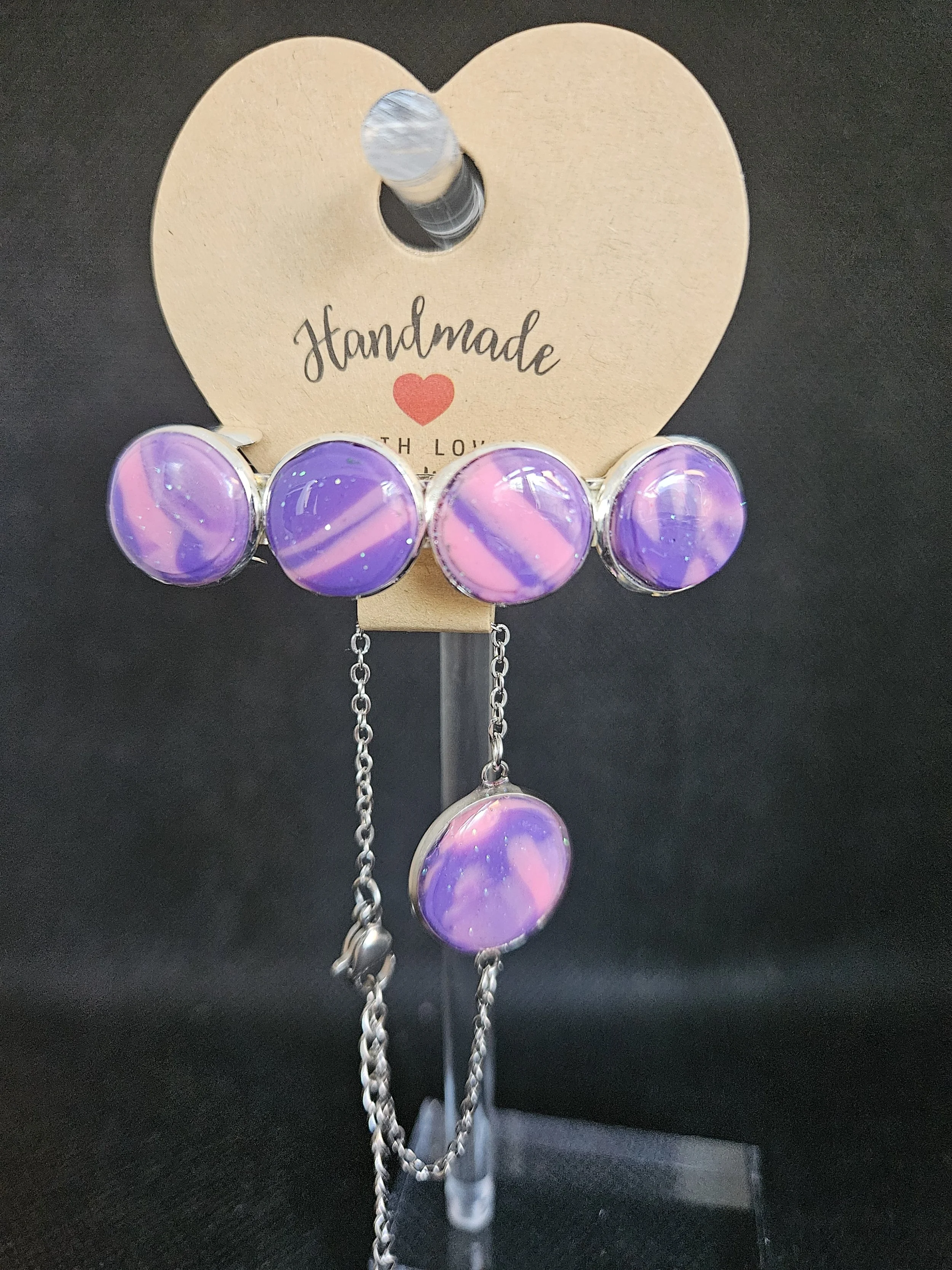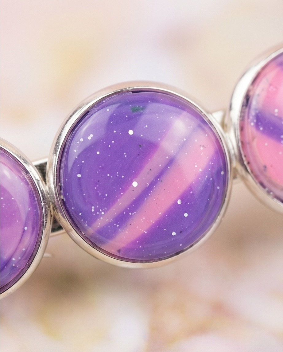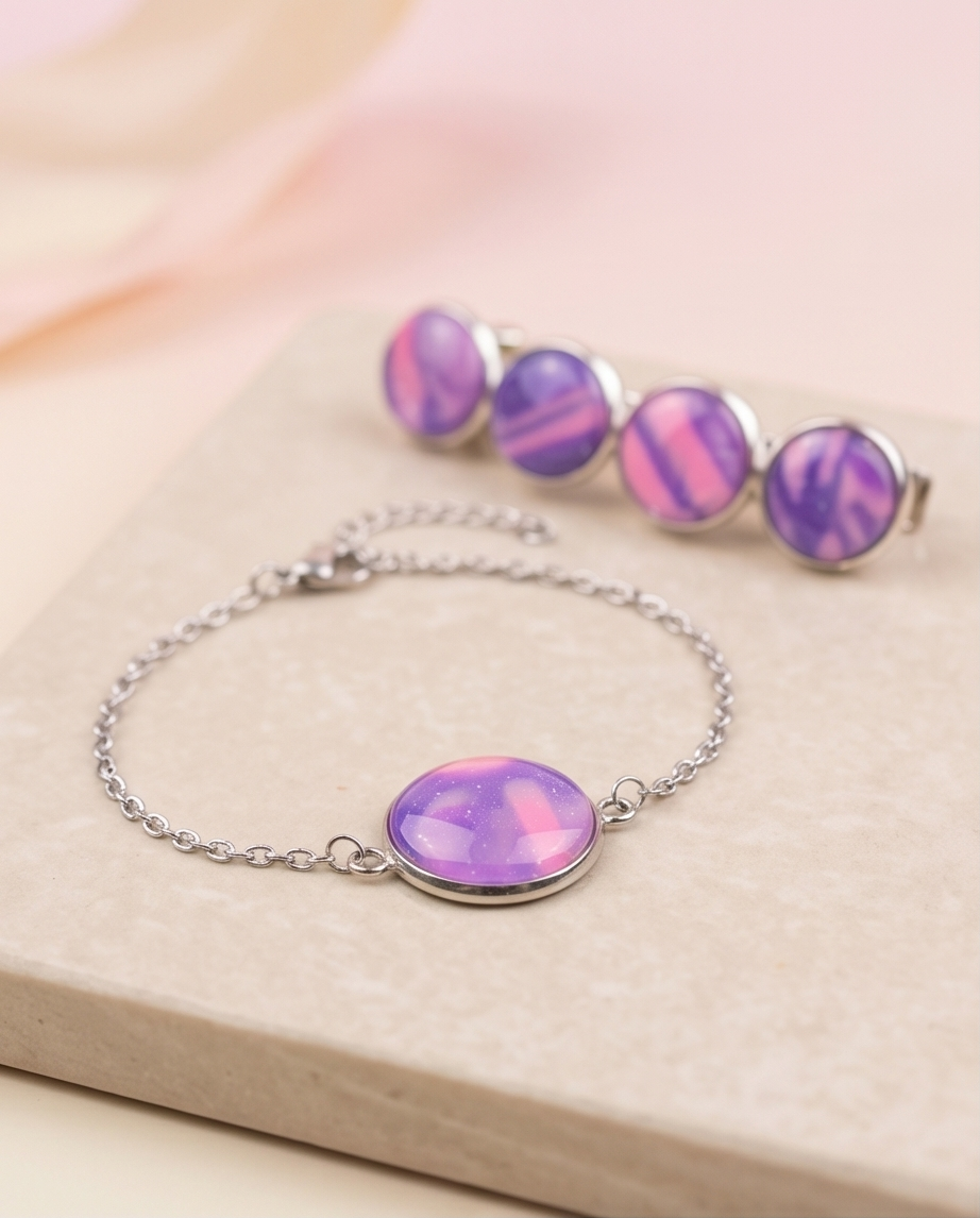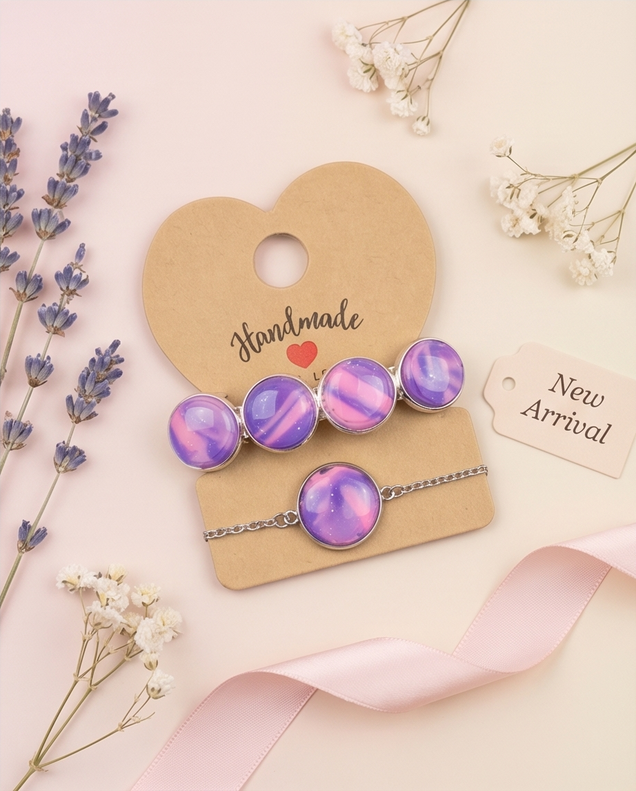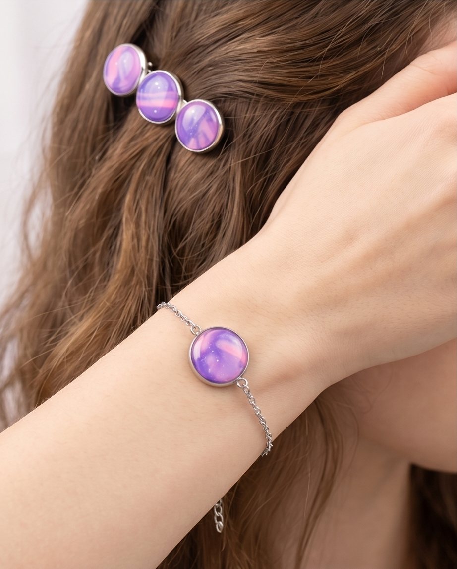 Elevate your everyday style with this handmade bracelet and hair clip set, featuring glossy blue and pink marbled cabochons that shimmer with subtle sparkles. Each piece is crafted by hand, giving the set a unique, artistic finish that feels both modern and magical.