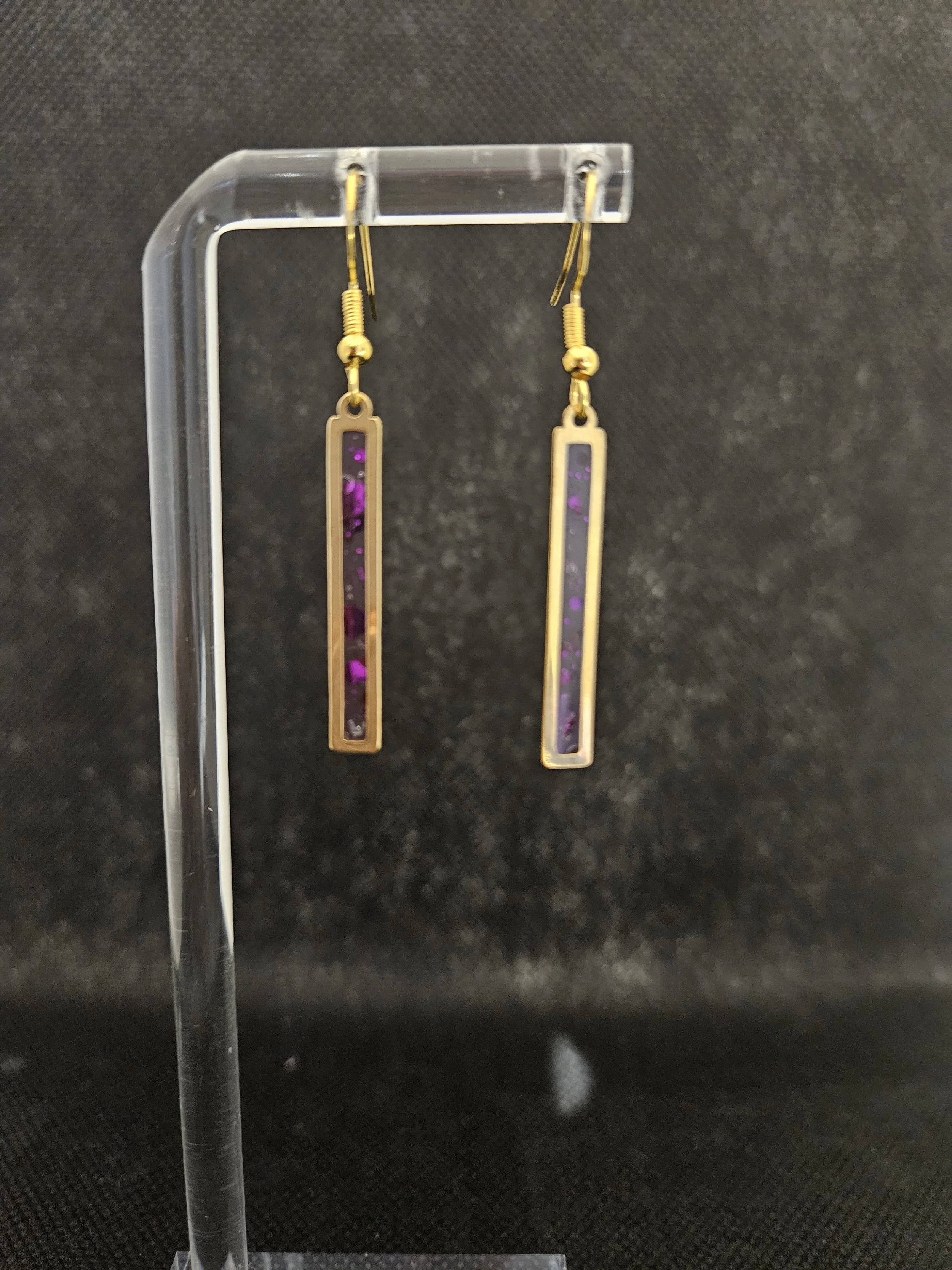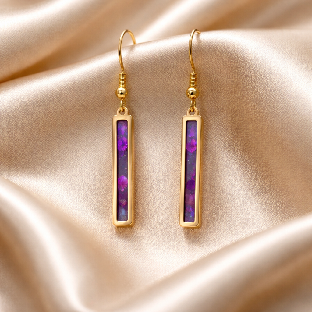 Add a touch of modern luxury to your jewellery collection with these stunning gold rectangle dangle earrings, each featuring a vibrant purple resin inlay. The rich, opal‑like shimmer catches the light beautifully, creating a mesmerising blend of colour that feels both artistic and sophisticated.