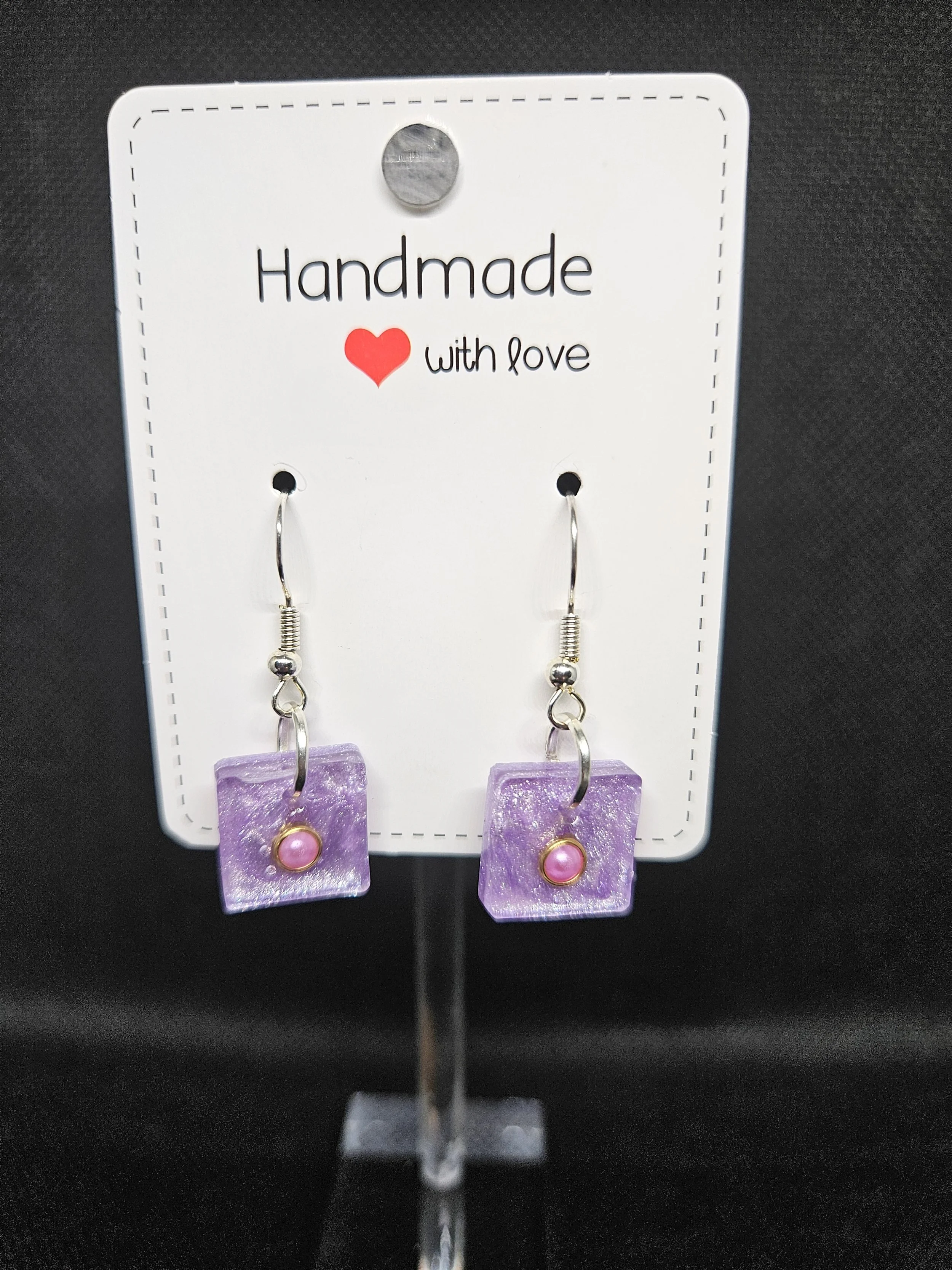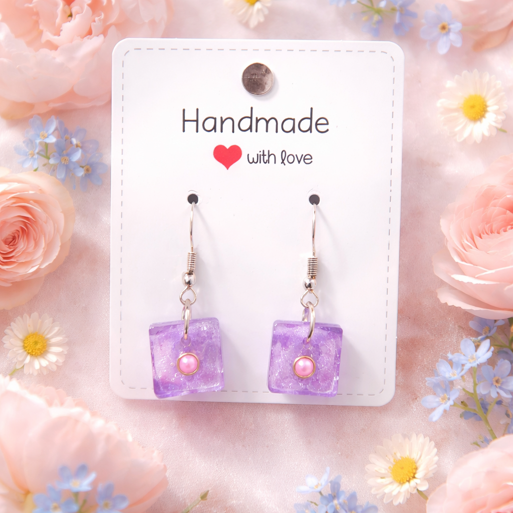 These handmade square resin earrings bring a delicate blend of colour and charm to any outfit. Each piece features a translucent purple base with a soft, pink pearl‑like bead set at the centre, framed by a subtle metallic ring that adds a refined touch. The gentle shimmer of the resin catches the light beautifully, giving the earrings a graceful, feminine glow.