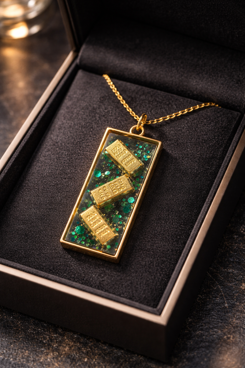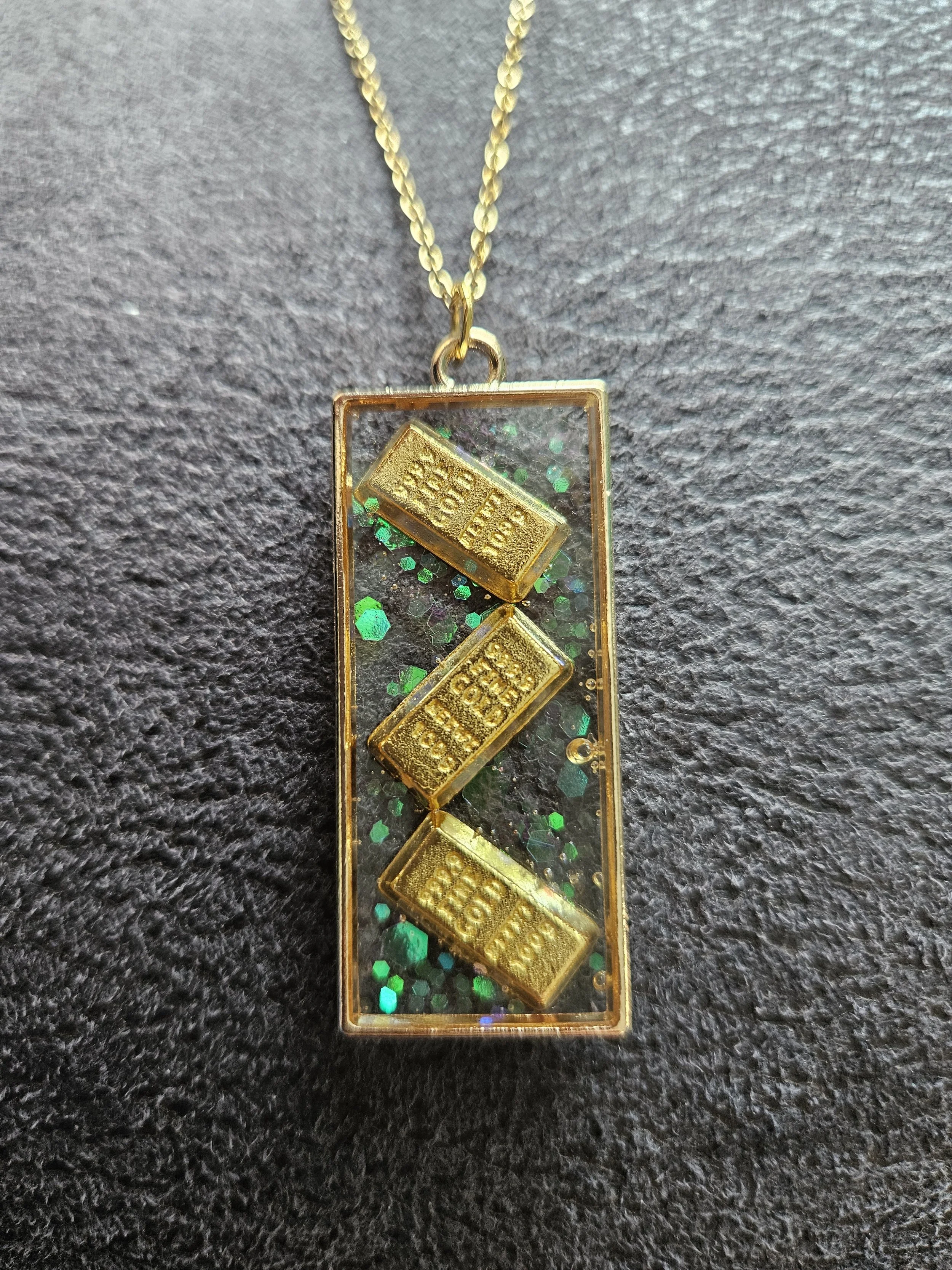 Make a bold statement with this striking gold bar pendant necklace, featuring three miniature gold bars suspended inside a clear resin background. The pendant is filled with white iridescent glitter that catches the light beautifully, creating a shimmering, colour‑shifting effect that enhances the luxurious theme.