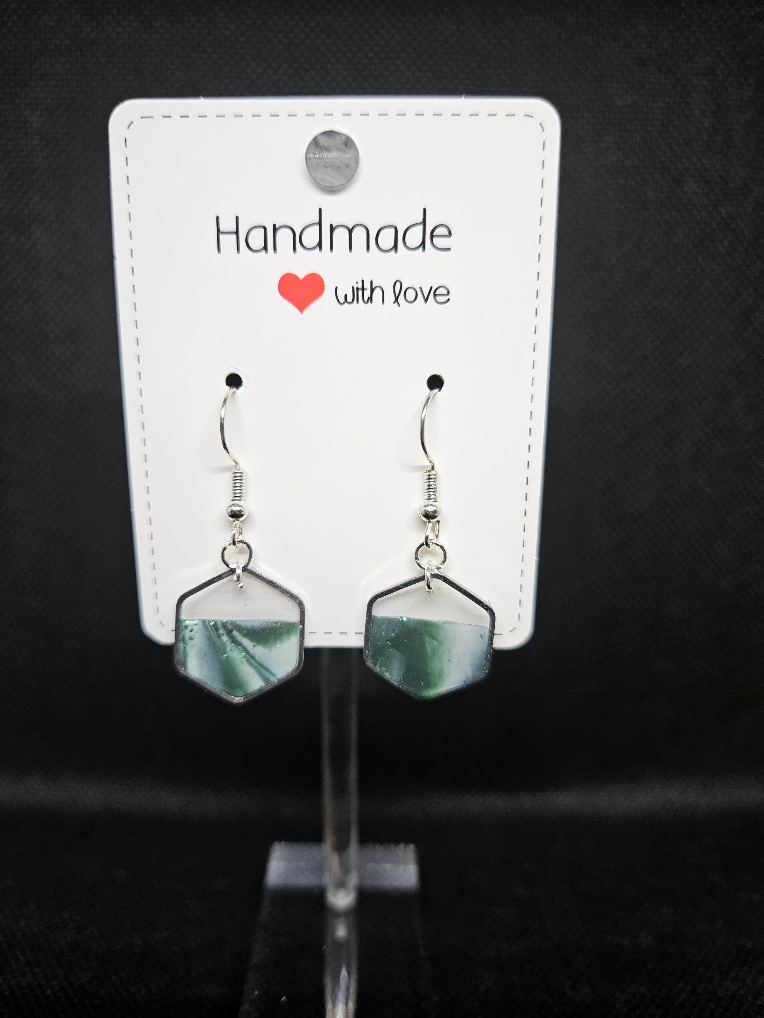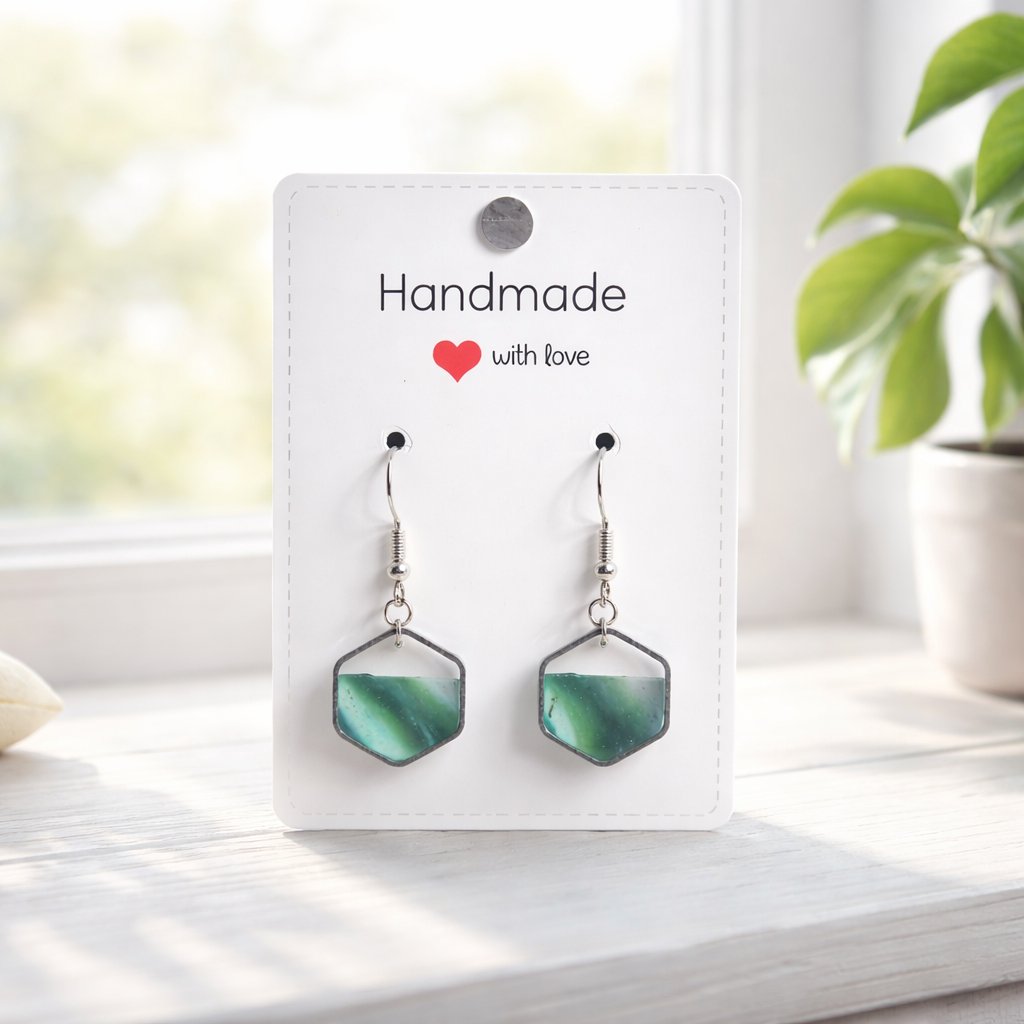 These handmade hexagon earrings blend geometric elegance with a soothing, nature‑inspired palette. Each piece features a green and teal marbled design, creating soft waves of colour that feel organic and calming. The translucent frosted finish adds depth, while the metallic frame gives the earrings a refined, polished edge.