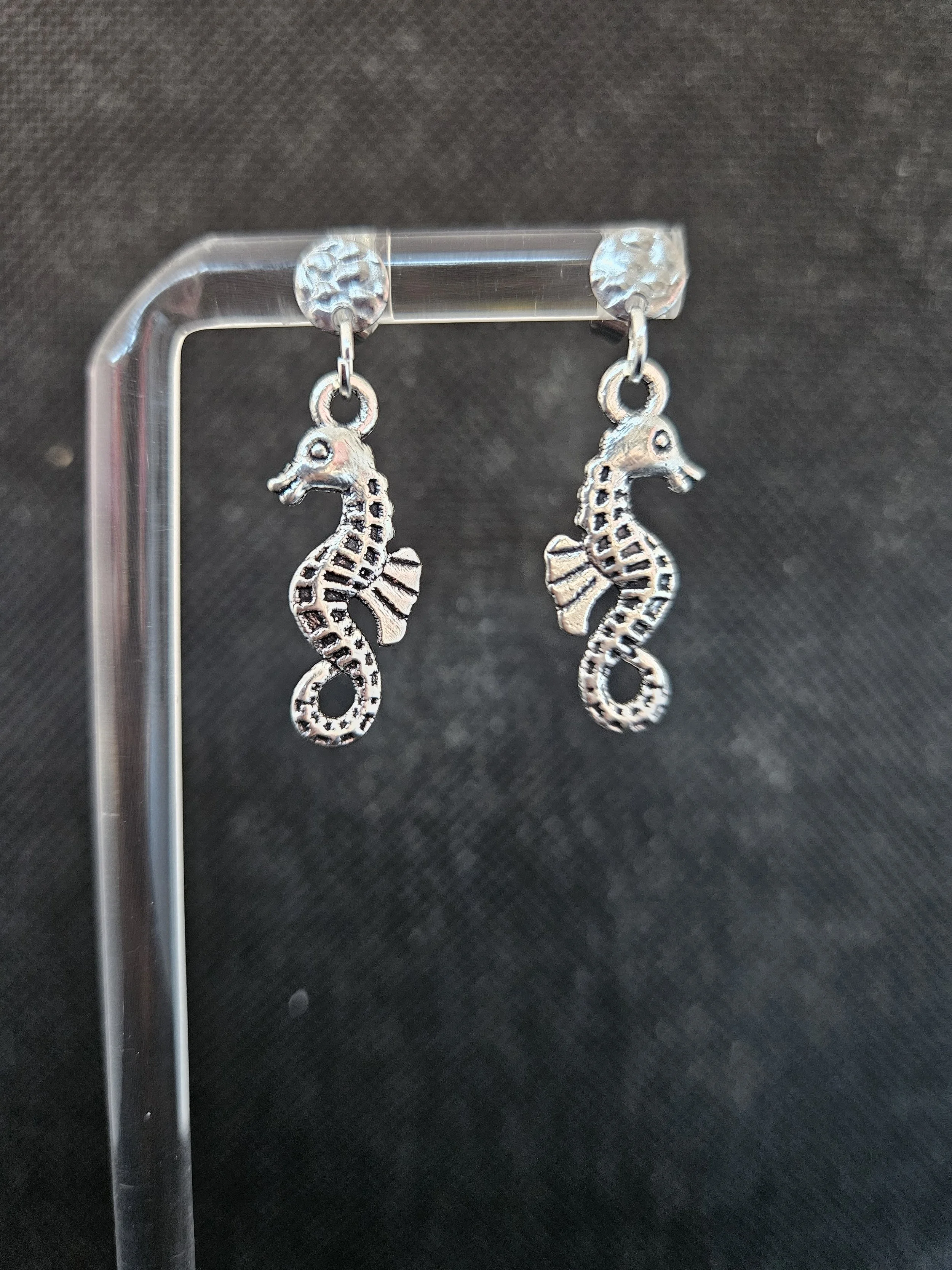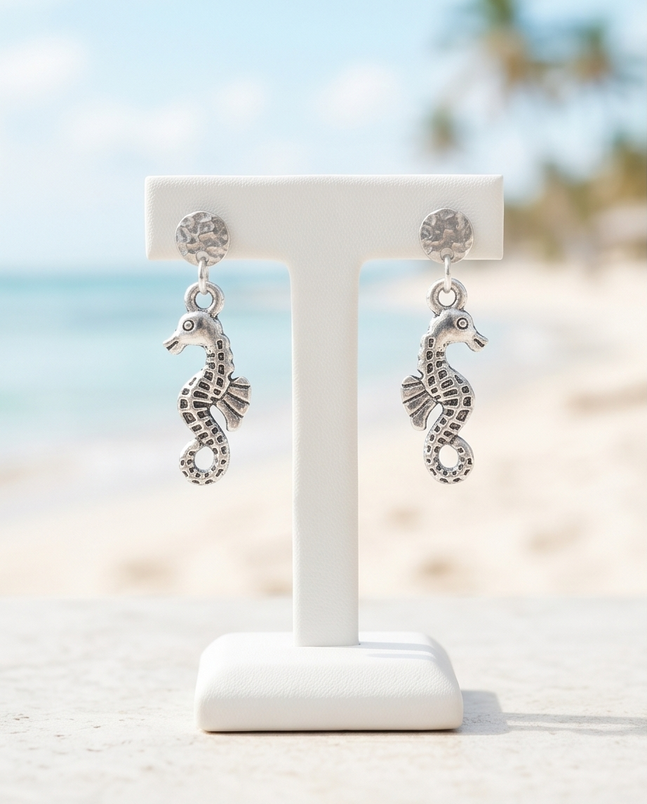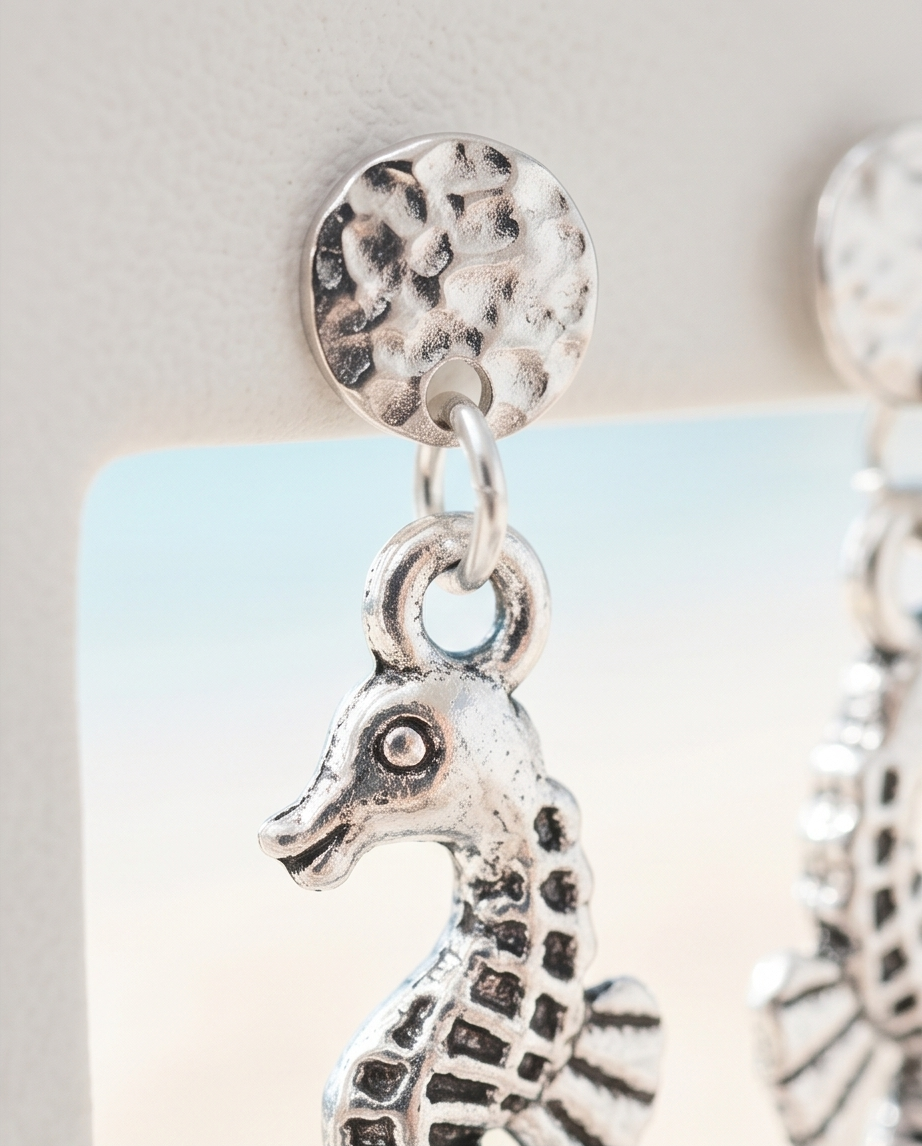 Celebrate the beauty of the sea with these silver-tone seahorse dangle earrings, crafted with intricate detailing that captures the charm of this beloved ocean creature. Each earring features a beautifully sculpted seahorse with a curled tail, textured body, and delicate facial features, creating a striking marine‑inspired accessory that stands out effortlessly.