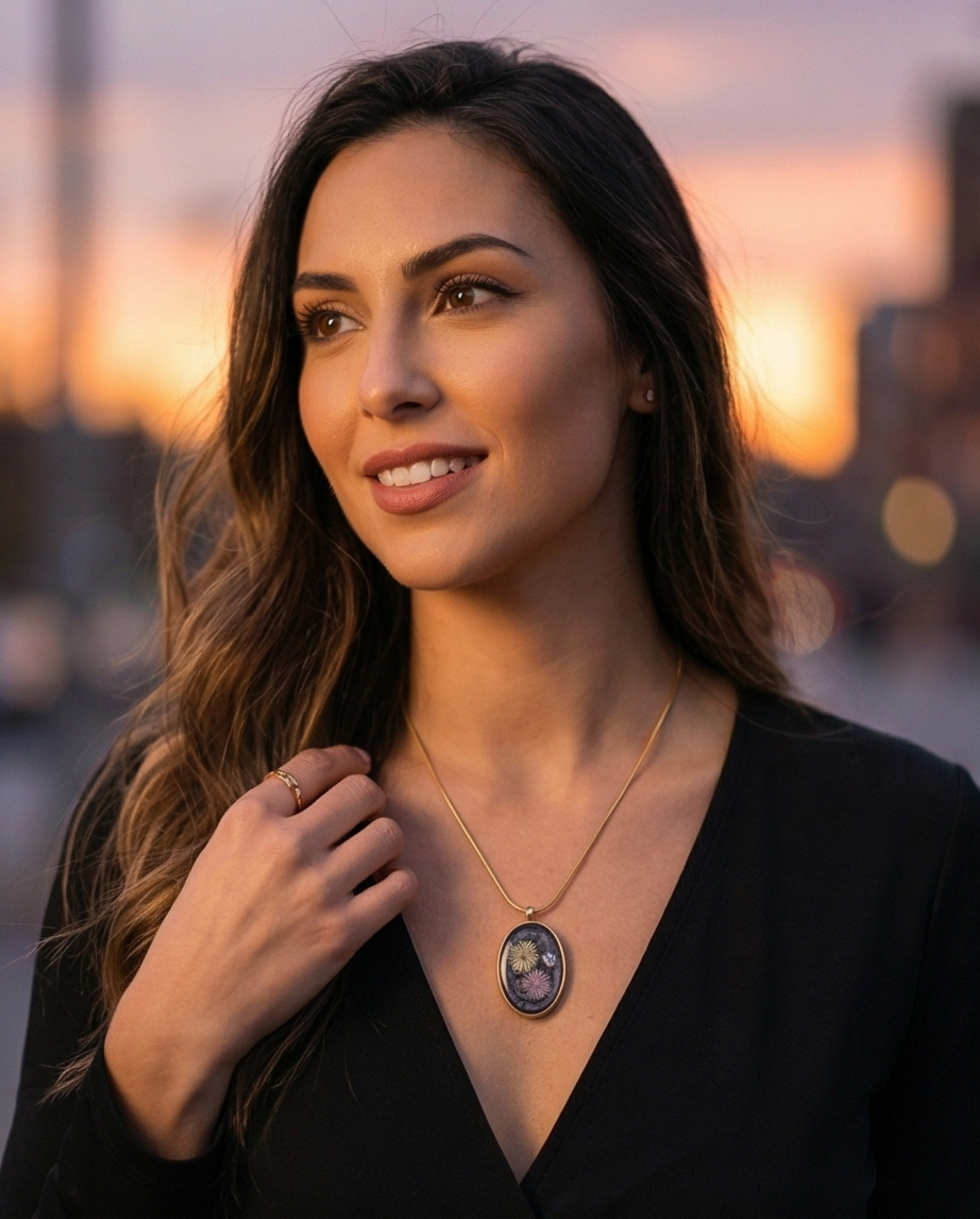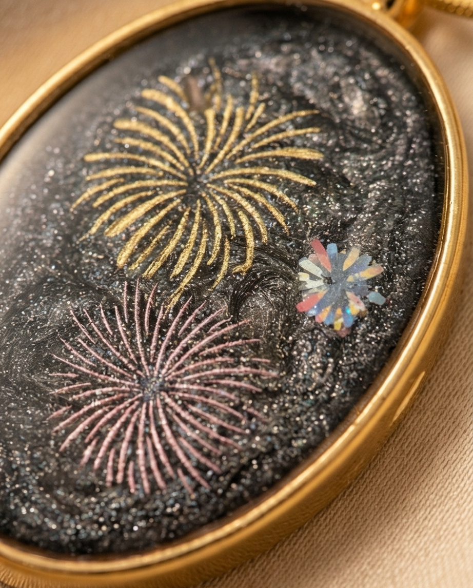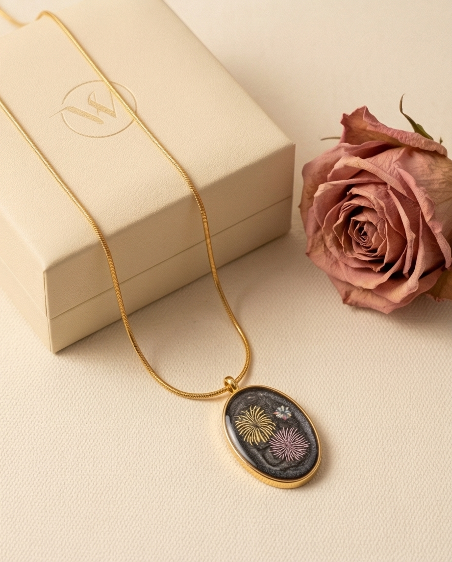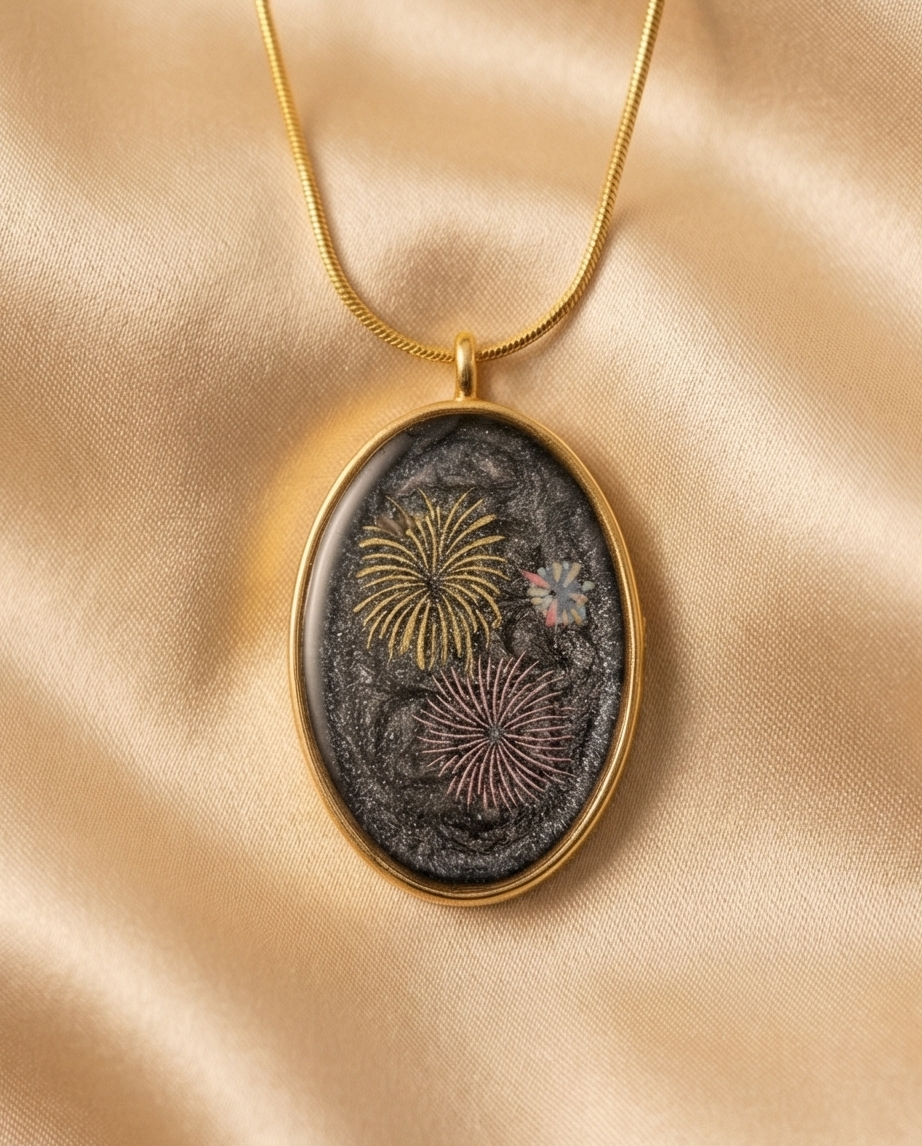 Celebrate sparkle, colour, and creativity with this Firework Burst Pendant Necklace, a handcrafted piece designed to capture the magic of a night sky lit by dazzling bursts of light. The oval pendant features a deep, shimmering backdrop that sets the stage for three radiant firework‑style designs in gold, pink, and multicoloured accents — each one meticulously placed to create a sense of movement and celebration.