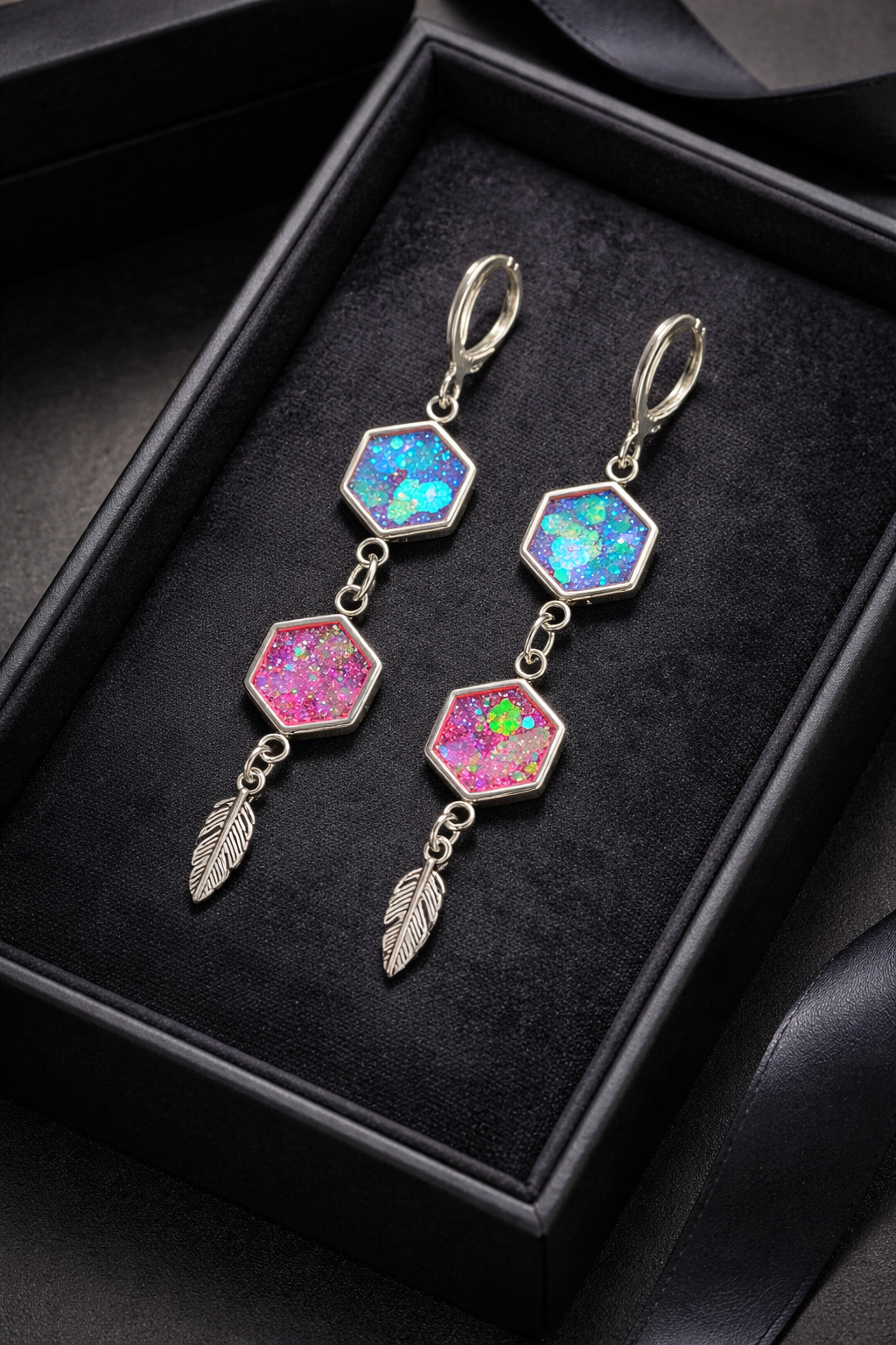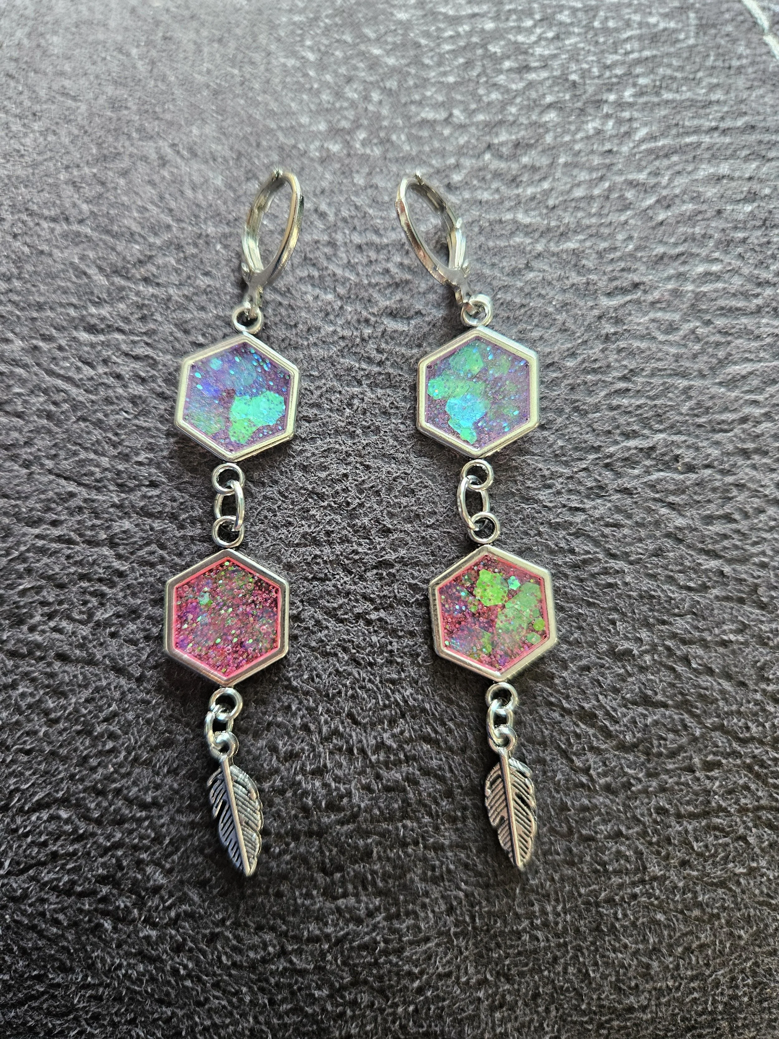 Add a burst of colour and movement to your look with these stunning handmade hexagon glitter dangle earrings, featuring two vibrant resin charms in purple and pink, finished with a delicate metallic feather charm. Each hexagon is filled with shimmering iridescent flakes that catch the light beautifully, creating a magical colour‑shift effect as the earrings move.