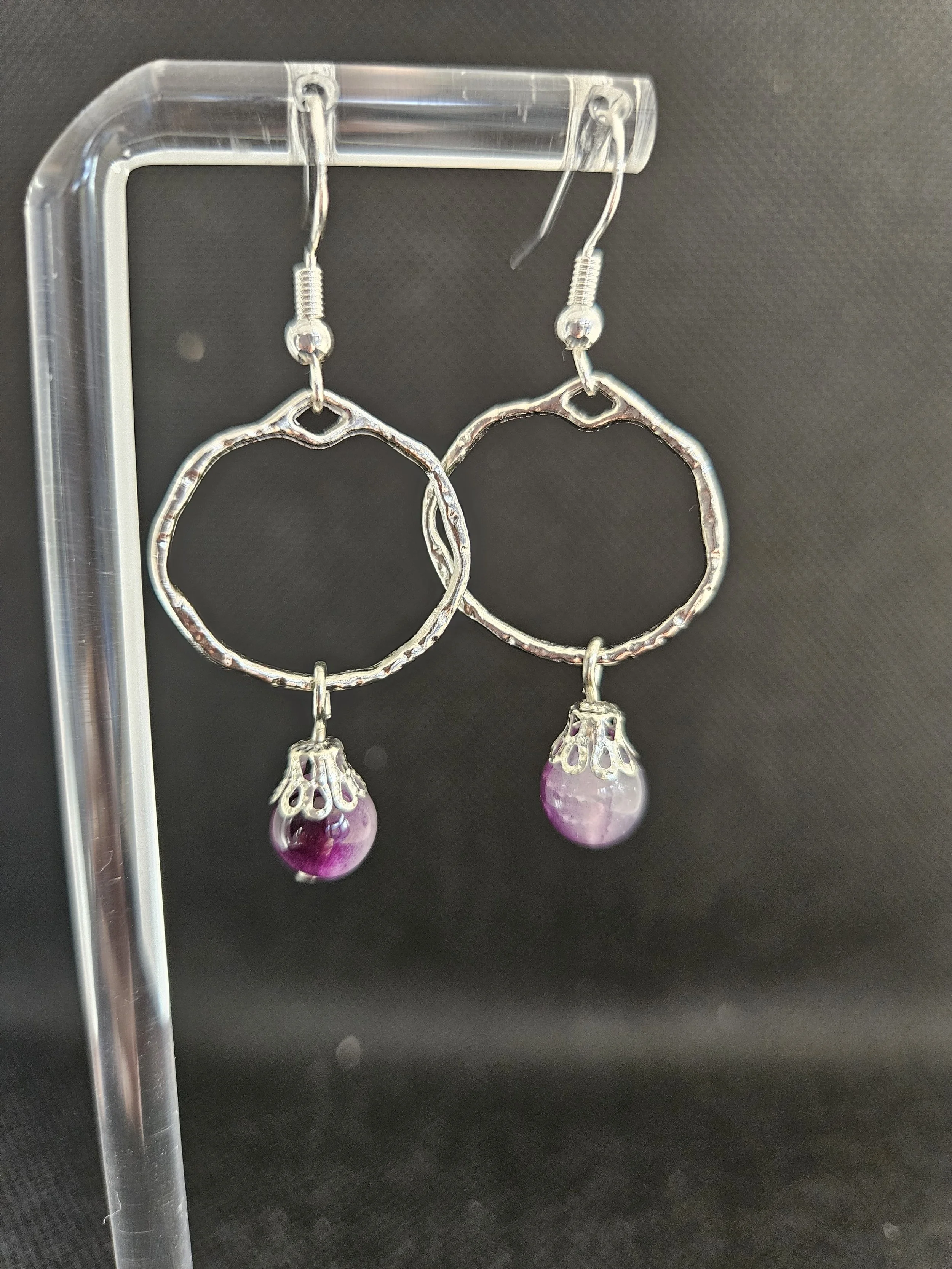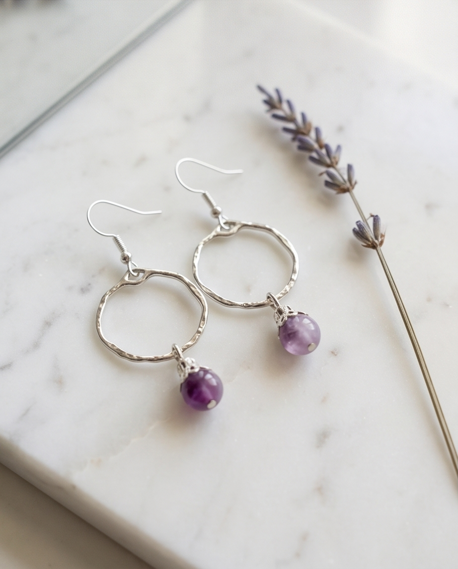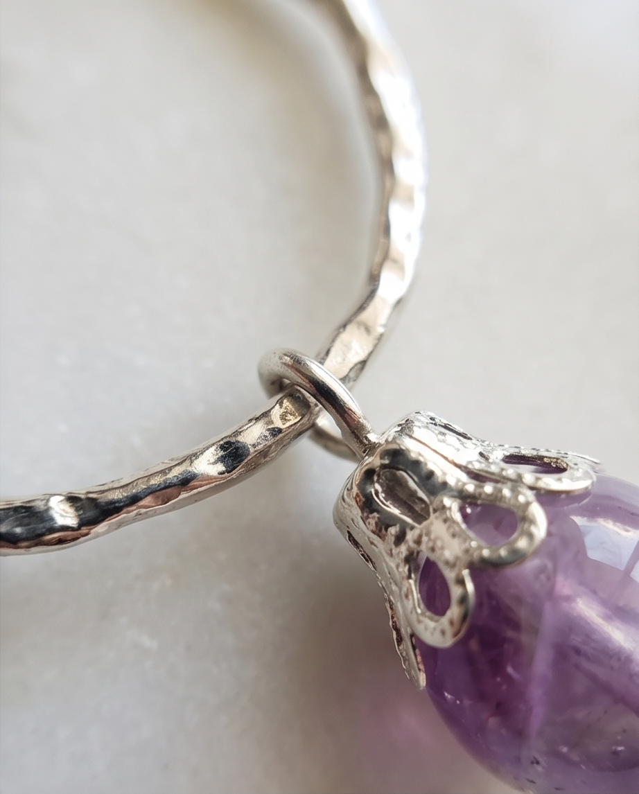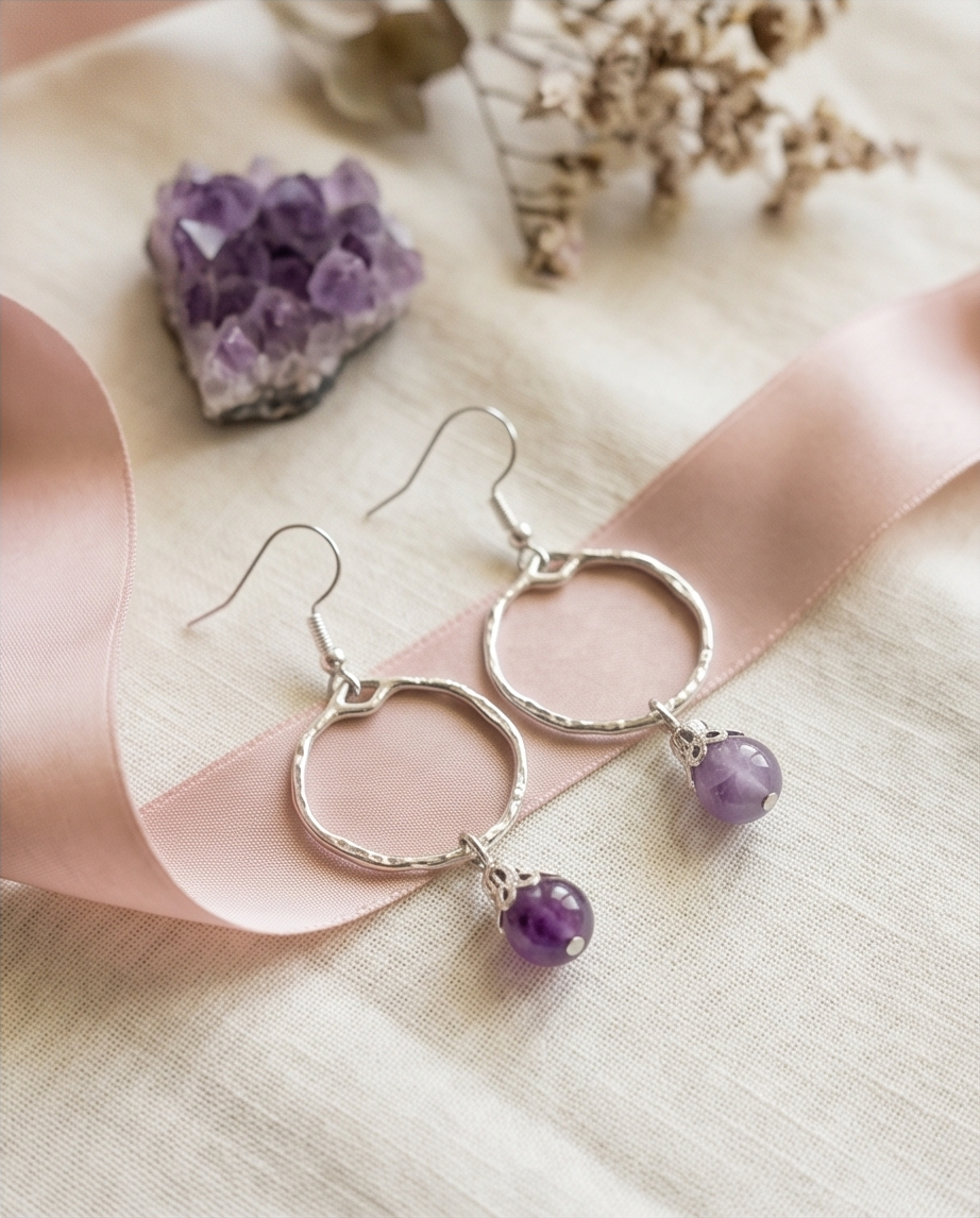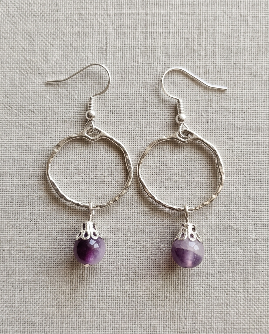 Add a touch of artisan charm to your look with these handmade hammered silver hoop earrings, finished with a shimmering faceted purple gemstone drop. Each earring features a textured silver ring that catches the light beautifully, paired with a rich purple bead wrapped in decorative silver detailing for an elegant, timeless finish.