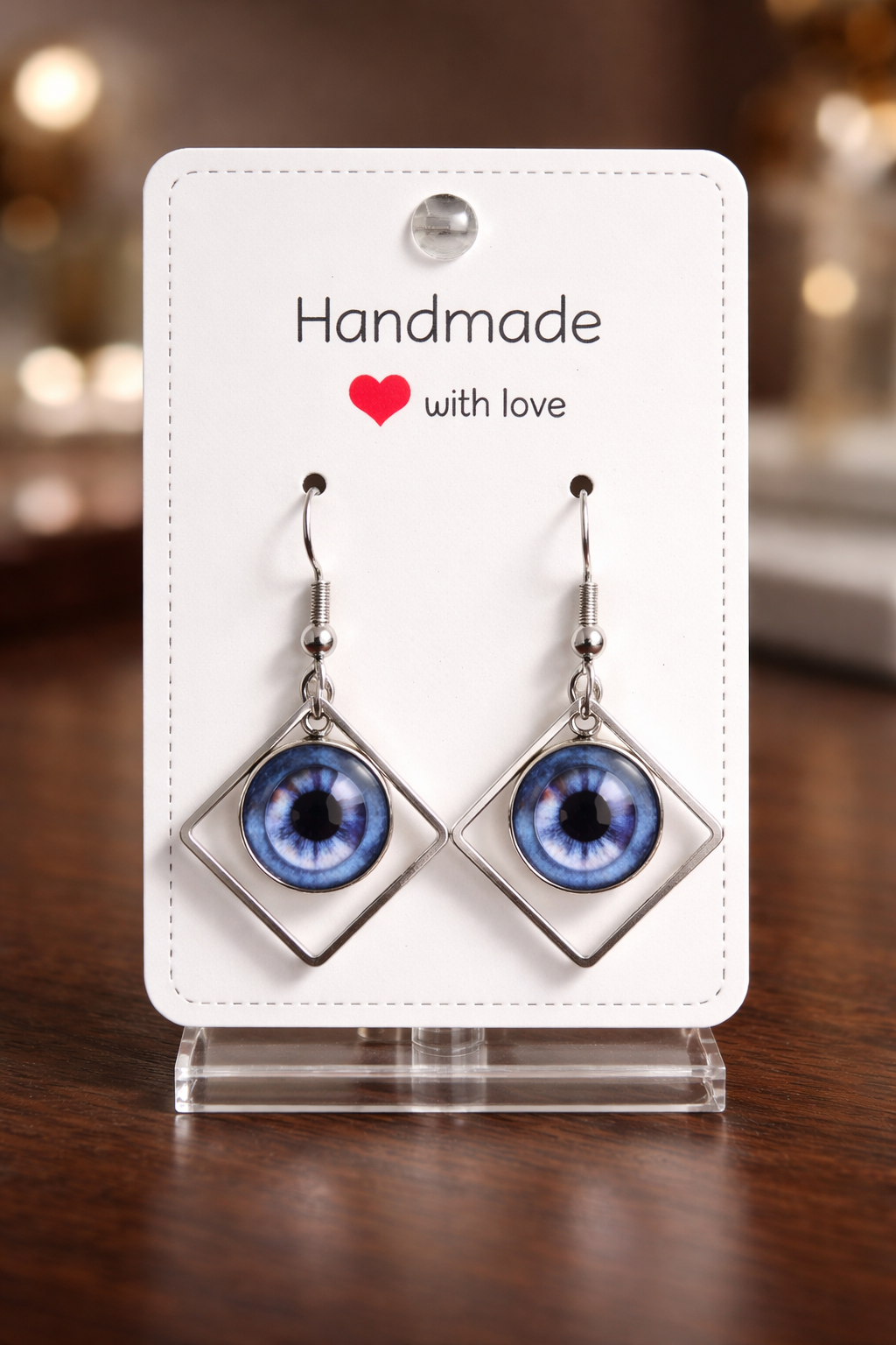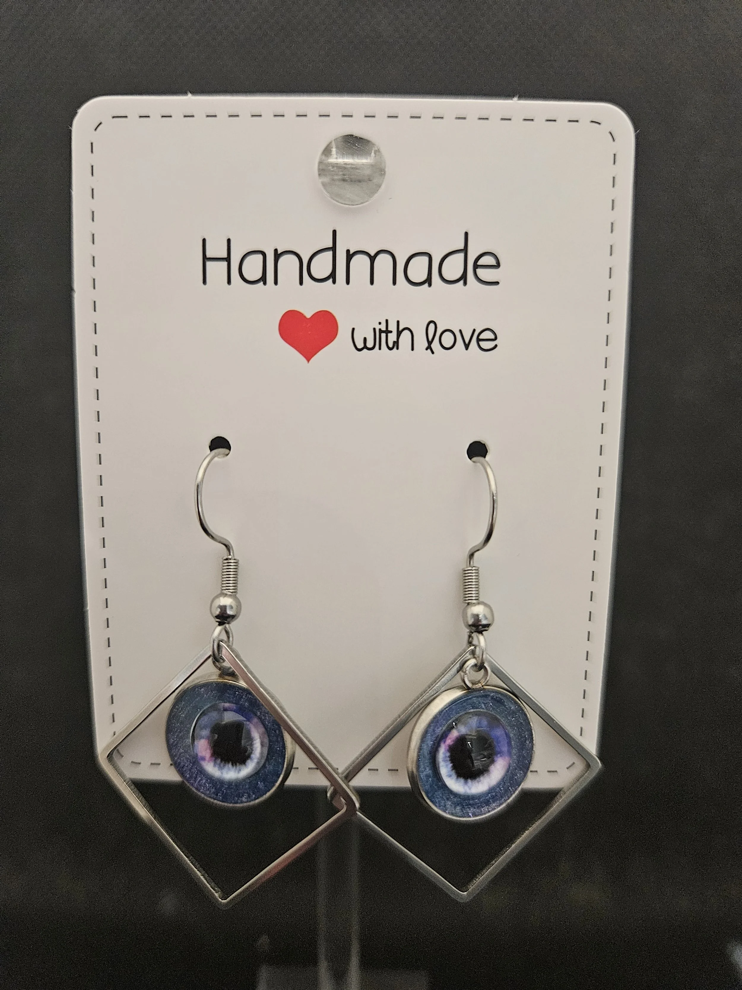 These handmade earrings feature a vivid circular “eye” design in shades of blue and purple, set inside a tilted square metal frame that gives the piece a modern, angular silhouette. The centre has a glossy, dimensional finish that makes the colours shift subtly as they catch the light, giving the eyes a luminous, watchful quality. The silver-toned hooks add coolness and contrast, balancing the tones of the artwork with a refined finish. The result is a pair that feels bold, artistic, and full of personality.