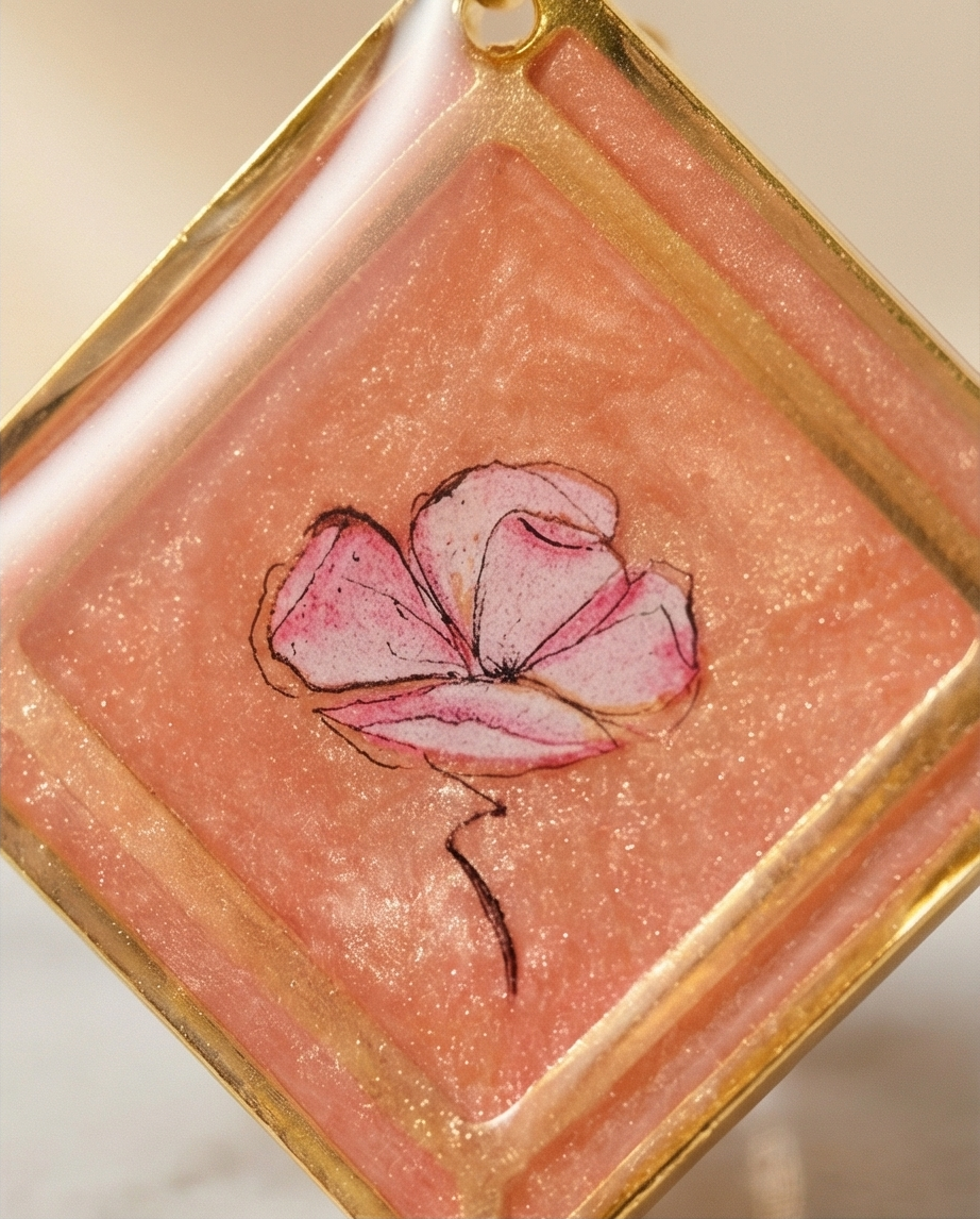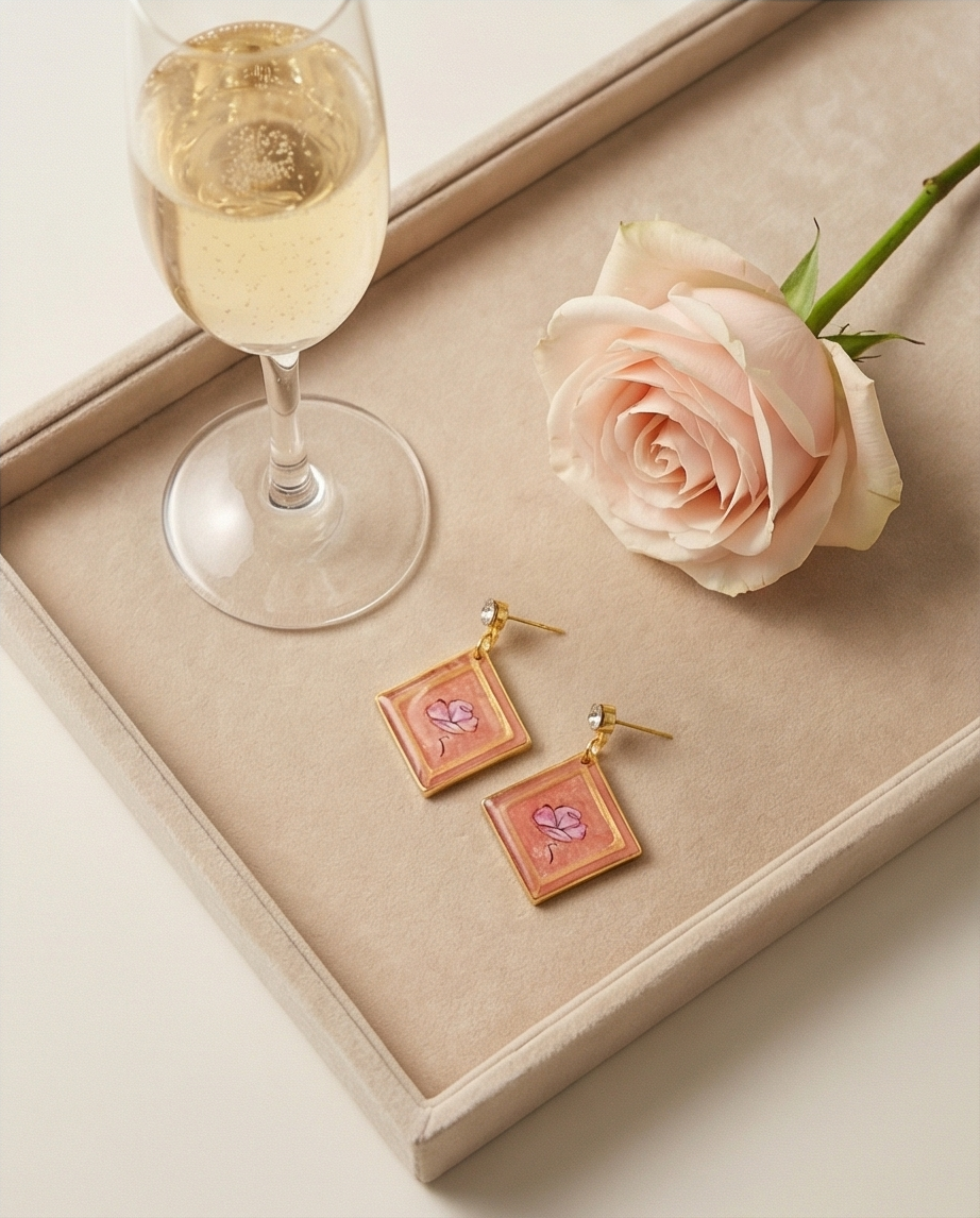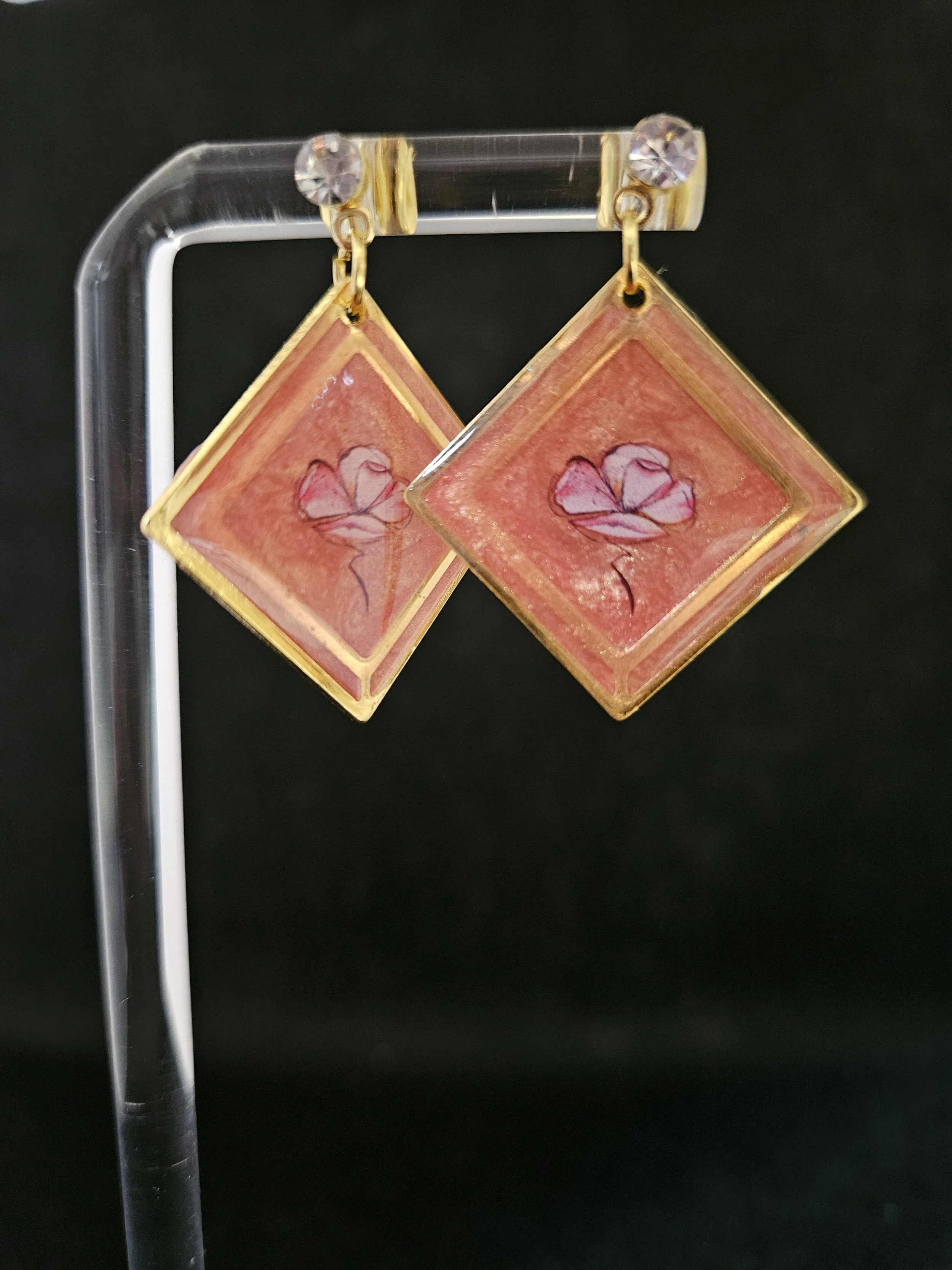 Elevate your jewellery collection with these exquisite sketched floral geometric earrings, designed for those who adore artistry in every detail. Each earring features a diamond‑shaped pendant framed in elegant gold, showcasing a soft pink enamel background adorned with a delicate, sketched flower motif. A sparkling gemstone stud adds a touch of refined brilliance, while the lightweight, curved connector ensures comfortable all‑day wear.