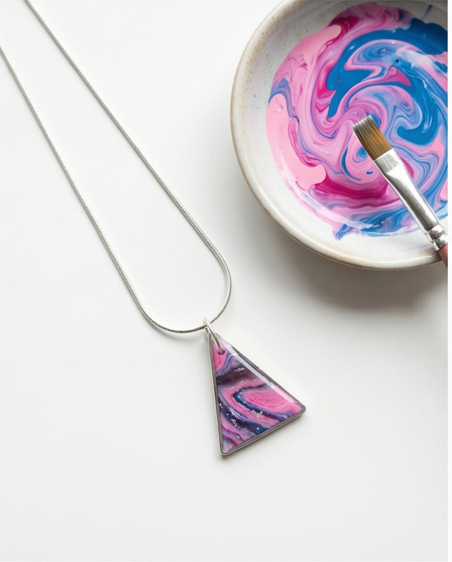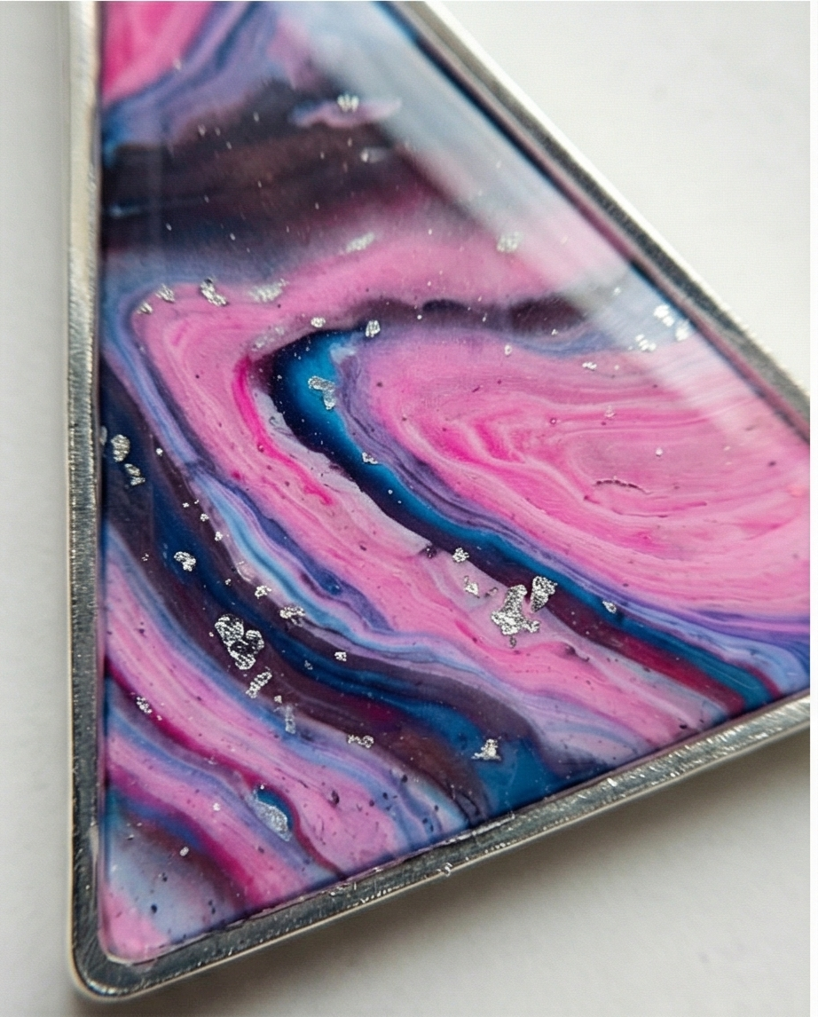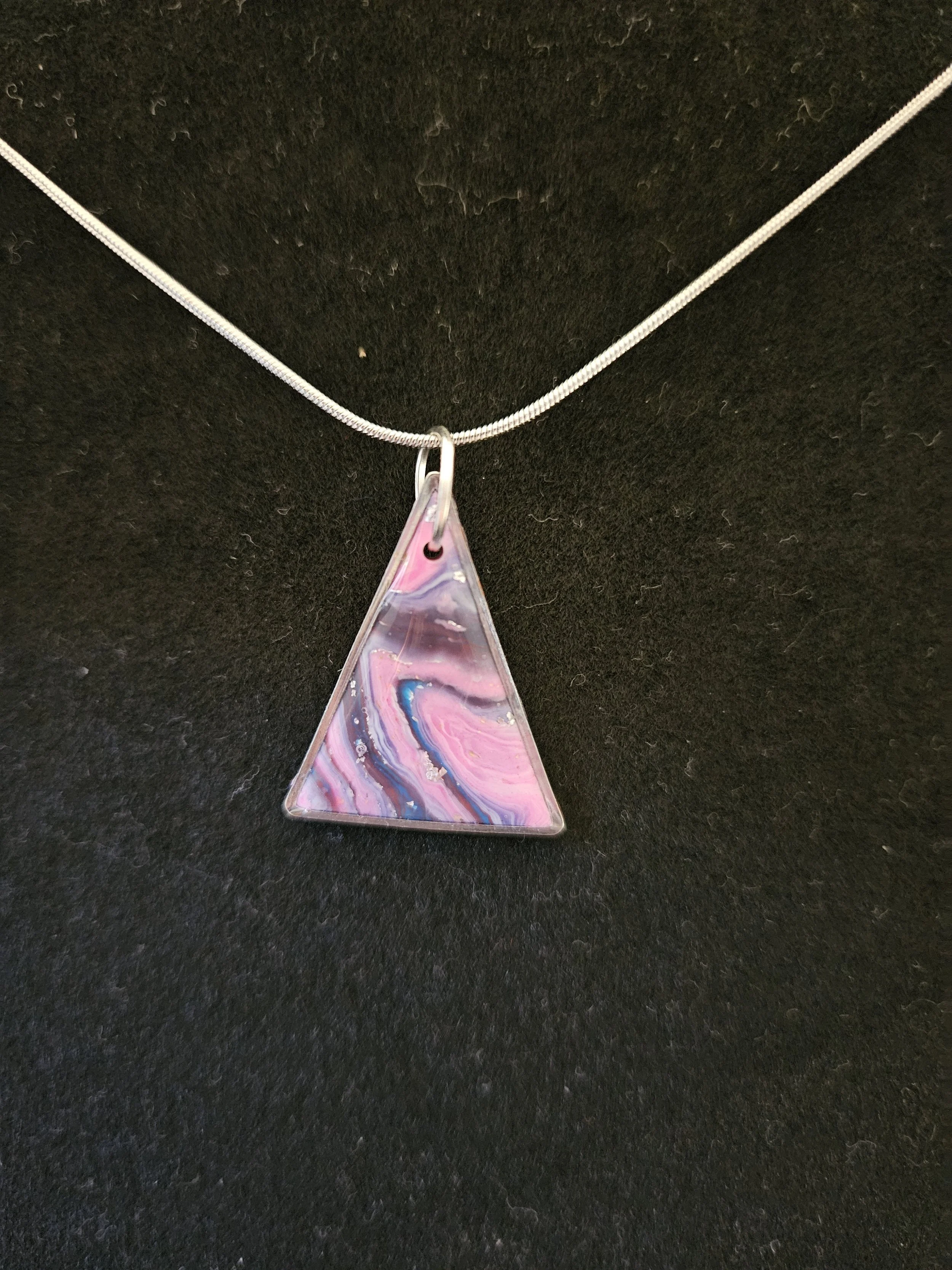 Step into a world of colour and cosmic artistry with this Cosmic Aurora Triangle Pendant Necklace, a handcrafted statement piece designed to captivate. Each pendant is created using fluid‑art resin techniques, forming swirling galaxies of pink, purple, blue, and soft white, accented with shimmering metallic flecks that catch the light beautifully. No two pendants are ever the same—your necklace is a one‑of‑a‑kind miniature artwork.