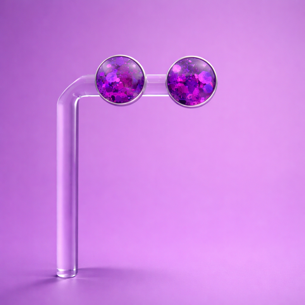 Round resin studs with vibrant purple glitter