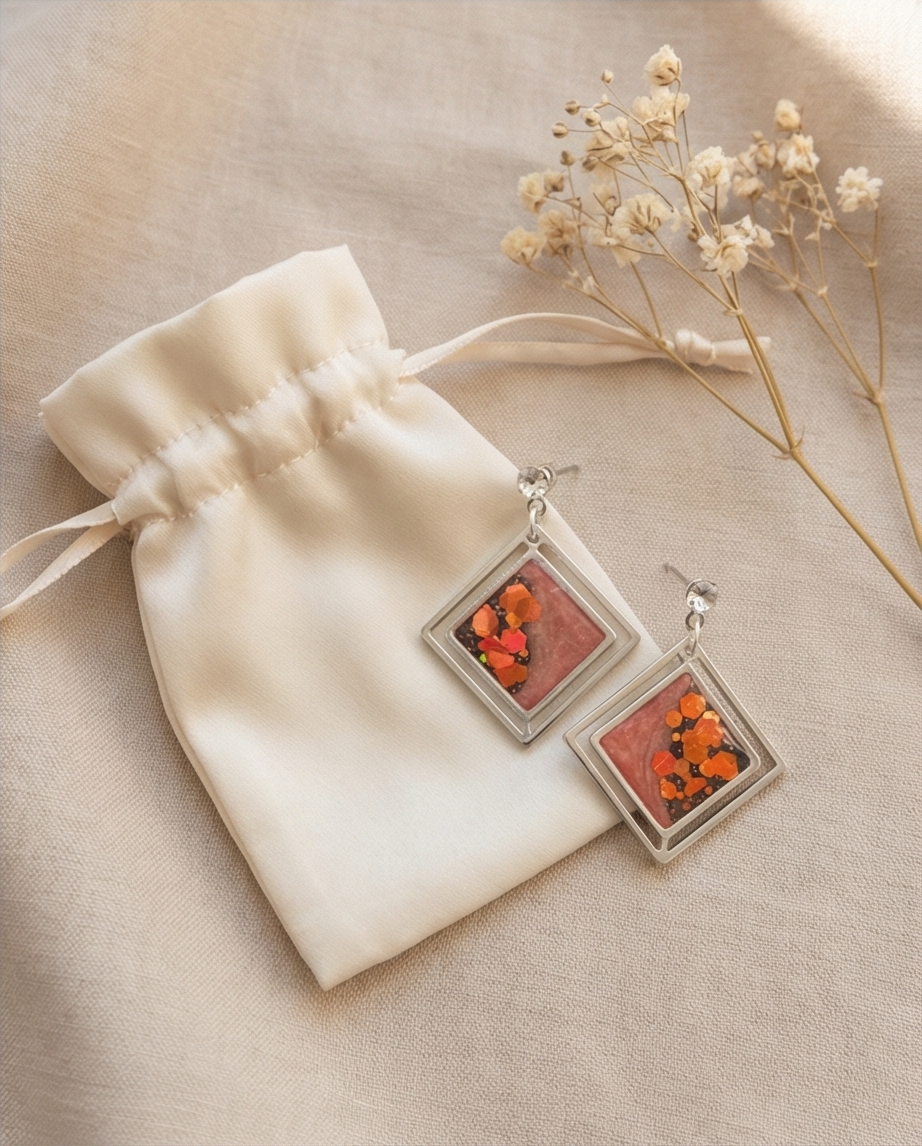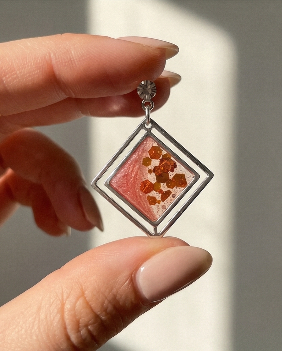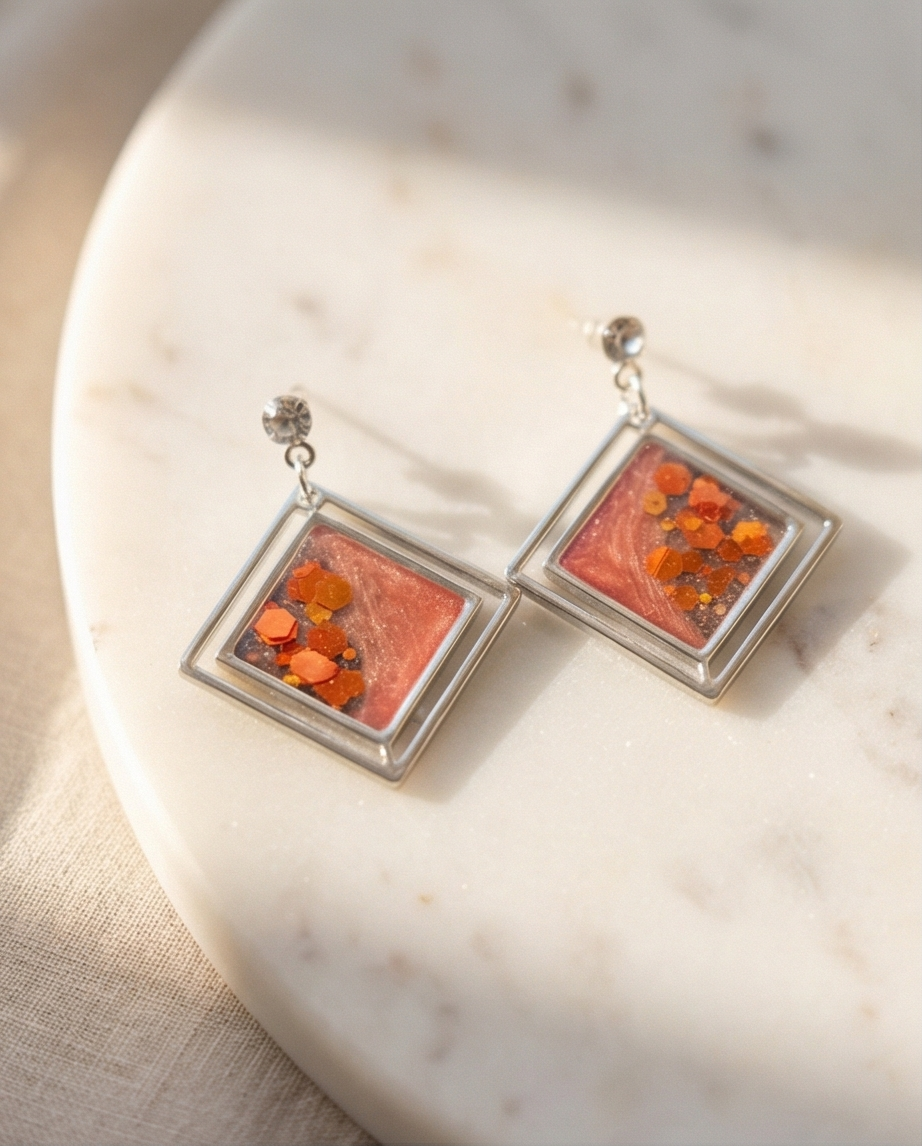 Like tiny captured sunsets framed in silver, these earrings glow with a warm, ember-like charm. Each geometric drop features a square resin panel infused with vibrant flecks of burnt orange, copper, and hints of golden shimmer, creating a molten, almost cosmic effect that shifts subtly with the light.