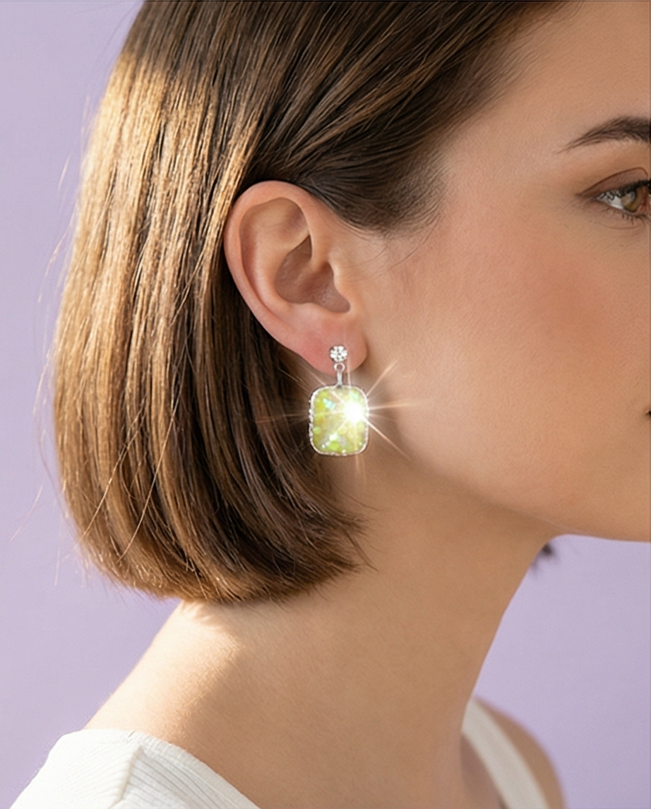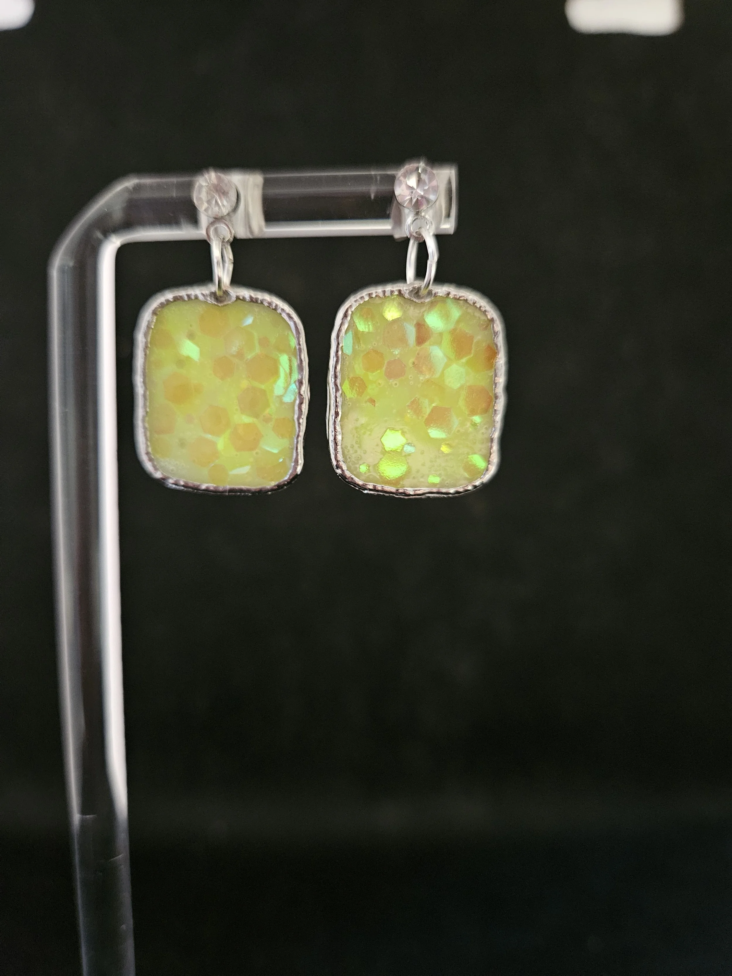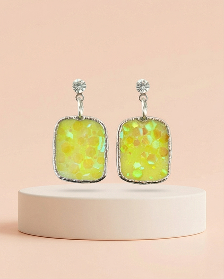 Capture a little bottled sunshine. These luminous drop earrings shimmer like crushed opal caught in golden hour. Set in sleek silver-toned frames, each piece features a dreamy blend of translucent yellow resin flecked with iridescent hexagonal sparkles that shift between lime, gold, and soft green as they catch the light.