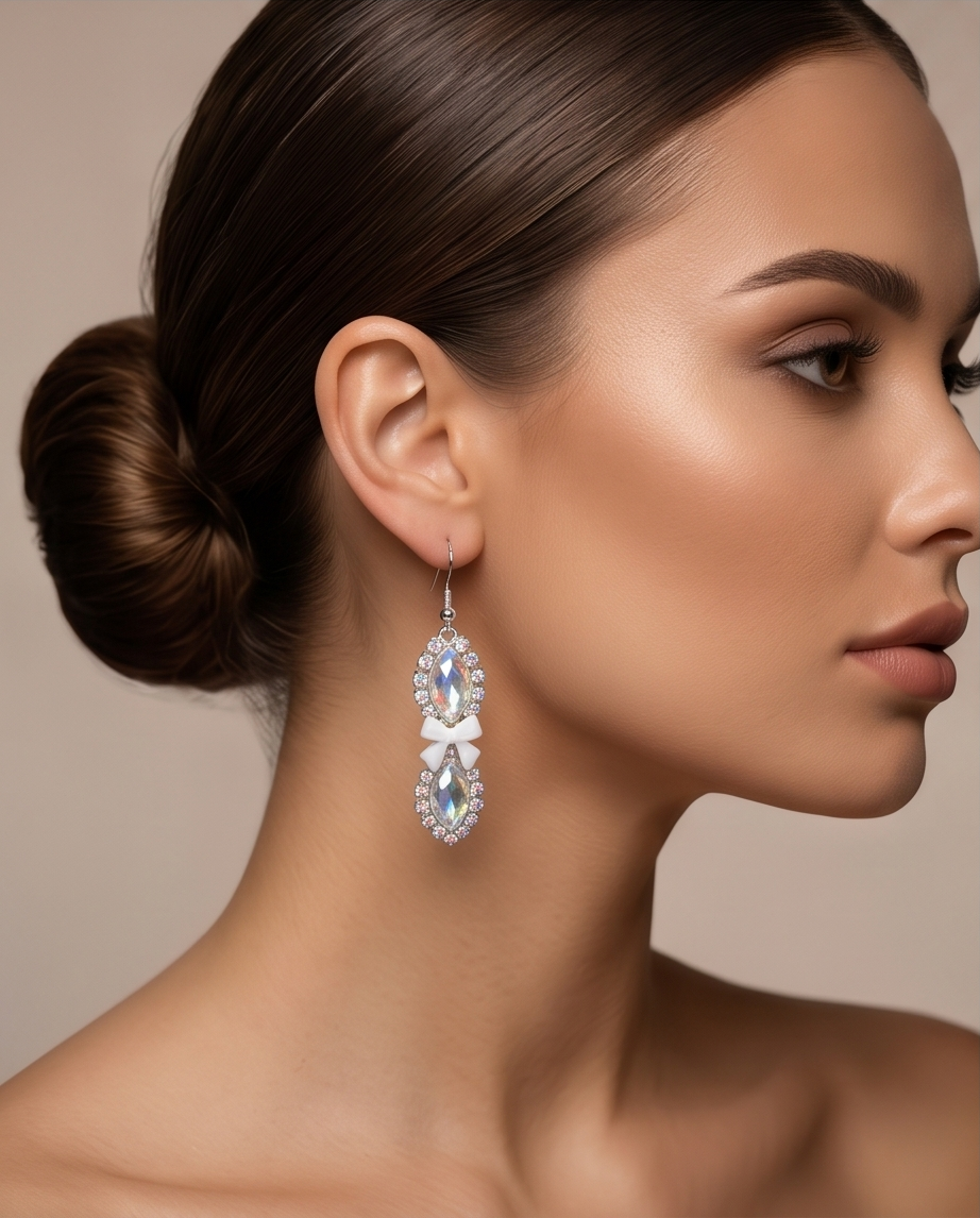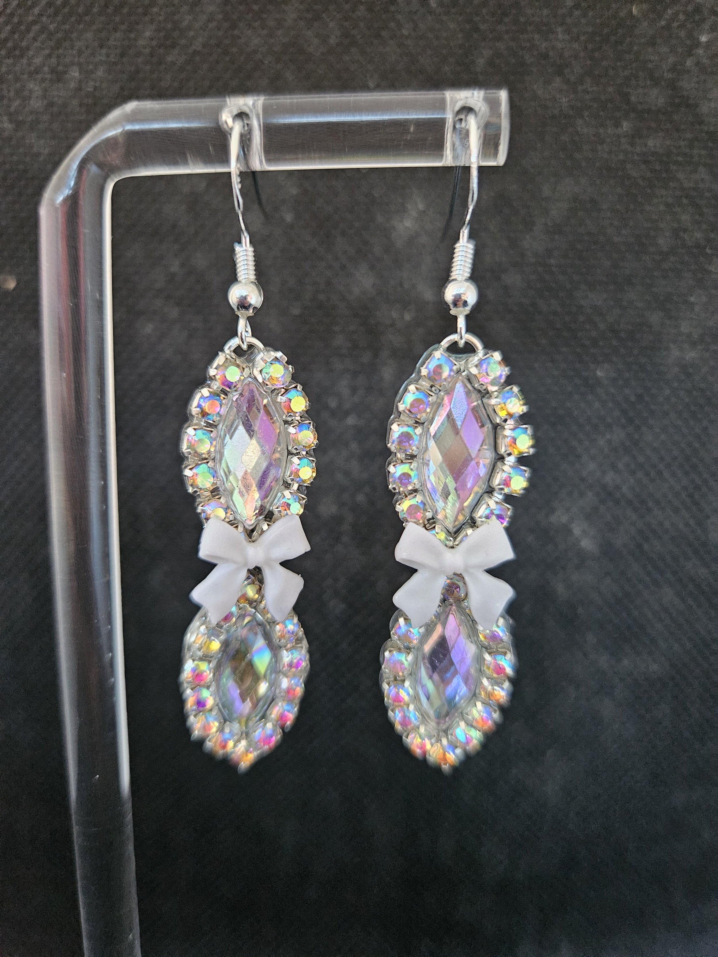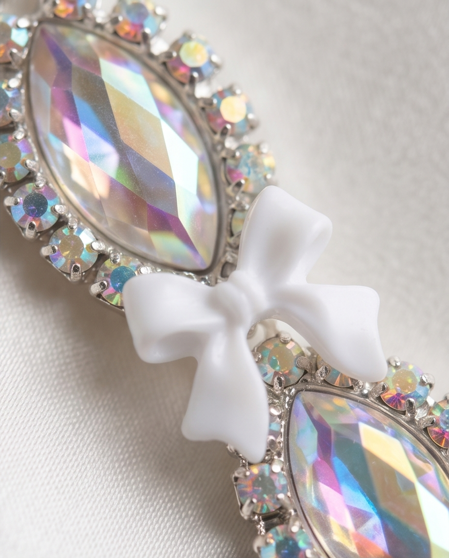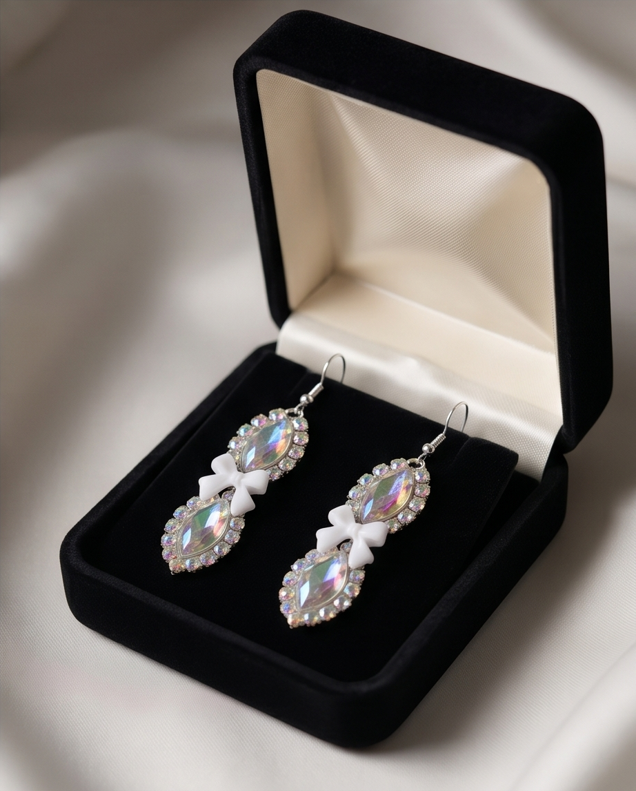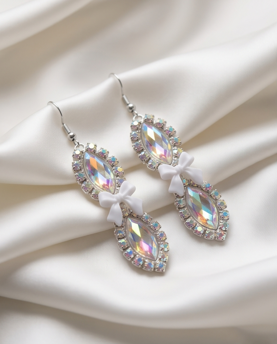 Shimmering, feminine, and full of whimsical charm, these iridescent gem bow dangle earrings are made to stand out. Each earring features a faceted oval centrepiece that catches the light in rainbow hues, framed by a border of multicoloured rhinestones for extra sparkle. At the heart of the design sits a delicate white bow, adding a sweet, elegant touch that softens the bold shine.