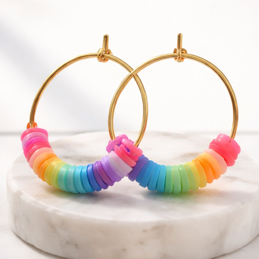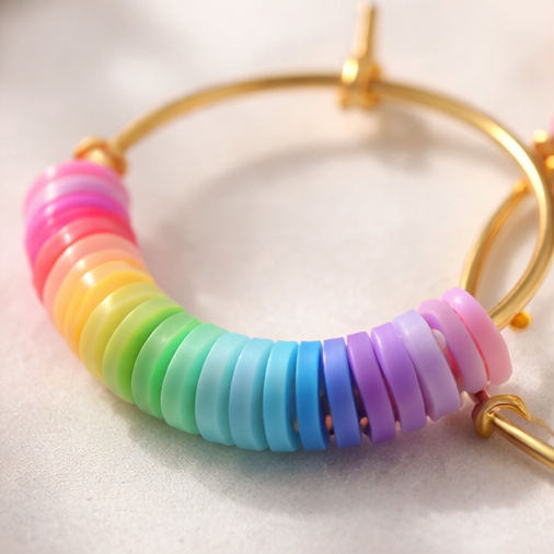 Bring a burst of colour to your day with these handmade rainbow bead hoop earrings, designed to brighten any outfit with their playful, feel‑good energy. Each gold‑tone hoop is threaded with a smooth gradient of multicoloured flat beads, transitioning through pink, orange, yellow, green, blue, and purple for a perfect rainbow arc.