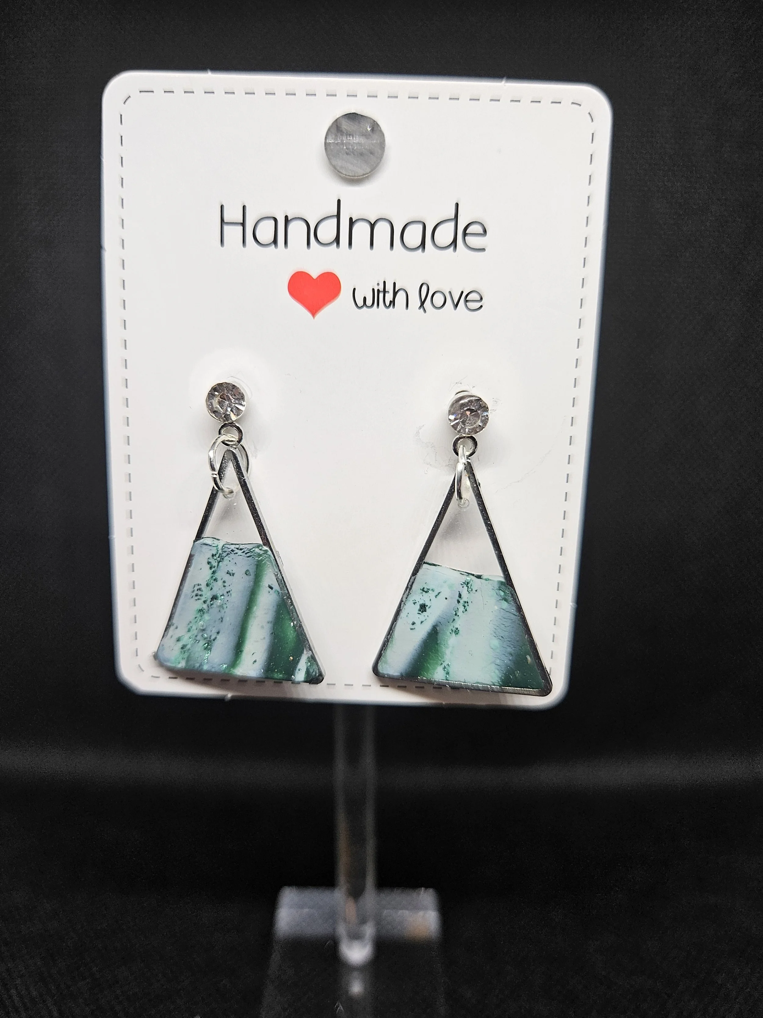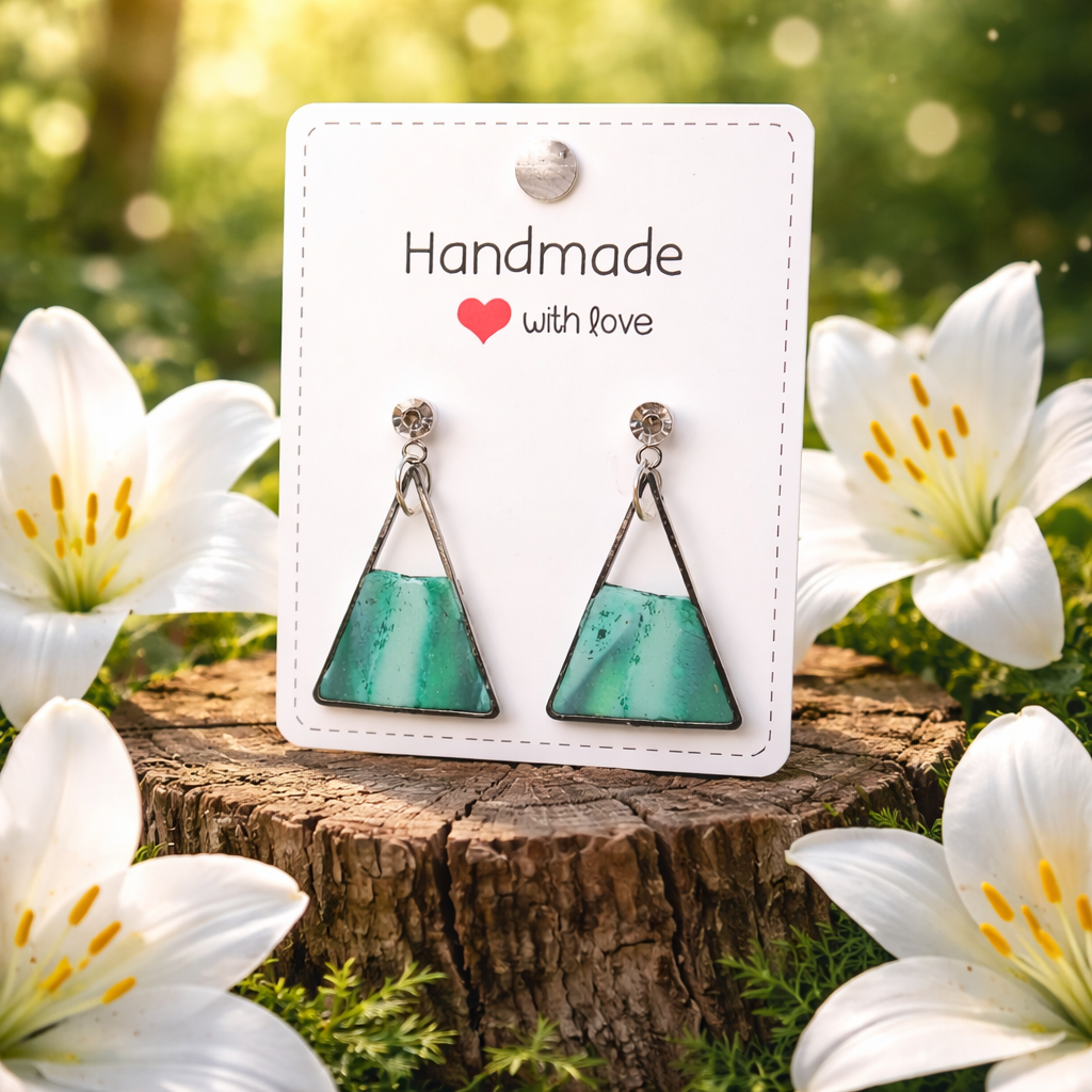 These handmade triangular earrings pair a modern geometric shape with a soothing, nature‑inspired colour palette. Each piece features a silver‑toned frame filled with a green and turquoise marbled centre, giving the resin a gemstone‑like depth that shifts beautifully in the light. The frosted finish adds a soft glow, while the subtle speckling creates a natural, organic feel reminiscent of sea glass or polished stone.