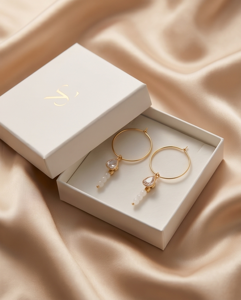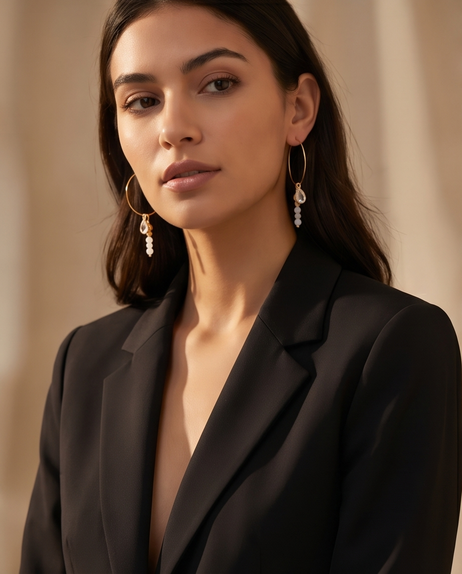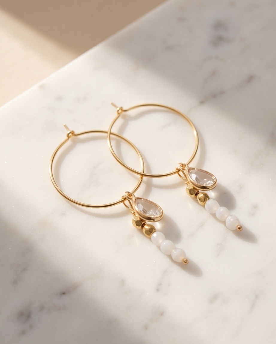 - Gold‑tone hoops with delicate white bead dangles