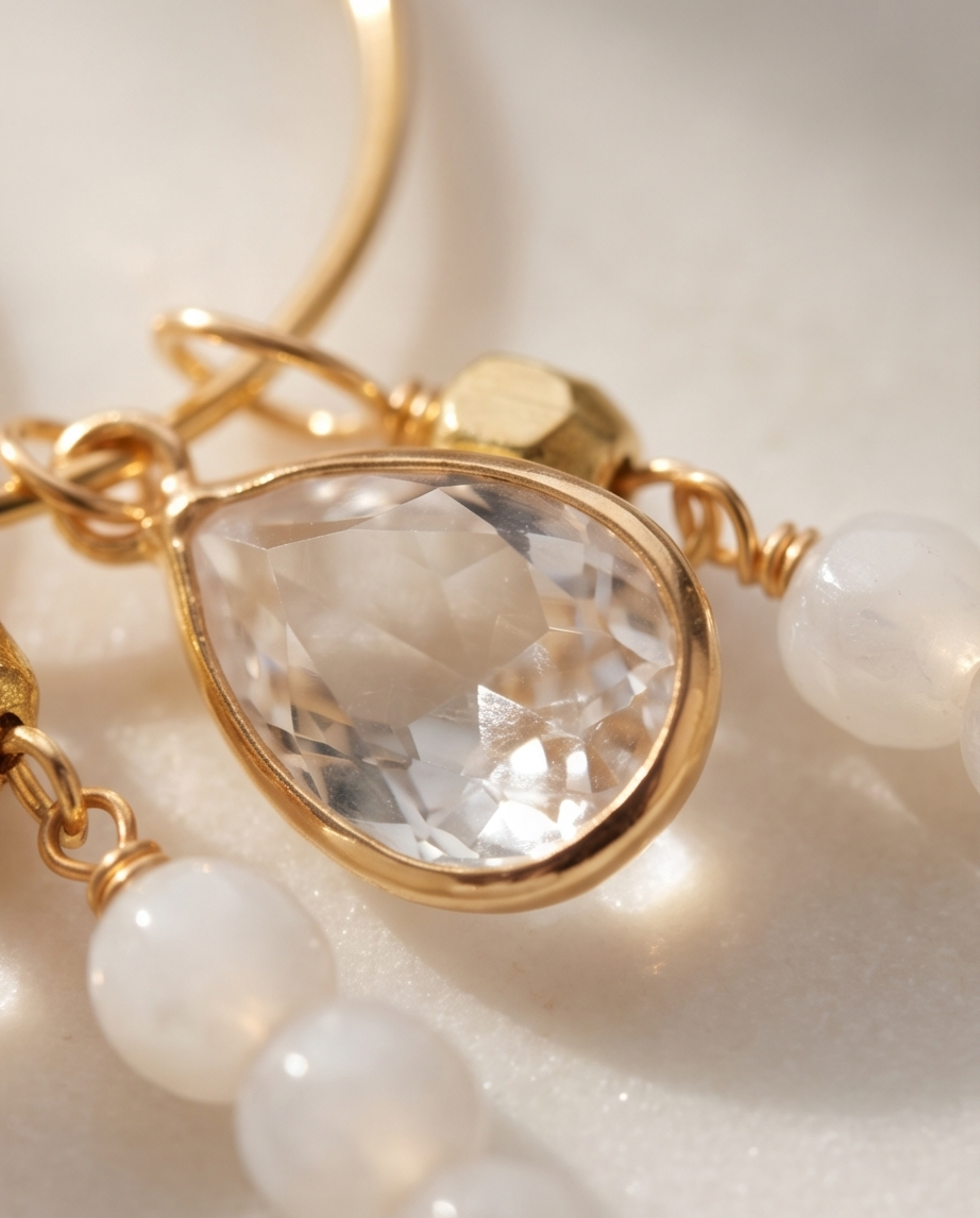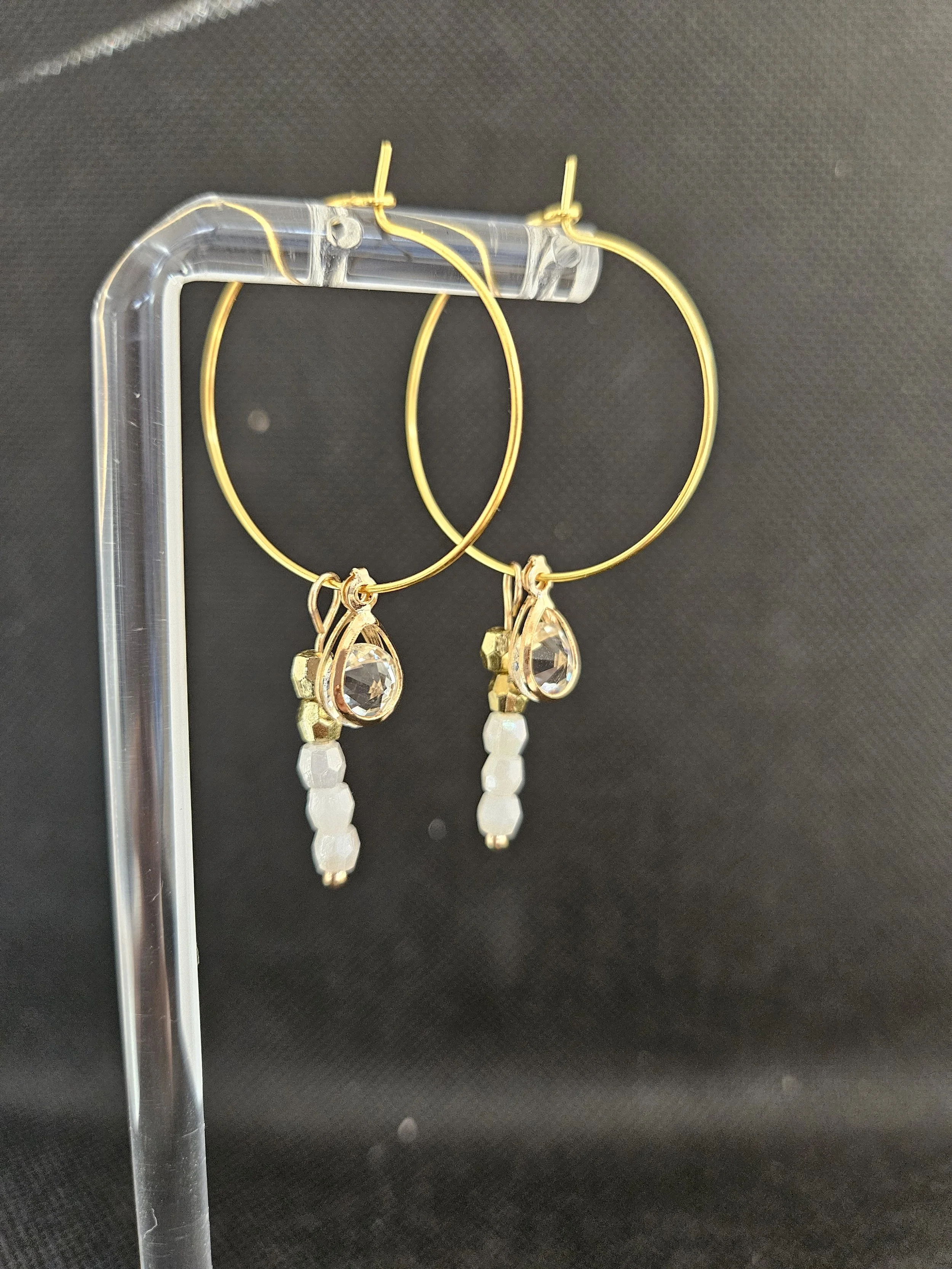 Elevate your everyday style with these handmade gold hoop earrings, featuring a sparkling clear faceted gemstone paired with a trio of smooth white beads for a soft, refined finish. The teardrop crystal catches the light beautifully, while the gold‑tone setting adds warmth and timeless elegance.