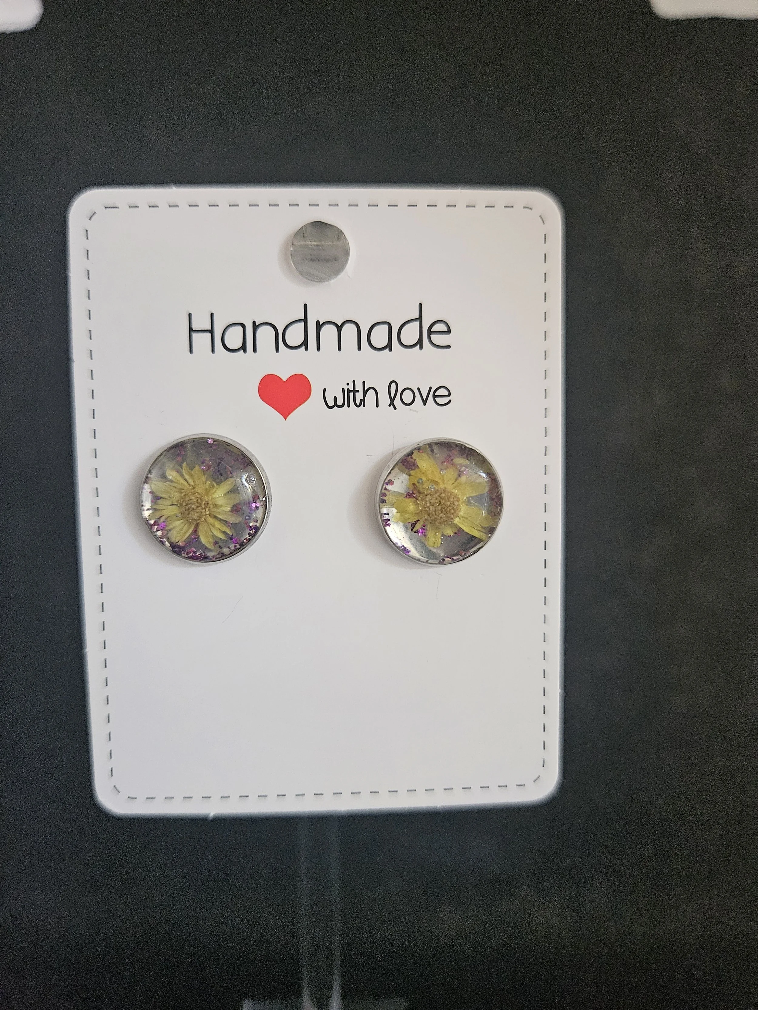 These handcrafted studs showcase a real yellow blossom preserved beneath a crystal‑clear resin dome, framed with soft purple accents that add depth and gentle contrast. The flowers sit suspended as if floating in morning light, giving each earring a delicate, botanical glow. Their rounded shape and smooth finish make them comfortable for everyday wear, while the natural florals bring a touch of quiet elegance to any outfit.