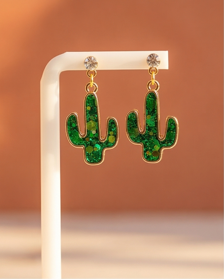 Bring a little desert magic to your day with these handmade glitter cactus earrings, bursting with personality and sparkle. Each cactus charm is filled with vibrant green glitter, sealed in a glossy resin finish, and outlined in warm gold for a polished, eye‑catching look. The design hangs from a shimmering rhinestone stud, adding a touch of glam that makes these earrings perfect for both everyday wear and standout styling.