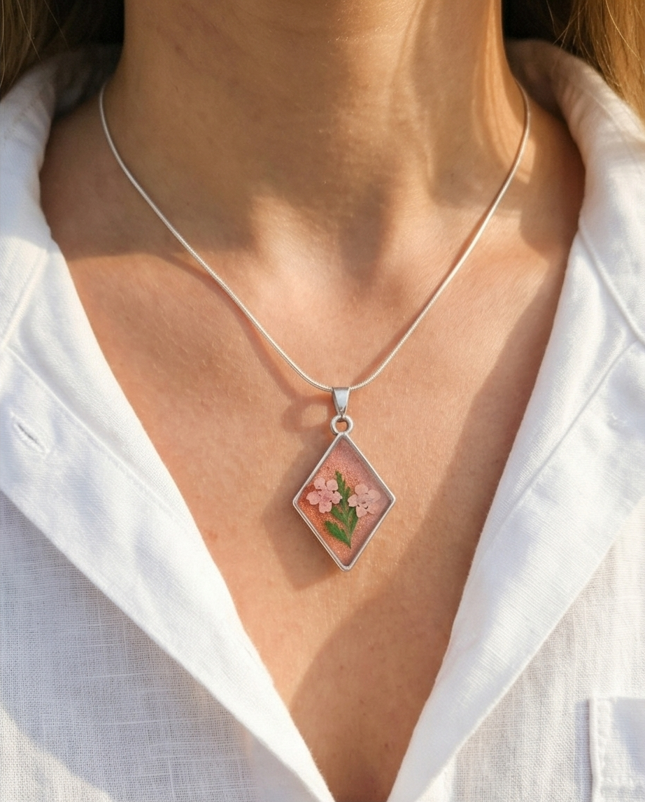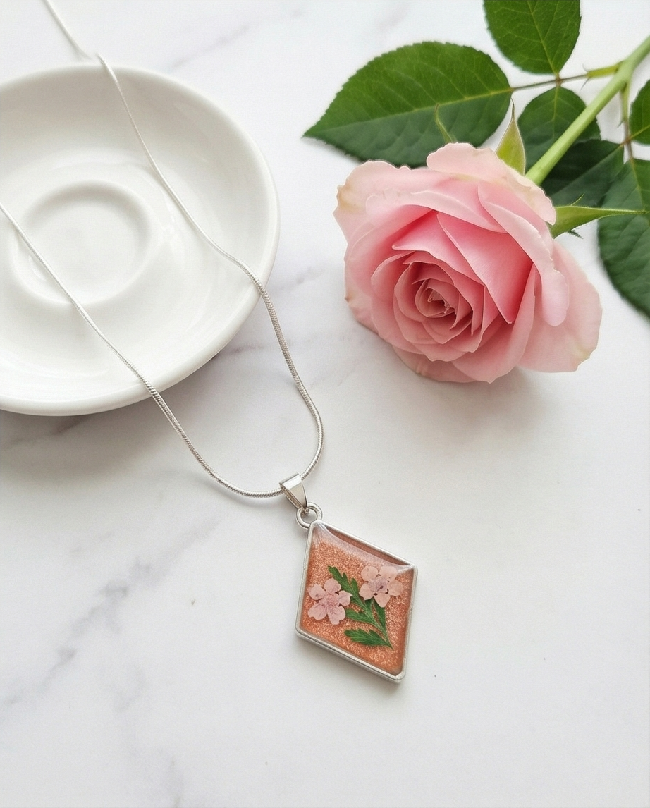 Carry a touch of nature with you wherever you go. This handmade pressed‑flower pendant necklace features two delicate pink blossoms and soft green leaves, preserved forever within a shimmering peach backdrop. Set inside a sleek diamond‑shaped silver frame, the design feels both modern and romantic — a tiny botanical artwork you can wear every day.