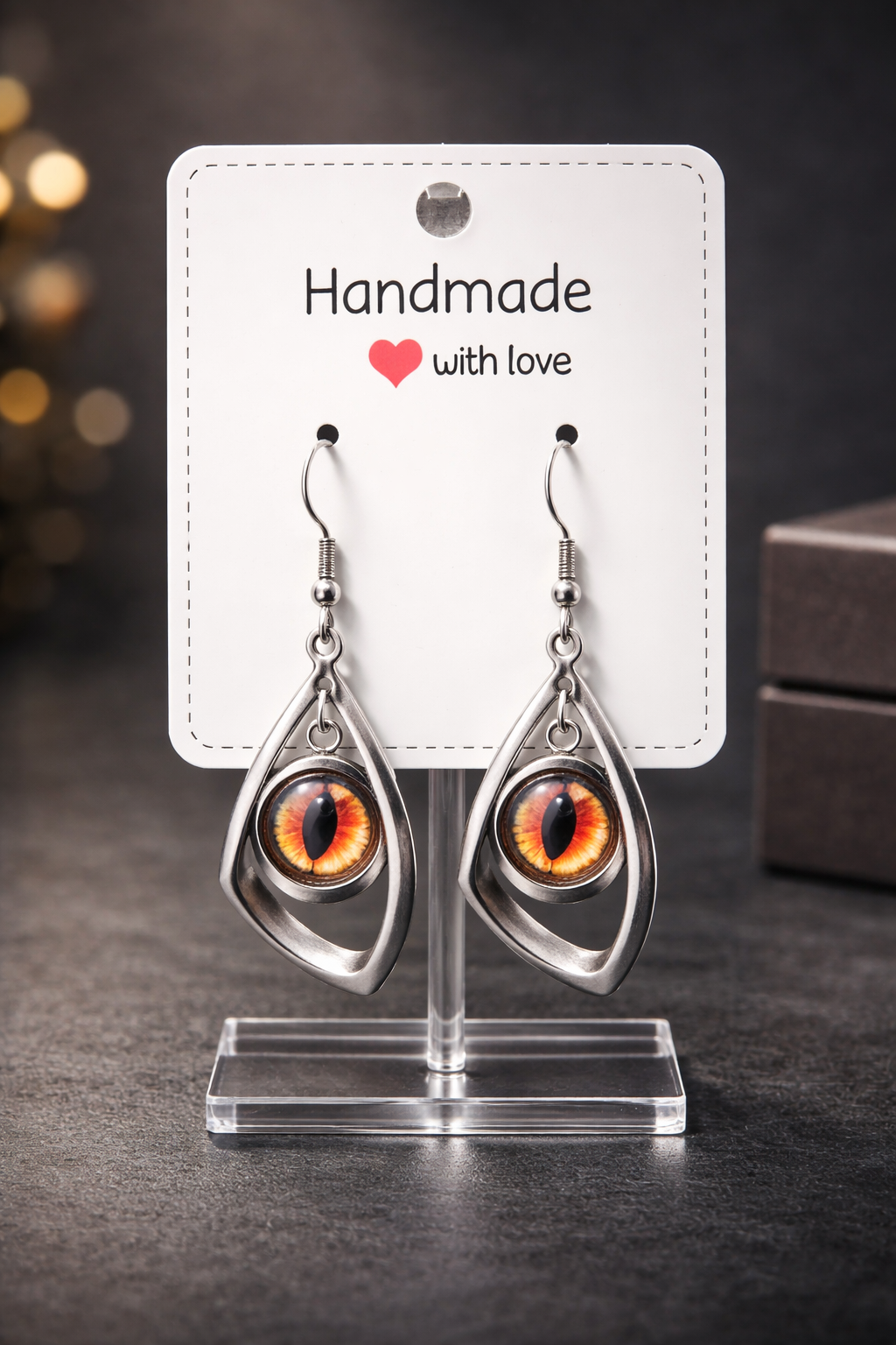 These handmade earrings feature a gold‑toned teardrop frame encasing a vivid circular centre that resembles a fiery creature’s eye. The iris glows in intense shades of orange and red, with a sharp vertical pupil that gives the design its unmistakable “dragon eye” character. The colours shift subtly as the light moves, creating a hypnotic, molten effect. The gold hooks add warmth and balance, making the earrings feel both striking and wearable.