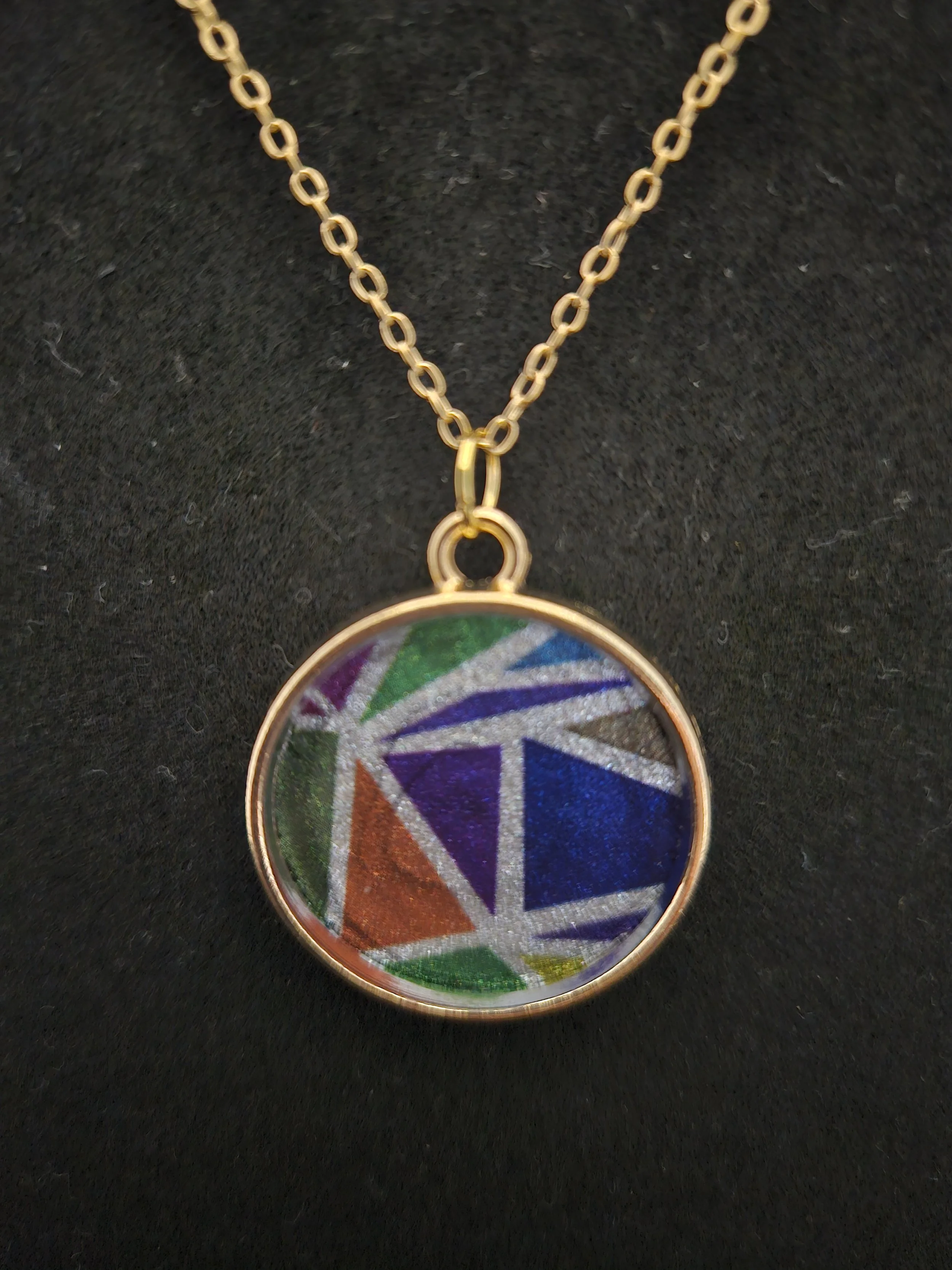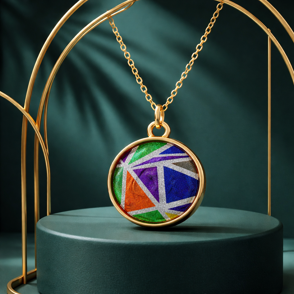 This necklace features a round pendant filled with a mosaic of colourful geometric shapes—cool blues, vivid purples, warm oranges, fresh greens, and shimmering silver. Each segment is outlined with fine metallic lines, creating a stained‑glass effect that shifts beautifully as it catches the light. The gold frame and chain add warmth and elegance, giving the piece a polished, contemporary finish. Its bold palette and clean geometry make it a standout accessory that pairs effortlessly with both minimalist outfits and more expressive styles.