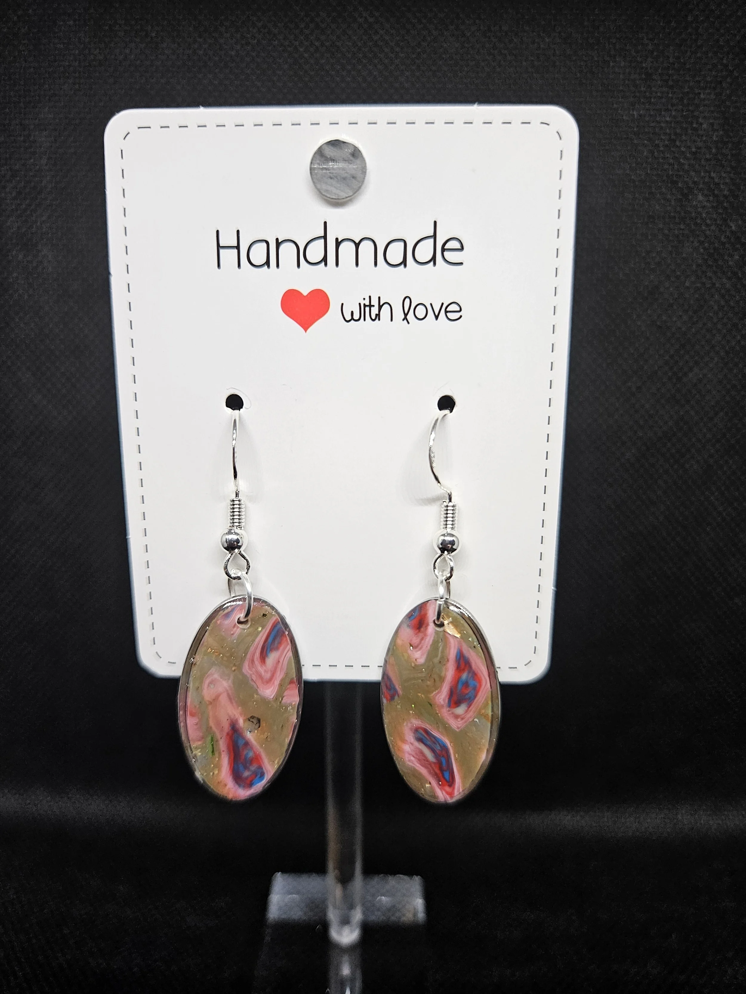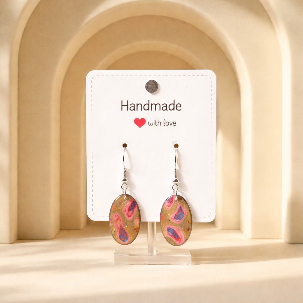 These handmade oval earrings bring a burst of colour and creativity to any outfit. Each piece features a glossy abstract swirl of pink, blue, and soft beige tones, creating a lively painterly effect that feels playful yet elegant. The smooth finish enhances the colours beautifully, giving the design depth and a subtle shimmer.