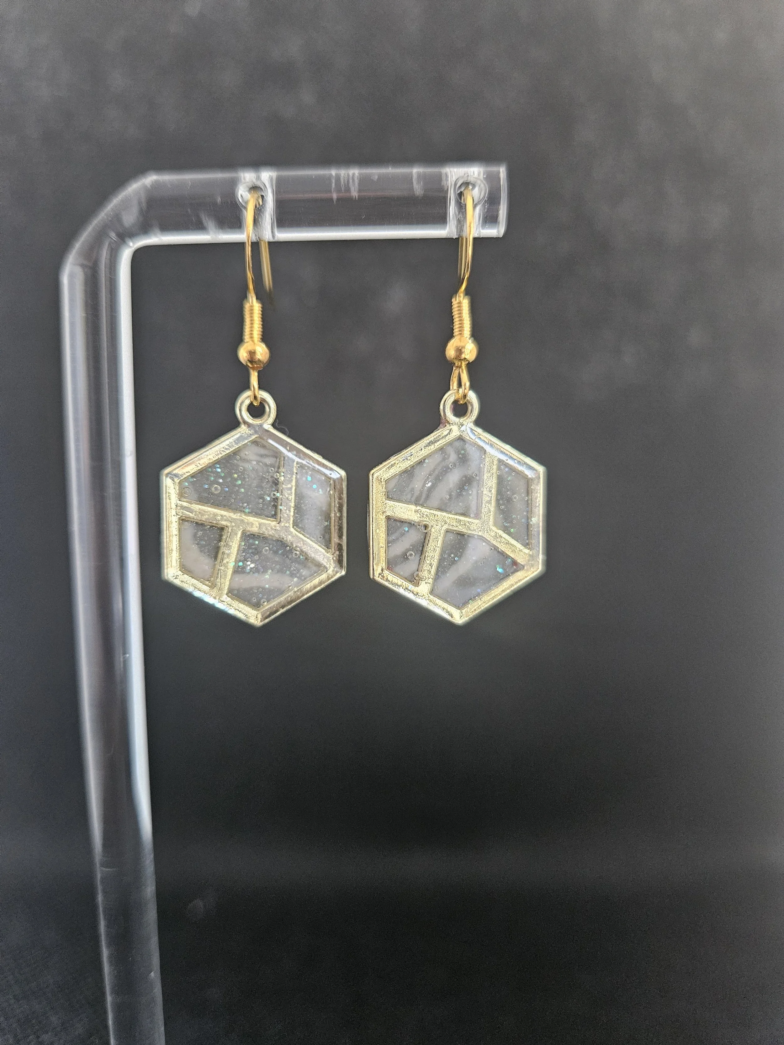 These earrings bring a modern, architectural elegance to your look, blending clean geometry with a soft, luminous shimmer. Each hexagon is framed in warm gold, with marbled clay and resin panels divided into crisp geometric segments that catch the light with every movement. The result is a piece that feels both contemporary and timeless—perfect for anyone who loves jewellery with structure, sparkle, and a touch of sophistication.