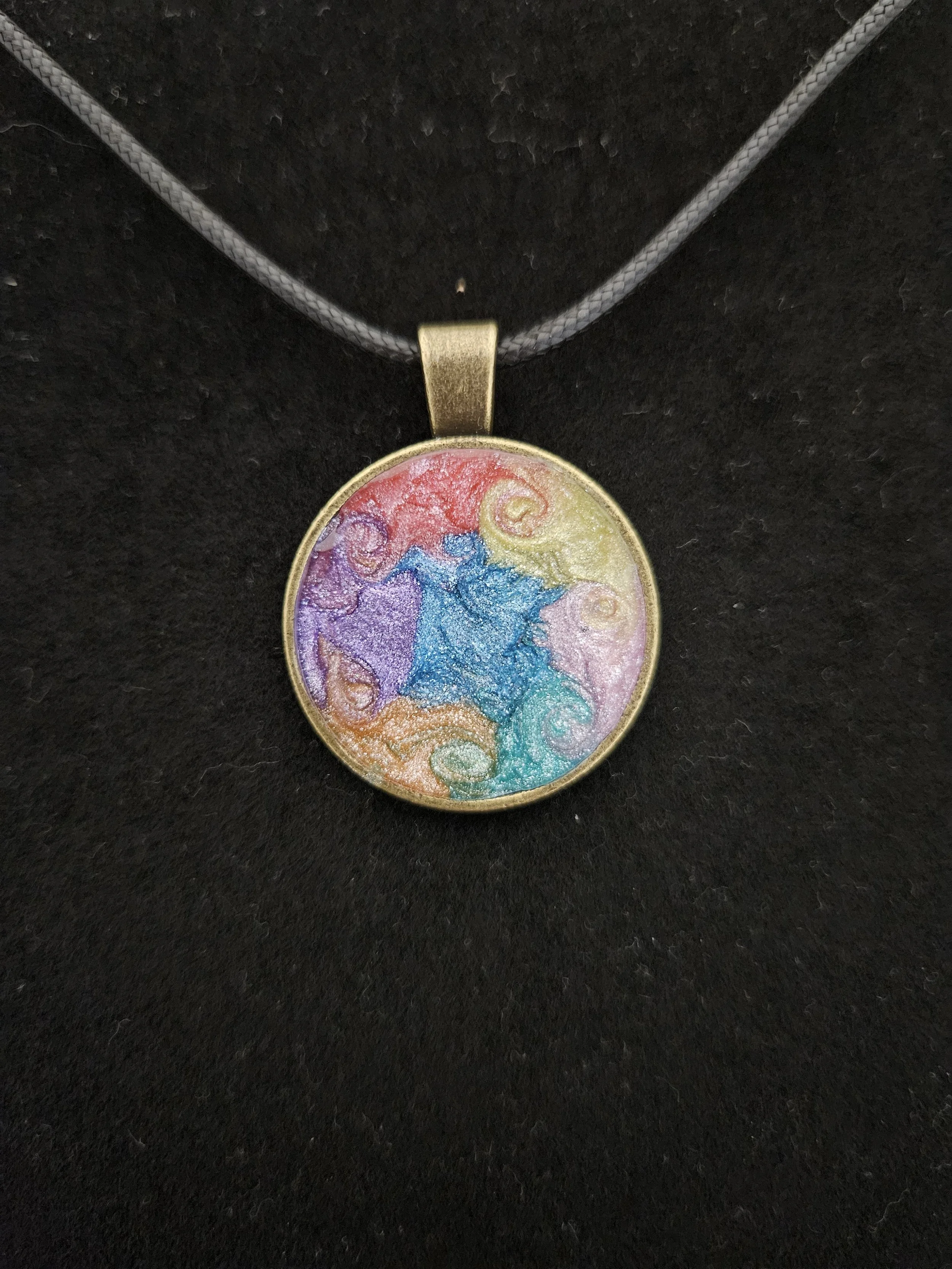 Brighten any outfit with this Rainbow Swirl Pendant Necklace, a handcrafted piece bursting with colour, texture, and artistic charm. The round pendant features a vibrant swirl of blues, purples, pinks, oranges, yellows, and greens — each shade blending seamlessly into the next to create a mesmerising, painterly effect.